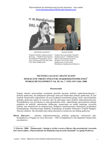 Wprowadzenie do feministycznej krytyki ekonomii – kurs online www.ekologiasztuka.pl/think.tank.feministyczny NILÜFER ÇAGATAY* DIANE ELSON Program Narodów Zjednoczonych Rozwoju - UNDP (United Nations Development Programme), Nowy Jork i Uniwersytet Utah, Salt Lake City, Stany Zjednoczone Fundusz Rozwoju Kobiet Narodów Zjednoczonych - UNIFEM (United Nations Development Fund for Women), Nowy Jork, Stany Zjednoczone i Uniwersytet Manchester, Zjednoczone Królestwo NILÜFER ÇAGATAY i DIANE ELSON 1 SPOŁECZNE TREŚCI POLITYKI MAKROEKONOMICZNEJ WORLD DEVELOPMENT Vol. 28. No. 7. STR 1347-1364. 2000 Streszczenie Istnieje obecnie powszechnie rozumiana potrzeba łączenia polityki makroekonomicznej i polityki społecznej, ale podejściem głównego nurtu jest dodawanie polityki społecznej. W tym artykule dostarczamy argumentów na rzecz podejścia transformacyjnego, które wprowadziłoby politykę społeczną opartą na równości płci do głównego nurtu polityki makroekonomicznej. Wyodrębniamy trzy powiązane ze sobą uprzedzenia, które udaremniają wprowadzenie takiego podejścia do polityki: uprzedzenie deflacyjne, nastawienie na model męskiego żywiciela rodziny oraz nastawienie na marketyzację. Podejście transformacyjne ilustrujemy przykładem Kanadyjskiego Alternatywnego Budżetu Federalnego (Canadian Alternative Federal Budget). Naszym zdaniem dla sformułowania takiej alternatywy konieczny jest dialog społeczny. Słowa kluczowe – polityka makroekonomiczna, polityka społeczna, nierówność płci, Kompleksowy Program na rzecz Rozwoju – CDF (Comprehensive Development Framework), uczestnictwo. 1 © Elsevier 2000. Tłumaczenie i dostęp w trybie e-reserve library dla uczestniczek i uczestników kursu online „Wprowadzenie do feministycznej krytyki ekonomii” za zgodą Wydawcy. Çagatay i Elson, Społeczne treści polityki makroekonomicznej... 1 Wprowadzenie do feministycznej krytyki ekonomii – kurs online www.ekologiasztuka.pl/think.tank.feministyczny 1. WPROWADZENIE Jednym z dominujących zjawisk ostatnich dekad XX wieku jest rosnące tempo i wpływ globalizacji. Pomimo wielu korzyści wynikających z tego procesu, w niektórych regionach globalizacja nasiliła wykluczenie społeczne i marginalizację ludzi ubogich oraz innych grup. Społeczne przesunięcie, które spowodował kryzys wschodnioazjatycki, pobudziło zainteresowanie tzw. „kwestiami społecznymi”, „społecznymi konsekwencjami kryzysu gospodarczego” oraz „zasadami polityki społecznej” w sposób, który nie był częścią politycznego dyskursu od czasu krytyki programów strukturalnego dostosowania i stabilizacji makroekonomicznej, szeroko podejmowanych we wczesnych latach osiemdziesiątych. „Kwestie społeczne” takie jak standardy pracy, redukcja ubóstwa, ochrona środowiska naturalnego stały się częścią politycznych dialogów o makroekonomii, polityce handlowej oraz redukcji zadłużenia państwowego2. Chociaż istnieje obecnie powszechnie rozumiana potrzeba łączenia zarządzania makroekonomicznego i polityki społecznej, wciąż pojmuje się to jako kontynuację „zdrowej” polityki makroekonomicznej z naciskiem na kryteria rynkowe, nadrzędne znaczenie stabilizacji poziomu cen i redukcji roli państwa, a następnie dodanie polityki społecznej po to, by osiągnąć społecznie pożądane rezultaty takie jak redukcja ubóstwa3. Alternatywne podejście w rozważaniach na temat polityki społecznej, [odmienne niż traktowanie jej] jako dodatku do polityki makroekonomicznej, rozpoczęłoby się od założenia, że każda polityka makroekonomiczna jest rozgrywana w ramach określonego układu relacji podziału i struktur instytucjonalnych; oraz, że każda polityka makroekonomiczna pociąga za sobą różne rezultaty społeczne, które muszą być przedstawione jasno i wyraźnie. Zgodnie z takim poglądem „zdrowie” polityki 2 Kompleksowy Program na rzecz Rozwoju (CDF) Banku Światowego jest jedną z prób łączenia „polityki społecznej” z makroekonomią. 3 Społecznie pożądane rezultaty odzwierciedlają cele sprawiedliwości społecznej. Międzynarodowe porozumienie w sprawie szeroko rozumianych reguł społecznej sprawiedliwości jest zawarty w Deklaracjach, Konwencjach i Konwentach Praw Człowieka oraz porozumieniach osiągniętych na konferencjach ONZ w latach dziewięćdziesiątych, zwłaszcza Czwartej Światowej Konferencji w sprawie Kobiet oraz Światowym Szczycie na rzecz Rozwoju Społecznego. Na konferencjach ONZ w latach dziewięćdziesiątych szczegółowo opracowano niniejsze reguły w kontekście podejść bazujących na prawach i ustalono konsensus w sprawie celów takich jak likwidacja ubóstwa, nierówności płci lub innych nierówności społecznych, ochrony i regeneracji środowiska naturalnego oraz bezpieczeństwa żywności. W tym kontekście, ubóstwo jest postrzegane jako odmawianie praw człowieka, tak jak nierówność płci. Çagatay i Elson, Społeczne treści polityki makroekonomicznej... 2 Wprowadzenie do feministycznej krytyki ekonomii – kurs online www.ekologiasztuka.pl/think.tank.feministyczny makroekonomicznej nie byłoby oceniane na podstawie kryteriów rynkowych jako takich, ale czy w ostatecznym rozrachunku udaje jej się zbliżyć społeczeństwa do osiągania sprawiedliwości społecznej. Zatem społecznie pożądane rezultaty takie jak sprawiedliwość podziału, równość, zaspokajanie potrzeb wszystkich obywateli, społeczeństwo wolne od ubóstwa i dyskryminacji, zabezpieczenie [podstawowych] potrzeb dla wszystkich, rozwój ludzkich możliwości, stają się ostatecznymi celami polityki, w tym polityki makroekonomicznej4. Pierwsze podejście nazywamy „dodaniem polityki społecznej”, a drugie – „podejściem transformacyjnym” do makroekonomii. Różnica pomiędzy nimi polega na tym, że „podejście transformacyjne” zakłada włączenie polityki społecznej do analizy makroekonomicznej poprzez przemyślenie jej zało