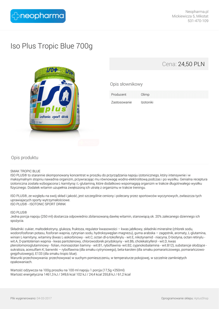 Neopharma.pl Mickiewicza 5, Mikstat 531-470-109 Iso Plus Tropic Blue 700g Cena: 24,50 PLN Opis słownikowy Producent Olimp Zastosowanie Izotoniki Opis produktu SMAK TROPIC BLUE ISO PLUS® to starannie skomponowany koncentrat w proszku do przyrządzania napoju izotonicznego, który intensywnie i w maksymalnym stopniu nawadnia organizm, przywracając mu równowagę wodno-elektrolitową podczas i po wysiłku. Genialna receptura izotoniczna została wzbogacona L-karnityną i L-glutaminą, które dodatkowo wspomagają organizm w trakcie długotrwałego wysiłku fizycznego. Dodatek witamin uzupełnia zwiększoną ich utratę z organizmu w trakcie treningu. ISO PLUS®, ze względu na swój skład i jakość, jest szczególnie ceniony i polecany przez sportowców wyczynowych, zwłaszcza tych uprawiajacych sporty wytrzymałościowe. ISO PLUS® - ISOTONIC SPORT DRINK ISO PLUS® Jedna porcja napoju (250 ml) dostarcza odpowiednio zbilansowaną dawkę witamin, stanowiącą ok. 20% zalecanego dziennego ich spożycia. Składniki: cukier, maltodekstryny, glukoza, fruktoza, regulator kwasowości – kwas jabłkowy, składniki mineralne (chlorek sodu, wodorofosforan potasu, fosforan wapnia, cytrynian sodu, hydroksywęglan magnezu), guma arabska – zagęstnik, aromaty, L-glutamina, winian L-karnityny, witaminy (kwas L-askorbinowy - wit.C, octan dl-α-tokoferylu - wit.E, nikotynamid - niacyna, D-biotyna, octan retinylu wit.A, D-pantotenian wapnia - kwas pantotenowy, chlorowodorek pirydoksyny - wit.B6, cholekalcyferol - wit.D, kwas pteroilomonoglutaminowy - folian, monoazotan tiaminy - wit.B1, ryboflawina -wit.B2, cyjanokobalamina - wit.B12), substancje słodzące sukraloza, acesulfam K; barwniki – ryboflawina (dla smaku cytrynowego), beta-karoten (dla smaku pomarańczowego, pomarańczowogrejpfrutowego), E133 (dla smaku tropic blue). Warunki przechowywania: przechowywać w suchym pomieszczeniu, w temperaturze pokojowej, w szczelnie zamkniętych opakowaniach. Wartość odżywcza na 100g proszku na 100 ml napoju 1 porcja (17,5g +250ml) Wartość energetyczna 1461,3 kJ / 349,6 kcal 102 kJ / 24,4 kcal 255,8 kJ / 61,2 kcal Plik wygenerowano: 04-03-2017 Oprogramowanie sklepu: AptusShop Neopharma.pl Mickiewicza 5, Mikstat 531-470-109 Białko 0 g 0 g 0 g Węglowodany 87,4 g 6,1 g 15,3 g w tym cukry 70 g 4,9 g 12,2 g Tłuszcz 0 g 0 g 0 g w tym nasycone kwasy tłuszczowe 0 g 0 g 0 g Błonnik pokarmowy 0 g 0 g 0 g Sód 0,5 g 0 g 0,1 g L-glutamina 1100 mg 77 mg 192,5 mg L-karnityna 285 mg 20 mg 50 mg Witaminy i składniki mineralne 100 g proszku 100 ml napoju 1 porcja (17,5g + 250 m)l *RDA(1 porcja) Potas 490 mg 34,3 mg 85,7 mg 4,3% Wapń 143 mg 10 mg 25 mg 3,1% Magnez 72 mg 5 mg 12,6 mg 3,3% Witamina C 91,4 mg 6,4 mg 16 mg 20% Niacyna 18,3 mg 1,3 mg 3,2 mg 20% Witamina E 13,7 mg 1 mg 2,4 mg 20% Witamina A 914,3 µg 64 µg 160 µg 20% Kwas pantotenowy 6,8 mg 0,5 mg 1,2 mg 20% Witamina D 5,7 µg 0,4 µg 1 µg 20% Witamina B6 1,7 mg 0,1 mg 0,3 mg 20% Tiamina B1 1,1 mg 0,1 mg 0,2 mg 20% Ryboflawina B2 1,7 mg 0,1 mg 0,3 mg 20% Folian 228,5 μg 16 μg 40 μg 20% Biotyna 57,1 μg 4 μg 10 μg 20% Witamina B12 2,8 μg 0,2 μg 0,5 μg 20% *- procent realizacji zalecanego dziennego spożycia Napój polecany jest przede wszystkim sportowcom uprawiającym kolarstwo, biegi, pływanie, triathlon, sporty walki, tenis, squash, golf, grającym w gry zespołowe piłkę nożną, piłkę ręczną, koszykówkę,siatkówkę, rugby, futbool amerykański, hokej i pozostałe. Spożywać w miarę zapotrzebowania, szczególnie podczas zawodów, intensywnych treningów i ciężkiej pracy fizycznej. 17,5 g proszku (2 łyżki stołowe) rozpuścić w 250 ml przegotowanej wody. Wymieszać. Spożywać bezpośrednio po przygotowaniu. Napój izotoniczny, ze względu na optymalne, zbliżone do płynów ustrojowych, stężenie węglowodanów i elektrolitów, dużo szybciej i skuteczniej nawadnia organizm i gasi pragnienie, niż zwykła woda. Przyczynia się tym samym do utrzymania właściwej równowagi elektrolitycznej organizmu, która jest niezbędnym elementem właściwego jego funkcjonowania. Napój polecany jest przede wszystkim sportowcom uprawiającym kolarstwo, biegi, pływanie, triathlon, sporty walki, tenis, squash, golf, grającym w gry zespołowe piłkę nożną, piłkę ręczną, koszykówkę,siatkówkę, rugby, futbool amerykański, hokej i pozostałe. Genialne smaki (cytryna, pomarańcza i tropic blue) i najwyżasza jakość użytych składników jednocześnie nawadniają i orzeźwiają każdego, kto sięga po ISO PLUS'a! Plik wygenerowano: 04-03-2017 Powered by TCPDF (www.tcpdf.org) Oprogramowanie sklepu: AptusShop