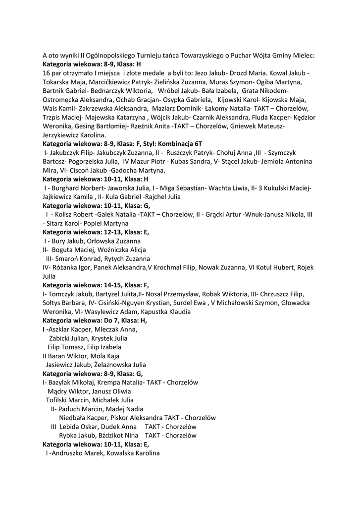 A oto wyniki II Ogólnopolskiego Turnieju tańca Towarzyskiego o Puchar Wójta Gminy Mielec: Kategoria wiekowa: 8-9, Klasa: H 16 par otrzymało I miejsca i złote medale a byli to: Jezo Jakub- Drozd Maria. Kowal Jakub Tokarska Maja, Marcićkiewicz Patryk- Zielińska Zuzanna, Muras Szymon- Ogiba Martyna, Bartnik Gabriel- Bednarczyk Wiktoria, Wróbel Jakub- Bała Izabela, Grata NikodemOstromęcka Aleksandra, Ochab Gracjan- Osypka Gabriela, Kijowski Karol- Kijowska Maja, Wais Kamil- Zakrzewska Aleksandra, Maziarz Dominik- Łakomy Natalia- TAKT – Chorzelów, Trzpis Maciej- Majewska Katarzyna , Wójcik Jakub- Czarnik Aleksandra, Fluda Kacper- Kędzior Weronika, Gesing Bartłomiej- Rzeźnik Anita -TAKT – Chorzelów, Gniewek MateuszJerzykiewicz Karolina. Kategoria wiekowa: 8-9, Klasa: F, Styl: Kombinacja 6T I- Jakubczyk Filip- Jakubczyk Zuzanna, II - Ruszczyk Patryk- Chołuj Anna ,III - Szymczyk Bartosz- Pogorzelska Julia, IV Mazur Piotr - Kubas Sandra, V- Stącel Jakub- Jemioła Antonina Mira, VI- Ciscoń Jakub -Gadocha Martyna. Kategoria wiekowa: 10-11, Klasa: H I - Burghard Norbert- Jaworska Julia, I - Miga Sebastian- Wachta Liwia, II- 3 Kukulski MaciejJajkiewicz Kamila , II- Kula Gabriel -Rajchel Julia Kategoria wiekowa: 10-11, Klasa: G, I - Kolisz Robert -Galek Natalia -TAKT – Chorzelów, II - Grącki Artur -Wnuk-Janusz Nikola, III - Sitarz Karol- Popiel Martyna Kategoria wiekowa: 12-13, Klasa: E, I - Bury Jakub, Orłowska Zuzanna II- Boguta Maciej, Woźniczka Alicja III- Smaroń Konrad, Rytych Zuzanna IV- Różanka Igor, Panek Aleksandra,V Krochmal Filip, Nowak Zuzanna, VI Kotul Hubert, Rojek Julia Kategoria wiekowa: 14-15, Klasa: F, I- Tomczyk Jakub, Bartyzel Julita,II- Nosal Przemysław, Robak Wiktoria, III- Chrzuszcz Filip, Sołtys Barbara, IV- Cisiński-Nguyen Krystian, Surdel Ewa , V Michałowski Szymon, Głowacka Weronika, VI- Wasylewicz Adam, Kapustka Klaudia Kategoria wiekowa: Do 7, Klasa: H, I -Aszklar Kacper, Mleczak Anna, Żabicki Julian, Krystek Julia Filip Tomasz, Filip Izabela II Baran Wiktor, Mola Kaja Jasiewicz Jakub, Żelaznowska Julia Kategoria wiekowa: 8-9, Klasa: G, I- Bazylak Mikołaj, Krempa Natalia- TAKT - Chorzelów Mądry Wiktor, Janusz Oliwia Tofilski Marcin, Michałek Julia II- Paduch Marcin, Madej Nadia Niedbała Kacper, Piskor Aleksandra TAKT - Chorzelów III Lebida Oskar, Dudek Anna TAKT - Chorzelów Rybka Jakub, Bździkot Nina TAKT - Chorzelów Kategoria wiekowa: 10-11, Klasa: E, I -Andruszko Marek, Kowalska Karolina II- Hałun Dominik, Hałun Gabriela III -Starostka Marcel, Jarosz Julia IV- Stochel Mikołaj, Piasek Paulina V - Kłoda Kacper, Bara Oliwia TAKT - Chorzelów VI - Mierzwa Oskar, Mytkoś Oliwia Kategoria wiekowa: 12-13, Klasa: F, I- Pogorzelski Piotr, Cuber Gabriela II- Sierzchała Marcin, Chmiel Martyna III-Żuczek Oskar, Mądry Emilia IV Wijas Jakub, Posłowska Jagoda V-Furtek Dawid, Pasieka Julia VI Fidler Jakub, Trepka Michalina Kategoria wiekowa: 12-13, Klasa: D, Styl: Standard I- Lipnicki Wojciech, Gryczka Marta II- Sohling Norbert, Greczycho Kamila III- Bolek Marcel, Domagała Oliwia IV- Krempa Paweł, Niziołek Natalia TAKT - Chorzelów V- Rybka Konrad, Sosińska Julia TAKT - Chorzelów VI-Gniewek Bartosz, Lubińska Katarzyna Kategoria wiekowa: 12-13, Klasa: D, Styl: Latin I- Bolek Marcel, Domagała Oliwia II- Łyszczarz Bartosz, Cwynar Wiktoria III- Gniewek Bartosz, Lubińska Katarzyna IV- Kijowski Cezary, Farbaniec Emilia V- Płaneta Jakub, Dziędzioł Magdalena VI- Rybka Konrad, Sosińska Julia KTT - Chorzelów Polska Kategoria wiekowa: 14-15, Klasa: E, I -Sadowski Radosław, Wątor Natalia II-Nośko Mateusz, Jacek Martyna III-Bosak Kamil, Kolisz Dominika Kategoria wiekowa: 14-15, Klasa: D, Styl: Standard I- Górniak Jerzy, Struzik Lidia II-Szczygieł Daniel, Piejko Olga Gabriela III- Mazur Jakub, Janiga Aleksandra IV- Bała Jakub, Matuszczyk Alicja V- Chuchro Wojciech, Żymuła Weronika VI- Kaczmarski Kamil, Szkutnik Natalia Kategoria wiekowa: 14-15, Klasa: D, Styl: Latin I- Mazur Jakub, Janiga Aleksandra II- Szczygieł Daniel, Piejko Olga Gabriela III- Górniak Jerzy, Struzik Lidia IV-Andruszko Jacek, Madaj Klaudia V - Kaczmarski Kamil, Szkutnik Natalia VI-Cacała Radosław, Hodor Wiktoria Kategoria wiekowa: Pow. 15, Klasa: D, Styl: Standard I- Pasierb Adam, Zygmunt Anna II- Szota Mateusz, Zinin Justyna 6/ 11 III- Bebło Kacper, Ślusarz Sylwia IV- Malinowski Mikołaj, Brzezińska Aleksandra Kategoria wiekowa: Pow. 15, Klasa: D, Styl: Latin I- Pasierb Adam, Zygmunt Anna II-Szota Mateusz, Zinin Justyna III- Bebło Kacper, Ślusarz Sylwia IV- Malinowski Mikołaj, Brzezińska Aleksandra Kategoria wiekowa: Pow. 15, Klasa: B, Styl: Standard I-Jasiewicz Karol, Wilk Klaudia II- Chwajta Bartłomiej, Preisner Jagienka III-Wdowiak Hubert, Glica Milena IV Pogorzelec Paweł, Krytak Małgorzata V- Jachyra Dawid, Oczkowska Julia Kategoria wiekowa: Pow. 15, Klasa: B, Styl: Latin I- Kmita Sebastian, Rej Patrycja II-Mroczka Paweł, Rogala Kamila III-Wdowiak Hubert, Glica Milena IV- Chwajta Bartłomiej, Preisner Jagienka V- Kasza Konrad, Skiba Wiktoria Sandra VI- Pogorzelec Paweł, Krytak Małgorzata Kategoria wiekowa: Seniorzy 1, Klasa: Brak, Styl: Standard-3 I - Siry Krzysztof, Siry Małgorzata TAKT - Chorzelów II-Gawryś Krzysztof, Gawryś Jolanta III- Styczeń Kazimierz, Styczeń Elżbieta TAKT - Chorzelów Kategoria wiekowa: Seniorzy 1, Klasa: Brak, Styl: Latin-3 I - Siry Krzysztof, Siry Małgorzata TAKT - Chorzelów II-Gawryś Krzysztof, Gawryś Jolanta III- Styczeń Kazimierz, Styczeń Elżbieta TAKT - Chorzelów