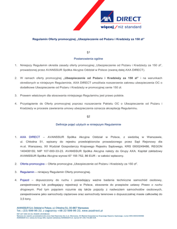 Regulamin Oferty promocyjnej „Ubezpieczenie od PoŜaru i KradzieŜy za 150 zł” §1 Postanowienia ogólne 1. Niniejszy Regulamin określa zasady oferty promocyjnej „Ubezpieczenie od PoŜaru i KradzieŜy za 150 zł”, prowadzonej przez AVANSSUR Spółka Akcyjna Oddział w Polsce (zwaną dalej AXA DIRECT). 2. W ramach oferty promocyjnej „Ubezpieczenie od PoŜaru i KradzieŜy za 150 zł” i na warunkach określonych w niniejszym Regulaminie, AXA DIRECT umoŜliwia rozszerzenie zakresu ubezpieczenia OC o dodatkowe Ubezpieczenie od PoŜaru i KradzieŜy w promocyjnej cenie 150 zł. 3. Prawem właściwym dla stosowania niniejszego Regulaminu jest prawo polskie. 4. Przystąpienie do Oferty promocyjnej poprzez rozszerzenie Pakietu OC o Ubezpieczenie od PoŜaru i KradzieŜy w procesie zawierania umowy ubezpieczenia oznacza akceptację Regulaminu. §2 Definicje pojęć uŜytych w niniejszym Regulaminie 1. AXA DIRECT – AVANSSUR Spółka Akcyjna Oddział w Polsce, z siedzibą w Warszawie, ul. Chłodna 51, wpisany do rejestru przedsiębiorców prowadzonego przez Sąd Rejonowy dla m.st. Warszawy, XII Wydział Gospodarczy Krajowego Rejestru Sądowego, KRS 0000249486, REGON 140408155; NIP 107-000-33-23. AVANSSUR Spółka Akcyjna naleŜy do Grupy AXA. Kapitał zakładowy AVANSSUR Spółka Akcyjna wynosi 67 155 752, 86 EUR - w całości wpłacony. 2. Oferta promocyjna – Oferta promocyjna „Ubezpieczenie od PoŜaru i KradzieŜy za 150 zł”. 3. Regulamin – niniejszy Regulamin Oferty promocyjnej. 4. Pojazd – dopuszczony do ruchu i posiadający waŜne badania techniczne samochód osobowy, zarejestrowany lub podlegający rejestracji w Polsce, stosownie do przepisów ustawy Prawo o ruchu drogowym. Pod tym pojęciem rozumie się takŜe pojazdy z nadwoziem samochodów osobowych, zarejestrowane jako samochody cięŜarowe oraz samochody terenowe o dopuszczalnej masie całkowitej do 3,5 tony. 5. Pojazd objęty Ofertą promocyjną – pojazd, którego właściciel w okresie ostatnich 5 lat przed dniem złoŜenia wniosku o zawarcie Umowy ubezpieczenia na warunkach Oferty promocyjnej nie miał zawartej umowy ubezpieczenia w zakresie autocasco (AC) na ten pojazd z jakimkolwiek zakładem ubezpieczeń oraz w chwili złoŜenia wniosku o zawarcie Umowy ubezpieczenia na warunkach Oferty promocyjnej nie był objęty obowiązkowym ubezpieczeniem posiadaczy pojazdów mechanicznych (OC) zawartym z AXA DIRECT. 6. Umowa ubezpieczenia – umowa ubezpieczenia zawarta pomiędzy AXA DIRECT a Nowym Klientem lub Aktualnym Klientem, obejmująca swoim zakresem ubezpieczenie odpowiedzialności cywilnej posiadaczy pojazdów mechanicznych (OC) i ubezpieczenie dobrowolne z wyłączeniem ubezpieczenia autocasco (AC). Za Umowę ubezpieczenia w rozumieniu Regulaminu nie są uwaŜane umowy ubezpieczenia OC zawierane na okres krótszy niŜ 12 miesięcy (tzw. krótkoterminowe umowy ubezpieczenia). 7. Nowy Klient – osoba fizyczna będąca właścicielem lub współwłaścicielem pojazdu objętego Ofertą promocyjną, która w chwili przystąpienia do Oferty promocyjnej nie posiada zawartej z AXA DIRECT Umowy ubezpieczenia na pojazd objęty Ofertą promocyjną i która spełnia wymogi określone w § 3 niniejszego Regulaminu. Nowym Klientem moŜe być równieŜ osoba fizyczna prowadząca działalność gospodarczą lub jednostka organizacyjna nieposiadająca osobowości prawnej, o ile pojazd objęty Ofertą promocyjną nie słuŜy jej do prowadzenia działalności gospodarczej. 8. Aktualny Klient – osoba fizyczna będąca właścicielem lub współwłaścicielem pojazdu objętego Ofertą promocyjną, która w chwili przystąpienia do Oferty promocyjnej posiada zawartą z AXA DIRECT Umowę ubezpieczenia wyłącznie w zakresie OC i ubezpieczenia dobrowolnego z wyłączeniem ubezpieczenia autocasco (AC), na pojazd inny niŜ pojazd objęty Ofertą promocyjną i która spełnia wymogi określone w § 3 niniejszego Regulaminu. Aktualnym Klientem moŜe być równieŜ osoba fizyczna prowadząca działalność gospodarczą lub jednostka organizacyjna nieposiadająca osobowości prawnej, o ile pojazd objęty Ofertą promocyjną nie słuŜy jej do prowadzenia działalności gospodarczej. 9. Call Center – Centrum telefoniczne AXA DIRECT dostępne pod numerem telefonu 22 599 95 22. 10. Doradca – pracownik AXA DIRECT w Call Center lub osoba świadcząca w imieniu i na rzecz AXA DIRECT usługi w Call Center, na podstawie umowy cywilnoprawnej. 11. Agent - osoba fizyczna lub prawna wykonująca czynności agencyjne na rzecz AXA DIRECT, wpisana do Rejestru Agentów Ubezpieczeniowych. 12. Strona internetowa – strona internetowa AXA DIRECT, zamieszczona pod adresem internetowym www.axadirect.pl. 13. Czas trwania Oferty promocyjnej – okres, w którym Nowy Klient lub Aktualny Klient moŜe skorzystać z Oferty promocyjnej, określony w § 6 niniejszego Regulaminu. 14. Ubezpieczenie od PoŜaru i KradzieŜy – dobrowolne ubezpieczenie od zniszczenia pojazdu w skutek poŜaru i od kradzieŜy (P-KR), którego zakres i warunki są określone w Ogólnych Warunkach Ubezpieczeń Komunikacyjnych z dnia 7 grudnia 2012 r. dostępnych na stronie internetowej www.axadirect.pl. §3 Zasady korzystania z Oferty promocyjnej 1. Z Oferty promocyjnej mogą skorzystać Nowi Klienci lub Aktualni Klienci, którzy spełnią wszystkie warunki określone w Regulaminie. 2. Oferta promocyjna przeznaczona jest dla Nowych Klientów lub Aktualnych Klientów, którzy w Czasie trwania Oferty promocyjnej składają wniosek o zawarcie Umowy ubezpieczenia przez Internet, za pośrednictwem Call Center lub poprzez Agenta. 3. Oferta promocyjna ma zastosowanie do Nowych Klientów lub Aktualnych Klientów, którzy w Czasie trwania Oferty promocyjnej wyliczą składkę naleŜną z tytułu Umowy ubezpieczenia przy uŜyciu kalkulatora AXA DIRECT dostępnego na Stronie internetowej, a następnie na tej podstawie złoŜą wniosek o zawarcie umowy ubezpieczenia za pośrednictwem Call Cente
