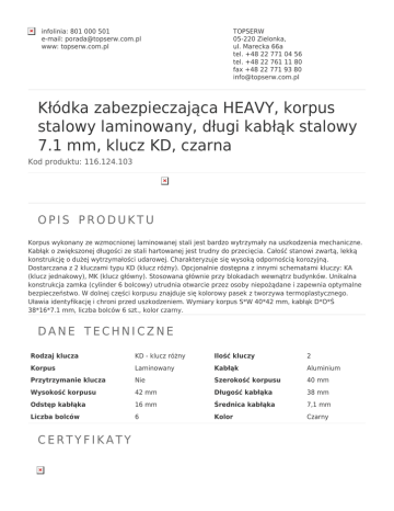infolinia: 801 000 501 e-mail: [email protected] www: topserw.com.pl TOPSERW 05-220 Zielonka, ul. Marecka 66a tel. +48 22 771 04 56 tel. +48 22 761 11 80 fax +48 22 771 93 80 [email protected] Kłódka zabezpieczająca HEAVY, korpus stalowy laminowany, długi kabłąk stalowy 7.1 mm, klucz KD, czarna Kod produktu: 116.124.103 OPIS PRODUKTU Korpus wykonany ze wzmocnionej laminowanej stali jest bardzo wytrzymały na uszkodzenia mechaniczne. Kabłąk o zwiększonej długości ze stali hartowanej jest trudny do przecięcia. Całość stanowi zwartą, lekką konstrukcję o dużej wytrzymałości udarowej. Charakteryzuje się wysoką odpornością korozyjną. Dostarczana z 2 kluczami typu KD (klucz różny). Opcjonalnie dostępna z innymi schematami kluczy: KA (klucz jednakowy), MK (klucz główny). Stosowana głównie przy blokadach wewnątrz budynków. Unikalna konstrukcja zamka (cylinder 6 bolcowy) utrudnia otwarcie przez osoby niepożądane i zapewnia optymalne bezpieczeństwo. W dolnej części korpusu znajduje się kolorowy pasek z tworzywa termoplastycznego. Uławia identyfikację i chroni przed uszkodzeniem. Wymiary korpus S*W 40*42 mm, kabłąk D*O*Ś 38*16*7.1 mm, liczba bolców 6 szt., kolor czarny. DANE TECHNICZNE Rodzaj klucza KD - klucz różny Ilość kluczy 2 Korpus Laminowany Kabłąk Aluminium Przytrzymanie klucza Nie Szerokość korpusu 40 mm Wysokość korpusu 42 mm Długość kabłąka 38 mm Odstęp kabłąka 16 mm Średnica kabłąka 7,1 mm Liczba bolców 6 Kolor Czarny CERTYFIKATY POWIĄZANE Produkt Kłódka zabezpieczająca HEAVY, korpus stalowy laminowany, długi kabłąk stalowy 7.1 mm, klucz KD, czerwona Kłódka zabezpieczająca HEAVY, korpus stalowy laminowany, długi kabłąk stalowy 7.1 mm, klucz KD, biała Kłódka zabezpieczająca HEAVY, korpus stalowy laminowany, długi kabłąk stalowy 7.1 mm, klucz KD, żółta Kłódka zabezpieczająca HEAVY, korpus stalowy laminowany, długi kabłąk stalowy 7.1 mm, klucz KD, czarna Kłódka zabezpieczająca HEAVY, korpus stalowy laminowany, długi kabłąk stalowy 7.1 mm, klucz KD, niebieska Kłódka zabezpieczająca HEAVY, korpus stalowy laminowany, długi kabłąk stalowy 7.1 mm, klucz KD, zielona