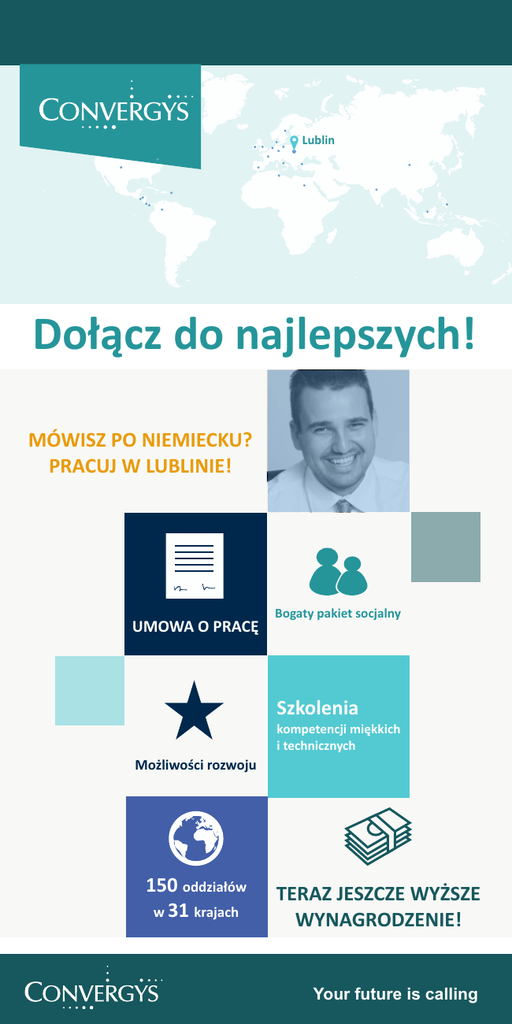 Lublin Dołącz do najlepszych! MÓWISZ PO NIEMIECKU? PRACUJ W LUBLINIE! UMOWA O PRACĘ Bogaty pakiet socjalny Szkolenia kompetencji miękkich i technicznych Możliwości rozwoju 150 oddziałów w 31 krajach TERAZ JESZCZE WYŻSZE WYNAGRODZENIE! Your future is calling Kim jesteśmy? Convergys jest globalnym liderem w branży obsługi klienta. Z dniem 3 marca 2014 zakończył się proces przejęcia Stream przez Convergys. Razem Convergys i Stream stworzyły światowej klasy firmę specjalizującą się w obsłudze klienta zatrudniającą 125,000 pracowników w ponad 150 oddziałach w 31 krajach. Kogo szukamy? W związku z dynamicznym rozwojem naszego oddziału w Lublinie poszukujemy osób na stanowisko: SPECJALISTA DS. OBSŁUGI KLIENTA Z J. NIEMIECKIM Na czym polega praca? Osoba zatrudniona na tym stanowisku będzie odpowiedzialna za szeroko pojętą obsługę klienta niemieckojęzycznego z branży telefonii komórkowej. Zadaniem pracownika będzie głównie obsługa telefoniczna (tylko połączenia przychodzące) oraz mailowa m.in. w zakresie rozwiązywania problemów technicznych związanych z zakupionym sprzętem oraz usługami. Poznaj naszą bogatą ofertę! ź umowa o pracę atrakcyjne wynagrodzenie z systemem premiowym ź bogaty pakiet socjalny (bezpłatna opieka medyczna, Refer a Friend Program, imprezy integracyjne, uczestnictwo w programie ubezpieczeń grupowych) ź szkolenia techniczne i ‘miękkie’ oraz możliwość podnoszenia kwalifikacji ź międzynarodowe środowisko pracy ź Osoby zainteresowane dołączeniem do naszego zespołu prosimy o przesłanie CV na adres: [email protected] Convergys ul. Szeligowskiego 6c 20-883 Lublin +48 81 458 10 54 www.CONVERGYS.pl