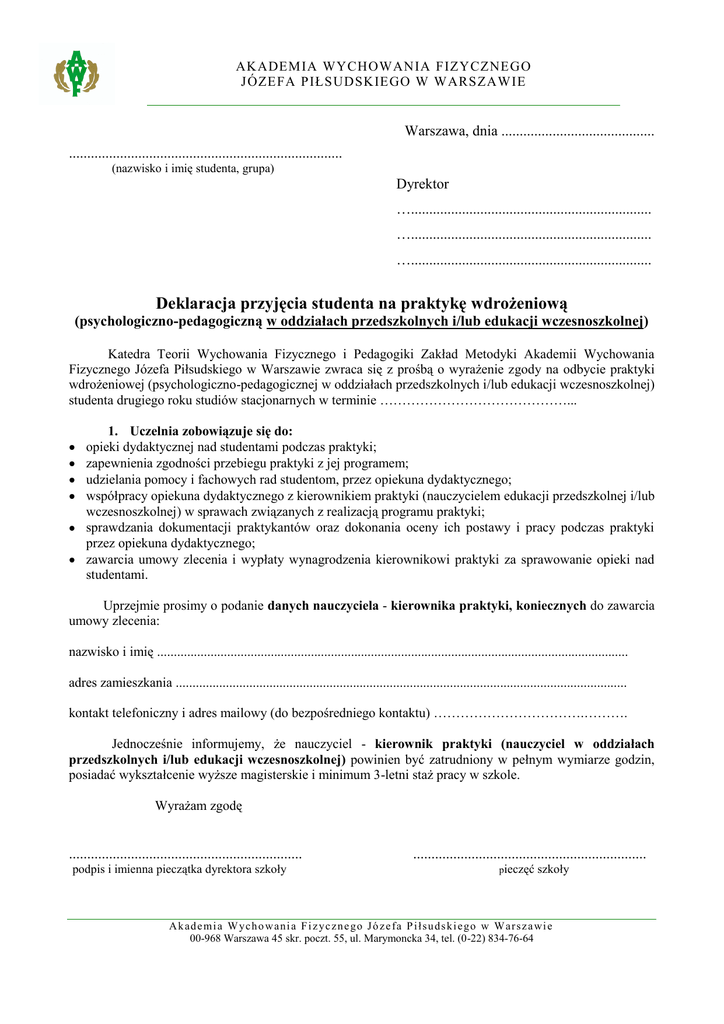 AKADEMIA WYCHOWANIA FIZYCZNEGO JÓZEFA PIŁSUDSK IEGO W WARSZAWIE Warszawa, dnia .......................................... ........................................................................... (nazwisko i imię studenta, grupa) Dyrektor ….................................................................. ….................................................................. ….................................................................. Deklaracja przyjęcia studenta na praktykę wdrożeniową (psychologiczno-pedagogiczną w oddziałach przedszkolnych i/lub edukacji wczesnoszkolnej) Katedra Teorii Wychowania Fizycznego i Pedagogiki Zakład Metodyki Akademii Wychowania Fizycznego Józefa Piłsudskiego w Warszawie zwraca się z prośbą o wyrażenie zgody na odbycie praktyki wdrożeniowej (psychologiczno-pedagogicznej w oddziałach przedszkolnych i/lub edukacji wczesnoszkolnej) studenta drugiego roku studiów stacjonarnych w terminie ……………………………………... 1. Uczelnia zobowiązuje się do: opieki dydaktycznej nad studentami podczas praktyki; zapewnienia zgodności przebiegu praktyki z jej programem; udzielania pomocy i fachowych rad studentom, przez opiekuna dydaktycznego; współpracy opiekuna dydaktycznego z kierownikiem praktyki (nauczycielem edukacji przedszkolnej i/lub wczesnoszkolnej) w sprawach związanych z realizacją programu praktyki; sprawdzania dokumentacji praktykantów oraz dokonania oceny ich postawy i pracy podczas praktyki przez opiekuna dydaktycznego; zawarcia umowy zlecenia i wypłaty wynagrodzenia kierownikowi praktyki za sprawowanie opieki nad studentami. Uprzejmie prosimy o podanie danych nauczyciela - kierownika praktyki, koniecznych do zawarcia umowy zlecenia: nazwisko i imię ............................................................................................................................................. adres zamieszkania ....................................................................................................................................... kontakt telefoniczny i adres mailowy (do bezpośredniego kontaktu) …………………………….………. Jednocześnie informujemy, że nauczyciel - kierownik praktyki (nauczyciel w oddziałach przedszkolnych i/lub edukacji wczesnoszkolnej) powinien być zatrudniony w pełnym wymiarze godzin, posiadać wykształcenie wyższe magisterskie i minimum 3-letni staż pracy w szkole. Wyrażam zgodę ................................................................ podpis i imienna pieczątka dyrektora szkoły ................................................................ pieczęć szkoły A k a d e m i a W yc h o w a n i a F i z yc z n e go J ó z e fa P i ł s u d s ki e go w W a r s z a wi e 00-968 Warszawa 45 skr. poczt. 55, ul. Marymoncka 34, tel. (0-22) 834-76-64 AKADEMIA WYCHOWANIA FIZYCZNEGO JÓZEFA PIŁSUDSK IEGO W WARSZAWIE 1. Szkoła zobowiązuje się do: zapewnienia odpowiednich warunków pracy do realizacji programu praktyki; wyznaczenia nauczyciela – kierownika praktyki; opracowania przez kierownika praktyki w oparciu o program praktyki indywidualnego, szczegółowego planu pracy dla studenta na okres praktyki (planowanie powinno uwzględnić wszystkie rodzaje działalności przewidziane programem praktyki); sprawowania przez kierownika praktyki nadzoru nad właściwym wykonaniem przez studenta programu praktyki, wpisywaniem uwag i ocen prowadzonych zajęć; obserwacji i omawiania prowadzonych zajęć; pomocy w realizacji zadań praktyki; zapoznania studenta z przepisami BHP w szkole; umożliwienia opiekunom dydaktycznym AWF nadzoru, opieki i doradztwa merytorycznego nad studentami; 2. Studenta zobowiązuje się do: zgłoszenia się u dyrektora szkoły w pierwszym dniu praktyki; codziennej obecności w szkole w liczbie godzin określonych programem praktyki; samodzielnego prowadzenia na bieżąco dokumentacji praktyki, uzyskania potwierdzenia na bieżąco realizacji zadań przez osoby kompetentne w tym zakresie; pełnej realizacji zadań określonych programem praktyki i rozliczenia się z godzin pracy; pisemnego przygotowania się do zajęć i przedłożenia scenariusza nauczycielowi do zatwierdzenia w dniu poprzedzającym zajęcia; przestrzegania zasad BHP i regulaminu pracy obowiązującego w szkole; złożenia dokumentacji praktyki w sekretariacie Zakładu Metodyki WF - Praktyki Pedagogiczne pokój 361 bezpośrednio po zakończeniu praktyki. Uwaga: student w czasie prowadzenia zajęć nie może pozostawać sam bez nadzoru kierownika praktyki; studenci odbywający praktykę w szkole pozostają pod odpowiedzialnością służbową wobec dyrektora szkoły; wszelkie odstępstwa wynikające ze zmiany terminu praktyki, jej przebiegu, realizacji zadań, zachowań studentów - osoby sprawujące nadzór nad praktyką tj. dyrektor szkoły, kierownik praktyki - winien natychmiast zgłaszać uczelni: A k a d e m i a W yc h o w a n i a F i z yc z n e go J ó z e fa P i ł s u d s ki e go w W a r s z a wi e 00-968 Warszawa 45 skr. poczt. 55, ul. Marymoncka 34, tel. (0-22) 834-76-64