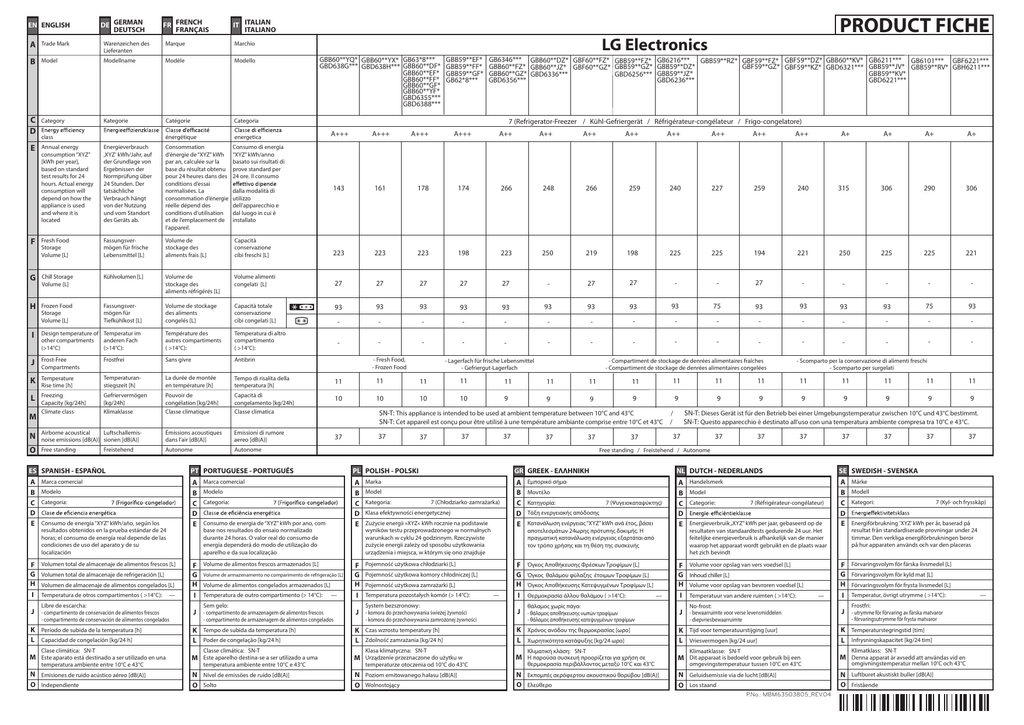 EN ENGLISH FR FRENCH FRANÇAIS IT ITALIAN ITALIANO A Trade Mark Warenzeichen des Lieferanten Marque Marchio B Model Modellname Modèle Modello C D Category Kategorie E Annual energy consumption “XYZ” [kWh per year], based on standard test results for 24 hours. Actual energy consumption will depend on how the appliance is used and where it is located Catégorie Categoria énergétique energetica Energieverbrauch ‚XYZ‘ kWh/Jahr, auf der Grundlage von Ergebnissen der Normprüfung über 24 Stunden. Der tatsächliche Verbrauch hängt von der Nutzung und vom Standort des Geräts ab. Consommation d’énergie de “XYZ” kWh par an, calculée sur la base du résultat obtenu pour 24 heures dans des conditions d’essai normalisées. La consommation d’énergie réelle dépend des conditions d’utilisation et de l’emplacement de l’appareil. Consumo di energia “XYZ” kWh/anno basato sui risultati di prove standard per 24 ore. Il consumo Fresh Food Storage Volume [L] Fassungsvermögen für frische Lebensmittel [L] Volume de stockage des aliments frais [L] G Chill Storage Volume [L] Kühlvolumen [L] H Frozen Food Storage Volume [L] Fassungsvermögen für Tiefkühlkost [L] F class GB6346*** GBB60**DZ* GBF60**FZ* GBB59**FZ* GB6216*** GBB59**RZ* GBF59**FZ* GBF59**DZ* GBB60**KV* GB6211*** GB6101*** GBF6221*** GBB60**FZ* GBB60**JZ* GBF60**GZ* GBB59**GZ* GBB59**DZ* GBF59**GZ* GBF59**KZ* GBD6321*** GBB59**JV* GBB59**RV* GBH6211*** GBB59**KV* GBB60**GZ* GBD6336*** GBD6256*** GBB59**JZ* GBD6221*** GBD6236*** GBD6356*** 7 (Refrigerator-Freezer / Kühl-Gefriergerät / Réfrigérateur-congélateur / Frigo-congelatore) A++ A++ A++ A++ A++ A++ A++ A++ A+ A+ A+ A+ 178 174 266 248 266 259 240 227 259 240 315 306 290 306 223 223 198 223 250 219 198 225 225 194 221 250 225 225 221 27 27 27 27 27 - 27 27 - - 27 - - - - - 93 93 93 93 93 93 93 93 93 75 93 93 93 93 75 93 - - - - - - - - - - - - - - - - - - - - - - - - - - - - - - - - A+++ 143 161 Capacità conservazione cibi freschi [L] 223 Volume de stockage des aliments réfrigérés [L] Volume alimenti congelati [L] Volume de stockage des aliments congelés [L] Capacità totale conservazione cibi congelati [L] Température des autres compartiments ( >14°C): Temperatura di altro compartimento ( >14°C): dalla modalità di utilizzo dell’apparecchio e dal luogo in cui è installato GBB59**EF* GBB59**FF* GBB59**GF* GB62*8*** A+++ A+++ A+++ Design temperature of Temperatur im anderen Fach other compartments (>14°C): (>14°C) J Frost-Free Compartments Frostfrei Sans givre Antibrin K Temperature Rise time [h] Temperaturanstiegszeit [h] La durée de montée en température [h] Tempo di risalita della temperatura [h] 11 11 11 11 11 11 11 11 11 L Freezing Capacity [kg/24h] Climate class Gefriervermögen [kg/24h] Klimaklasse Pouvoir de congélation [kg/24h] Classe climatique Capacità di congelamento [kg/24h] Classe climatica 10 10 10 10 9 9 9 9 9 N Airborne acoustical Luftschallemisnoise emissions [dB(A)] sionen [dB(A)] Émissions acoustiques dans l’air [dB(A)] Emissioni di rumore aereo [dB(A)] O Free standing Autonome Autonome Freistehend PRODUCT FICHE LG Electronics GBB60**YQ* GBB60**YX* GB63*8*** GBD638G*** GBD638H*** GBB60**DF* GBB60**EF* GBB60**FF* GBB60**GF* GBB60**YF* GBD6355*** GBD6388*** I M G DE GERMAN DEUTSCH - Fresh Food, - Frozen Food - Lagerfach für frische Lebensmittel - Gefriergut-Lagerfach - Compartiment de stockage de denrées alimentaires fraîches - Compartiment de stockage de denrées alimentaires congelées 37 37 37 37 37 37 37 37 11 11 11 11 11 11 11 9 9 9 9 9 9 9 SN-T: Dieses Gerät ist für den Betrieb bei einer Umgebungstemperatur zwischen 10°C und 43°C bestimmt. SN-T: Questo apparecchio è destinato all’uso con una temperatura ambiente compresa tra 10°C e 43°C. / SN-T: This appliance is intended to be used at ambient temperature between 10°C and 43°C SN-T: Cet appareil est conçu pour être utilisé à une température ambiante comprise entre 10°C et 43°C / 37 - Scomparto per la conservazione di alimenti freschi - Scomparto per surgelati 37 37 37 37 37 ES SPANISH - ESPAÑOL PT PORTUGUESE - PORTUGUÉS PL POLISH - POLSKI GR GREEK - ΕΛΛΗΝΙΚΗ NL DUTCH - NEDERLANDS SE SWEDISH - SVENSKA A B C D E A B C D E A B C D E A B C D E A B C D E A B C D E Marca comercial Modelo Categoría: Consumo de energía “XYZ” kWh/año, según los resultados obtenidos en la prueba estándar de 24 horas; el consumo de energía real depende de las condiciones de uso del aparato y de su localización F Volumen total de almacenaje de alimentos frescos [L] G Volumen total de almacenaje de refrigeración [L] H Volumen de almacenaje de alimentos congelados [L] I Temperatura de otros compartimentos ( >14°C): J Libre de escarcha: - compartimento de conservación de alimentos frescos - compartimento de conservación de alimentos congelados K Período de subida de la temperatura [h] L Capacidad de congelación [kg/24 h] Clase climática: SN-T — Marca comercial Modelo Categoria: Consumo de energia de “XYZ” kWh por ano, com base nos resultados do ensaio normalizado durante 24 horas. O valor real do consumo de energia dependerá do modo de utilização do aparelho e da sua localização F Volume de alimentos frescos armazenados [L] G Volume de armazenamento no comparimento de refrigeração [L] H Volume de alimentos congelados armazenados [L] I Temperatura de outro compartimento (> 14°C): — J Sem gelo: - compartimento de armazenagem de alimentos frescos - compartimento de armazenagem de alimentos congelados K Tempo de subida da temperatura [h] L Poder de congelação [kg/24 h] Classe climática: SN-T 37 37 Free standing / Freistehend / Autonome Marka Model Kategoria: 7 (Chłodziarko-zamrażarka) Klasa efektywności energetycznej Zużycie energii »XYZ« kWh rocznie na podstawie wyników testu przeprowadzonego w normalnych warunkach w cyklu 24 godzinnym. Rzeczywiste zużycie energii zależy od sposobu użytkowania urządzenia i miejsca, 