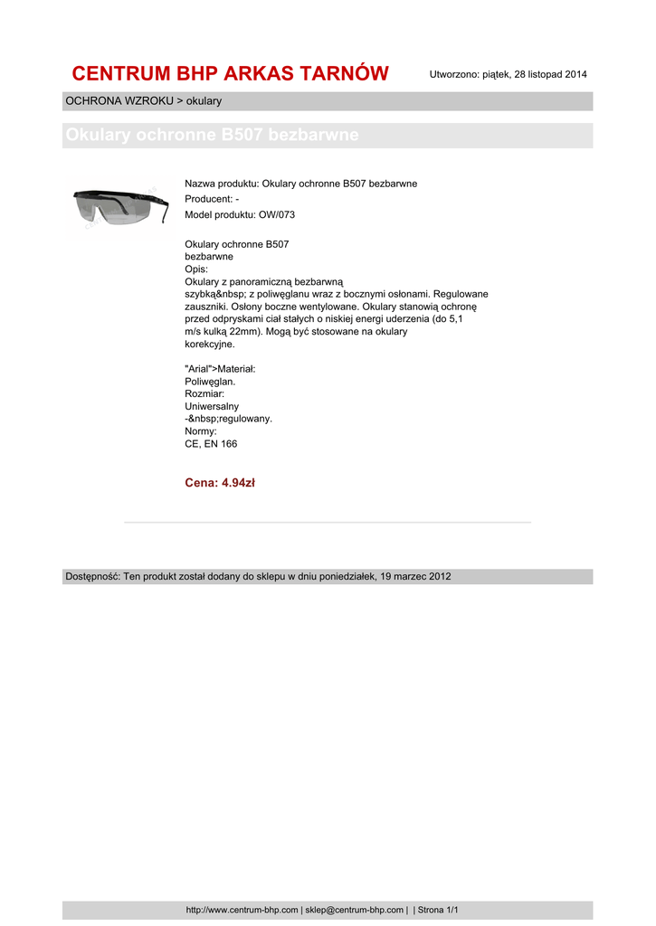 CENTRUM BHP ARKAS TARNÓW Utworzono: piątek, 28 listopad 2014 OCHRONA WZROKU > okulary Okulary ochronne B507 bezbarwne Nazwa produktu: Okulary ochronne B507 bezbarwne Producent: Model produktu: OW/073 Okulary ochronne B507 bezbarwne Opis: Okulary z panoramiczną bezbarwną szybką z poliwęglanu wraz z bocznymi osłonami. Regulowane zauszniki. Osłony boczne wentylowane. Okulary stanowią ochronę przed odpryskami ciał stałych o niskiej energi uderzenia (do 5,1 m/s kulką 22mm). Mogą być stosowane na okulary korekcyjne. "Arial">Materiał: Poliwęglan. Rozmiar: Uniwersalny - regulowany. Normy: CE, EN 166 Cena: 4.94zł Dostępność: Ten produkt został dodany do sklepu w dniu poniedziałek, 19 marzec 2012 http://www.centrum-bhp.com | [email protected] | | Strona 1/1