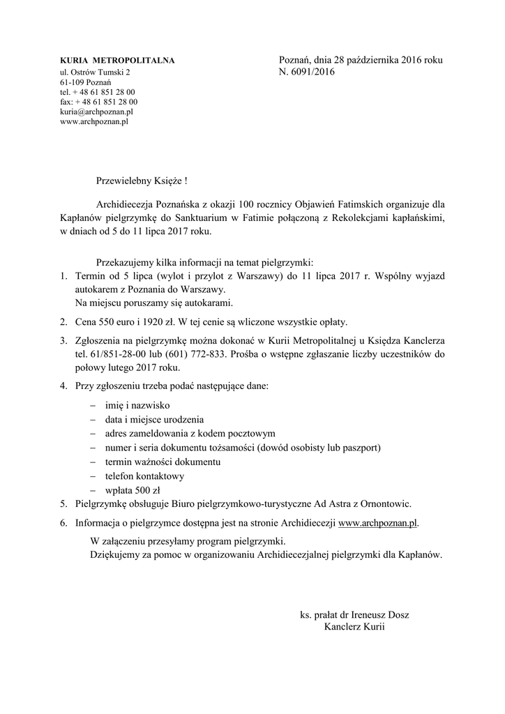 KURIA METROPOLITALNA ul. Ostrów Tumski 2 61-109 Poznań tel. + 48 61 851 28 00 fax: + 48 61 851 28 00 [email protected] www.archpoznan.pl Poznań, dnia 28 października 2016 roku N. 6091/2016 Przewielebny Księże ! Archidiecezja Poznańska z okazji 100 rocznicy Objawień Fatimskich organizuje dla Kapłanów pielgrzymkę do Sanktuarium w Fatimie połączoną z Rekolekcjami kapłańskimi, w dniach od 5 do 11 lipca 2017 roku. Przekazujemy kilka informacji na temat pielgrzymki: 1. Termin od 5 lipca (wylot i przylot z Warszawy) do 11 lipca 2017 r. Wspólny wyjazd autokarem z Poznania do Warszawy. Na miejscu poruszamy się autokarami. 2. Cena 550 euro i 1920 zł. W tej cenie są wliczone wszystkie opłaty. 3. Zgłoszenia na pielgrzymkę można dokonać w Kurii Metropolitalnej u Księdza Kanclerza tel. 61/851-28-00 lub (601) 772-833. Prośba o wstępne zgłaszanie liczby uczestników do połowy lutego 2017 roku. 4. Przy zgłoszeniu trzeba podać następujące dane: − imię i nazwisko − data i miejsce urodzenia − adres zameldowania z kodem pocztowym − numer i seria dokumentu tożsamości (dowód osobisty lub paszport) − termin ważności dokumentu − telefon kontaktowy − wpłata 500 zł 5. Pielgrzymkę obsługuje Biuro pielgrzymkowo-turystyczne Ad Astra z Ornontowic. 6. Informacja o pielgrzymce dostępna jest na stronie Archidiecezji www.archpoznan.pl. W załączeniu przesyłamy program pielgrzymki. Dziękujemy za pomoc w organizowaniu Archidiecezjalnej pielgrzymki dla Kapłanów. ks. prałat dr Ireneusz Dosz Kanclerz Kurii PORTUGALIA Do Matki Bożej Fatimskiej REKOLEKCJE KAPŁAŃSKIE Prowadzący: ks. Jerzy Niedzielski Termin: 05 – 11 lipca 2017r. I DZIEŃ - WARSZAWA - LIZBONA Przelot na trasie Warszawa – Lizbona. Nocleg w Fatimie. II DZIEŃ - FATIMA Msza św. z nauką rekolekcyjną, jutrznia. Zapoznanie z historią objawień NMP z 1917 r. Nawiedzenie Sanktuarium i miejsc związanych z objawieniami w Valinhos, Loca da Cabeco i Aljustrel. Droga Krzyżowa. Nieszpory z nauką rekolekcyjną. Udział w wieczornej procesji różańcowej. Kompleta. Nocleg w Fatimie. III. DZIEŃ - SANTAREM - TOMAR - NAZARE Msza św. z nauką rekolekcyjną, jutrznia. Santarem - Sanktuarium Cudu Eucharystycznego – adoracja -zamyślenie eucharystyczne Tomar – klasztor Chrystusa, dawna siedziba Templariuszy. Po południu wypoczynek nad Oceanem. Nieszpory z nauką rekolekcyjną. Udział w wieczornej procesji różańcowej. Kompleta. Nocleg w Fatimie. IV. DZIEŃ – BATALHA – ALCOBACA – NAZARE Msza św. z nauką rekolekcyjną, jutrznia. Batalha – dominikańskie opactwo z tzw. niedokończoną kaplicą. Alcobaca – cysterskie opactwo z największą świątynią w Portugalii. Nazare – sanktuarium NMP Nazaretańskiej z łaskami słynącą figurą – modlitwa do Najśw. Maryi Panny Po południu wypoczynek nad Oceanem. Nieszpory z nauką rekolekcyjną. Udział w wieczornej procesji różańcowej. Kompleta. Nocleg w Fatimie. V. DZIEŃ – COIMBRA Msza św. z nauką rekolekcyjną, jutrznia. Coimbra – kaplica klasztoru karmelitańskiego, w którym mieszkała s. Łucja, Uniwersytet, stara i nowa katedra. Po południu – nabożeństwo pokutne z nauką rekolekcyjną, adoracja Najświętszego sakramentu, okazja do spowiedzi, nieszpory. Udział w wieczornej procesji różańcowej. Kompleta. Nocleg w Fatimie. VI. DZIEŃ – LIZBONA – CABO DA ROCA Jutrznia z rozważaniem. Cabo da Roca – najbardziej na zachód wysunięty punkt Europy. Lizbona – figura Chrystusa Króla, kościół św. Antoniego – Msza św. z nauką rekolekcyjną, katedra, dzielnica Belem – klasztor Hieronimitów, Pomnik Odkryć Geograficznych, Wieża Belem. Nieszpory z nauką rekolekcyjną. Kompleta. Nocleg w Lizbonie. VII. DZIEŃ – LIZBONA – WARSZAWA Przelot na trasie Lizbona – Warszawa. CENA: 1920 PLN + 550 EUR CENA ZAWIERA: − przelot na trasie Warszawa – Lizbona – Warszawa noclegi w hotelach 4* /pokoje dwuosobowe, dopłata do pokoju jednoosobowego 210 EUR/ − wyżywienie 2 razy dziennie /śniadanie, obiadokolacja/ − przejazdy autokarem wg programu − bilety wstępu do zwiedzanych obiektów − opiekę pilota/przewodnika − opiekę duchową kapłana – rekolekcjonisty − napiwki dla lokalnej obsługi − ubezpieczenie KL i NNW /zawiera ubezpieczenie od chorób przewlekłych