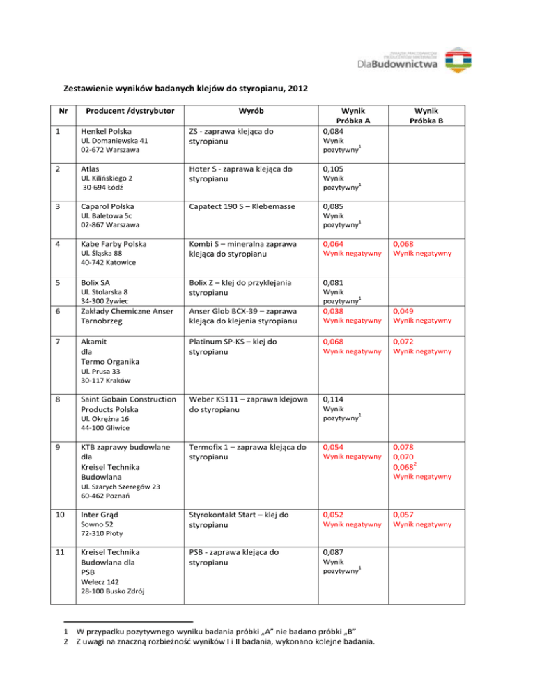 Zestawienie wyników badanych klejów do styropianu, 2012 Nr 1 Producent /dystrybutor Henkel Polska Ul. Domaniewska 41 02-672 Warszawa 2 Atlas Ul. Kilińskiego 2 30-694 Łódź 3 Caparol Polska Wyrób ZS - zaprawa klejąca do styropianu Kabe Farby Polska 0,105 Capatect 190 S – Klebemasse 0,085 0,068 Wynik negatywny Wynik negatywny Bolix Z – klej do przyklejania styropianu 0,081 Zakłady Chemiczne Anser Tarnobrzeg Anser Glob BCX-39 – zaprawa klejąca do klejenia styropianu 0,038 0,049 Wynik negatywny Wynik negatywny Akamit dla Termo Organika Platinum SP-KS – klej do styropianu 0,068 0,072 Wynik negatywny Wynik negatywny Weber KS111 – zaprawa klejowa do styropianu 0,114 Termofix 1 – zaprawa klejąca do styropianu 0,054 Ul. Stolarska 8 34-300 Żywiec 7 Wynik 1 pozytywny 0,064 Bolix SA 6 Wynik 1 pozytywny Kombi S – mineralna zaprawa klejąca do styropianu Ul. Śląska 88 40-742 Katowice 5 Wynik Próbka B Wynik 1 pozytywny Hoter S - zaprawa klejąca do styropianu Ul. Baletowa 5c 02-867 Warszawa 4 Wynik Próbka A 0,084 Wynik 1 pozytywny Ul. Prusa 33 30-117 Kraków 8 Saint Gobain Construction Products Polska Ul. Okrężna 16 44-100 Gliwice 9 KTB zaprawy budowlane dla Kreisel Technika Budowlana Wynik 1 pozytywny Wynik negatywny 0,078 0,070 2 0,068 Wynik negatywny Ul. Szarych Szeregów 23 60-462 Poznań 10 Inter Grąd Sowno 52 72-310 Płoty 11 Kreisel Technika Budowlana dla PSB Styrokontakt Start – klej do styropianu 0,052 0,057 Wynik negatywny Wynik negatywny PSB - zaprawa klejąca do styropianu 0,087 Wynik 1 pozytywny Wełecz 142 28-100 Busko Zdrój 1 W przypadku pozytywnego wyniku badania próbki „A” nie badano próbki „B” 2 Z uwagi na znaczną rozbieżność wyników I i II badania, wykonano kolejne badania. 12 13 Sempre Farby Tesoromont Start TS-100 – zaprawa klejowa do płyt styropianowych 0,086 Ul. Kustronia 60 43-301 Bielsko-Biała PW Fast Fast Normal S – zaprawa klejowa 0,083 Ul. Foluszowa 112 65-751 Zielona Góra 14 STO ISPO Wynik 1 pozytywny Sto Baukleber Ul. Zabraniecka 15 03-872 Warszawa 15 Alpol Gips Greinplast Prefix KS- klej do styropianu KTB Zakład Produkcyjny Dla Kreisel Technika Budowlana 0,085 Wynik 1 pozytywny KS - klej do styropianu Krasne 512B 36-007 Krasne 17 0,111 Wynik 1 pozytywny Fidor k.Końskich 26-200 Końskie 16 Wynik 1 pozytywny 0,108 Wynik 1 pozytywny Termoder 1 – zaprawa klejąca do styropianu 0,081 AK 530 – klej do styropianu 0,089 Wynik 1 pozytywny Ul. Szarych Szeregów 23 60-462 Poznań 18 Alpol Gips Fidor k.Końskich 26-200 Końskie 19 Mapei Polska Wynik 1 pozytywny Mapetherm – do styropianu Ul. Eiffelia 14 44-109 Gliwice 20 Tytan EOS Krzeszowice dla Selena SA 0,108 Wynik 1 pozytywny Tytan E118 – zaprawa klejowa 0,084 Wynik 1 pozytywny Ul. Głowackiego 18 58-100 Świdnica 21 Baumit Nivofix klej do ociepleń Ul. Sukiennice 6 50-107 Wrocław 22 Skała sp. Z o.o. Ul. Towarowa 23 43-100 Tychy 23 Izolbet Ul. Kowalska 9 09-500 Gostynin 24 Mitech Chemia Budowlana Wynik 1 pozytywny Skała KSZ - zaprawa klejowa do klejenia styropianu 0,072 Wynik negatywny Brak decyzji o badaniu KS-SDB - klej do płyt styropianowych 0,071 Wynik negatywny 0,069 Wynik negatywny KS - klej do styropianu 0,086 Ul. Tetmajera 87 34-360 Żywiec 25 Torggler Polsa Ul. Sadowa 6 95-100 Zgierz 0,099 Wynik 1 pozytywny Torggler Eko-Mix 0,090 Wynik 1 pozytywny