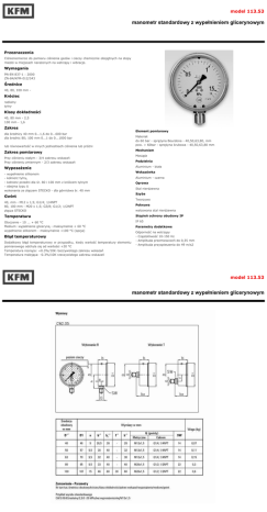 model 113.53 manometr standardowy z wypełnieniem glicerynowym Przeznaczenia Ciśnieniomierze do pomiaru ciśnienia gazów i cieczy chemicznie obojętnych na stopy miedzi w miejscach narażonych na wstrząsy i wibracje. Wymagania PN-EN 837-1 : 2000 ZN-84/KFM-012/343 Średnice 40, 80, 100 mm - Króciec radialny tylny Klasy dokładności 40, 80 mm - 2,5 100 mm - 1,6 Zakres dla średnicy 40 mm 0...1,6 do 0...600 bar dla średnic 80; 100 mm 0...1 do 0...1000 bar lub równowartość w innych jednostkach ciśnienia lub próżni Zakres pomiarowy Przy ciśnieniu stałym - 3/4 zakresu wskazań Przy ciśnieniu zmiennym - 2/3 zakresu wskazań Wyposażenie - wypełnienie silikonem - kołnierz tylny, - kołnierz przedni dla śr. 80 i 100 mm z króćcem tylnym - obejma typu U wykonania ze złączem STECKO - dla górnictwa śr. 40 mm Gwint 40, mm - M12 x 1,5; G1/4; 1/4NPT 80, 100 mm - M20 x 1,5; G3/8; G1/2; 1/2NPT złącza STECKO Element pomiarowy Materiał: do 60 bar - sprężyna Bourdona - 40,50,63,80, mm pow. > 60bar - sprężyna śrubowa - 40,50,63,80 mm Mechanizm Mosiądz Podzielnia Aluminium - biała Wskazówka Aluminium - czarna Oprawa Stal nierdzewna Szyba Tworzywo Pokrywa walcowana stal nierdzewna Temperatura Stopień ochrony obudowy IP Otoczenie - 10 ... + 60 °C Medium: wypełnienie gliceryną - maksymalnie + 60 °C wypełnienie silikonem - maksymalnie +100 °C (opcja) IP 65 Błąd temperaturowy Dodatkowy błąd temperaturowy w przypadku, kiedy wartość temperatury elementu pomiarowego odchyla się od wartości +20 °C Temperatura rosnąca: +0.3%/10K rzeczywistego zakresu wskazań Temperatura malejąca: -0.3%/10K rzeczywistego zakresu wskazań Parametry dodatkowe Odporność na wstrząsy - Częstotliwość 10-150 Hz - Amplituda przemieszczeń do 0,35 mm - Amplituda przyspieszenia do 49 m/s2 model 113.53 manometr standardowy z wypełnieniem glicerynowym