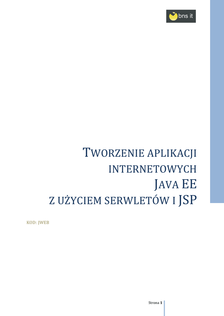 TWORZENIE APLIKACJI INTERNETOWYCH JAVA EE Z UŻYCIEM SERWLETÓW I JSP KOD: JWEB Strona 1 1 Profil uczestnika Uczestnik: posiada doświadczenie w programowaniu w języku Java; posiada ogólną znajomośd języka HTML i zasady działania protokołu HTTP; chce poznad efektywne sposoby tworzenia aplikacji internetowych w technologii Java EE z użyciem serwletów i JSP. Korzyści ze szkolenia 1. Duża intensywnośd szkolenia – w niedługim czasie uczestnik poznaje najbardziej użyteczne aspekty standardowych bibliotek Java, umożliwiających efektywne tworzenie aplikacji internetowych w technologii Java EE. 2. Aplikacje korporacyjne tworzone są w uznanym i sprawdzonym standardzie – serwlety i JSP stanowią standard w technologii Java. 3. Programista potrafi rozwiązywad problemy podczas tworzenia aplikacji – w trakcie szkolenia uczymy, w jaki sposób radzid sobie z potencjalnymi problemami, które mogą pojawid się w trakcie tworzenia projektu. Pokazujemy sprawdzone techniki i triki programistyczne. Strona 2 Parametry szkolenia CZAS TRWANIA: 2 dni – 16 godzin. FORMA ZAJĘĆ: Ćwiczenia - 60%, wykład – 40%. WIELKOŚĆ GRUPY: ok. 10 osób. Szczegółowy program Nabyte wiedza i umiejętności, poruszane zagadnienia Moduły szkoleniowe Wprowadzenie do Java EE Architektura Java EE Zasada działania aplikacji internetowych Wprowadzenie Cienki klient Przegląd HTTP i HTML Podstawy tworzenia serwletów GenericServlet, ServletRequest, ServletResponse HttpServletRequest, HttpServletResponse, HttpServlet Formularze HTML Model żądanie-odpowiedź Nagłówki, metody GET i POST Cykl życia serwletu Serwlety o init() o service() o destroy() Przetwarzanie parametrów RequestDispatcher ServletContext i atrybuty Obsługa błędów Strona 3 3 Architektura JSP Znaczniki i wyrażenia JSP Cykl życia JSP MVC w aplikacjach internetowych – Model 1 i Model 2 JSP Zasięg żądania, aplikacji, sesji i strony Znaczniki <jsp:useBean>, <jsp:getProperty>, <jsp:setProperty>, <jsp:include>, <jsp:forward> Tworzenie własnych znaczników HTTP jako protokół bezstanowy Pola ukryte w formularzach Ciasteczka (cookies) Zarządzanie sesją - przegląd Korzystanie z HttpSession Używanie sesji w komunikacji między serwletami i JSP Obsługa wyjątków na stronach JSP Dyrektywy page, include Zaawansowane elementy serwletów i JSP Deklaracje importu Zagadnienia wielowątkowości w środowisku serwletów Biblioteka JSTL o Wyrażenia o Typy o Operatory o Obiekty niejawne Filtry i ich zastosowanie Przykłady szkieletów aplikacji opartych o serwlety i JSP (Struts, Struts2) Strona 4