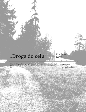 „Droga do celu” 22 czerwca 2007 Historie chłopca, którego nigdy nie znałem i nie poznałem a który był mi bliższy niż inni. Który choć nie był harcerzem w mundurze tak właśnie żył. O chłopcu i jego dziadku. Droga do celu O chłopcu i jego dziadku. Strona 2 phm Arkadiusz Przybysz Strona 3 … dla wszystkich tych, którzy poszukują prawdy w tym, kim są … PROLOG „Drogą do celu.” Strona 4 „On był za młody, jak na tak trudną wędrówkę...” – Słowa te słyszę za każdym razem, kiedy wracają wspomnienia wakacyjne z przed kilkunastu lat. Podczas rodzinnych spotkań, dziadek chcąc utrwalić w mej pamięci wszystkie wspólne wyprawy, zmieniał moich rodziców w kłębek nerwów. Dlaczego, spytacie?! Posłuchajcie. Każde wakacje spędzałem u dziadka w niewielkiej chałupie wśród najpiękniejszych bieszczadzkich połonin. Zazwyczaj chwile te dzieliliśmy na piesze wycieczki po okolicy, zbieranie grzybów i łowienie ryb. Pewnego wieczoru, po wyczerpującym dniu, dziadek wszedł do mojego pokoju z kawałkiem ciasta, w które było wbitych kilka świeczek i powiedział: Skończyłeś dwanaście lat. Jesteś już dużym i odważnym chłopcem. Masz sporą wiedzę pionierską, w jednym paluszku terenoznawstwo, a i samarytanka nie jest ci obca. Przekazałem ci sporą część tego, co mój dziadek mnie, kiedy byłem w twoim wieku. Nadszedł, więc czas żebyś udowodnił, na co Cię stać, byś zdobył miano Wygi i jego niezbędny ekwipunek. Spojrzał na mnie z lekkim uśmiechem i po chwili dodał. Wszystkiego najlepszego, wnusiu. Zdmuchnąłem świeczki, a on pocałował mnie w czoło i powiedział. Do jutra „Mały Orle”. Całą noc próbowałem zasnąć, zastanawiając się, co miał na myśli dziadek. Dopiero nad ranem zmęczenie zamknęło mi oczy. Nagle obudził mnie dźwięk bawolego rogu. Bardzo szybko wstałem i wybiegłem na dwór zobaczyć, co się dzieje. Wschodzące słońce oślepiło mnie, ale po chwili ujrzałem kontur postaci zarysowany światłem. Dopiero wtedy ucichło echo rogu, w które dmuchał dziadek. Podejdź! Stanowczo powiedział i wyjął zza pleców starą pożółkłą mapę, na której zaznaczone były dwa punkty z kolejno zapisanymi azymutami. Po chwili sięgnął mój plecak i powiedział: Masz piętnaście minut na spakowanie niezbędnych rzeczy. Szybko chwyciłem plecak i pobiegłem do domu. W głowie pomiędzy myślami o tym, co powiedział dziadek i dlaczego, układałem sobie listę rzeczy, które zawsze zabieraliśmy na wędrówkę. Wbiegłem do pokoju i po za tymi właśnie przedmiotami nie widziałem nic innego. Jakby ktoś celowo je podświetlił. Zbierając wszystko do plecaka zauważyłem jak dziadek podgląda mnie przez szczelinę w drzwiach. Sprawdzając czy czegoś nie pominąłem. Czy czasem nie biorę „zbędnego balastu”. Już czas. Wychodź! Usłyszałem i wybiegłem na pole. Czas już wyruszyć! Powiedział dziadek spoglądając na stary wskazówkowy zegarek. Tak właśnie zaczęła się wędrówka mojego życia. Wędrówka po dziesięciu punktach. Wędrówka z „Drogą do celu”. Strona 5 pierwszy punkt prawa harcerskiego Strona Z mapą w ręku, niewielkim ekwipunkiem i suchym prowiantem, niepewnie postawiłem pierwsze kroki. Im bardziej oddalałem się od chaty tym szybciej i nerwowo biło mi serce. Nie odwracałem się by spojrzeć w stronę gdzie mógł stać dziadek, patrząc się na mnie, jak znikam za pierwszym wzgórzem. Przeszedłem kilka kilometrów w stanie odrętwienia ze względu na sytuację, w której się obecnie znajdowałem. W myślach wciąż przewijały się pytania: Gdzie idę?- Choć droga nie była mi obca. Co mnie czeka na szlaku? – Choć i tego mogłem się po trosze domyślać. Nagle, moim oczom ukazało się miejsce, zaznaczone na mapie literką „P”. P jako „początek”? Czy przerwa po pierwszej części wędrówki? Pomyślałem, że warto by było jednak odpocząć i posilić się przed dalszą drogą. Usiadłem, więc na największym kamieniu, który leżał tuż obok pięknego, rosłego drzewa. Na szczęście dla mnie, w cieniu. Szukając kanapek w plecaku zauważyłem jakąś kopertę. Wcześniej jej tu nie było. Wyjąłem ją i od razu poznałem, że to od dziadka. Zaciekawiony tym, co jest w środku szybko zapomniałem o zmęczeniu. Chwyciłem za finkę i już chciałem otworzyć, starannie zaklejoną kopertę, kiedy zza moich pleców rozległ się męski głos. - Skąd ta pewność, że ten list jest do Ciebie młodzieńcu. Przestraszony, szybko odwróciłem się do tyłu, a moim oczom ukazał się jeden z tych, bieszczadzkich przewodników, sławionych przez mojego dziadka. - Dokładnie obejrzyj to, co trzymasz w ręku. Surowo spojrzał się na mnie i palcem wskazał na kopertę. Pochyliłem głowę, a na jednej ze stron widniał napis „Do mojego najlepszego przyjaciela”. - A skąd u Pana ta pewność, że to do Pana? W końcu nie ma tu napisanego nazwiska! Tym razem to ja spytałem z miną podobną do tej, którą miał przewodnik. - Spójrz jeszcze raz! Powiedział i wyciągnął dłoń jakby czekał, aż podam mu jego list. Powoli opuszczałem głowę, wciąż patrząc w jego oczy. - Na list patrz, na list. Nie byłem do końca pewny czy mam to zrobić. Ogarnęły mnie dziwne uczucia, dostałem drgawek. W jednej chwili zrobiło się zimno i nie wiadomo skąd pojawiły się chmury. Podniosłem, oparte na kolanach ręce i jeszcze raz przeczytałem tekst na kopercie. Wyraz po wyrazie upewniałem się, że mam racje. Jednak, kiedy doczytałem do ostatniego słowa moim oczom zaczęły ukazywać się pojedyncze litery. Jakby ktoś właśnie w tej chwili je pisał: „Do mojego najlepszego przyjaciela...Gerarda„. Ze zdziwienia upuściłem list, ale zanim dotknął ziemi, mężczyzna stojący przede mną chwycił go w locie. Otworzył kopertę, przeczytał i powiedział. - Musimy szybko iść. Mamy mało czasu. Po drodze Ci wszystko wyjaśnię. A teraz zbi
