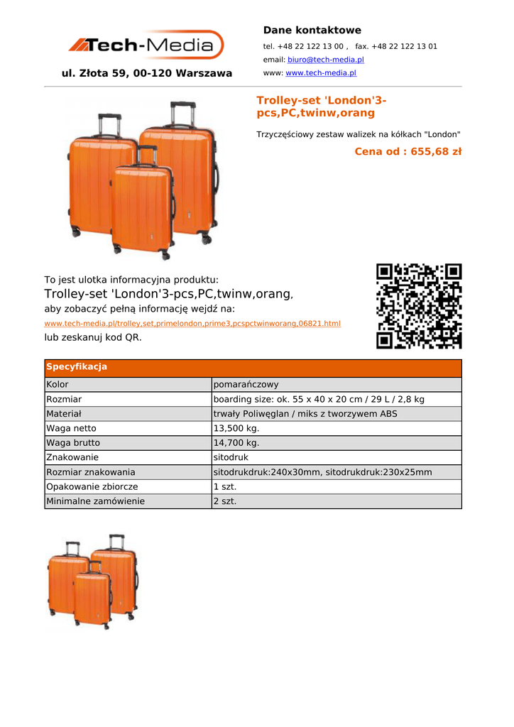 Dane kontaktowe tel. +48 22 122 13 00 , fax. +48 22 122 13 01 email: [email protected] ul. Złota 59, 00-120 Warszawa www: www.tech-media.pl Trolley-set 'London'3pcs,PC,twinw,orang Trzyczęściowy zestaw walizek na kółkach "London" Cena od : 655,68 zł To jest ulotka informacyjna produktu: Trolley-set 'London'3-pcs,PC,twinw,orang, aby zobaczyć pełną informację wejdź na: www.tech-media.pl/trolley,set,primelondon,prime3,pcspctwinworang,06821.html lub zeskanuj kod QR. Specyfikacja Kolor pomarańczowy Rozmiar boarding size: ok. 55 x 40 x 20 cm / 29 L / 2,8 kg Materiał trwały Poliwęglan / miks z tworzywem ABS Waga netto 13,500 kg. Waga brutto 14,700 kg. Znakowanie sitodruk Rozmiar znakowania sitodrukdruk:240x30mm, sitodrukdruk:230x25mm Opakowanie zbiorcze 1 szt. Minimalne zamówienie 2 szt.