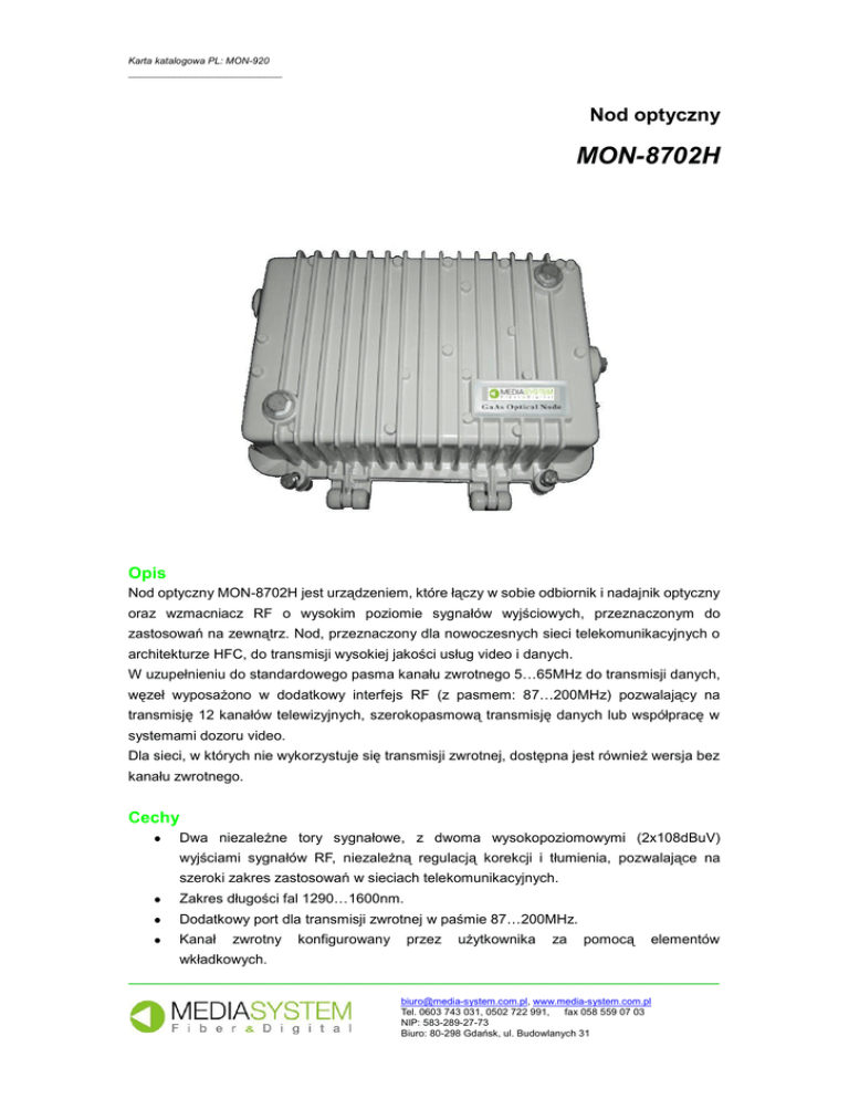 Karta katalogowa PL: MON-920 ___________________________ Nod optyczny MON-8702H Opis Nod optyczny MON-8702H jest urządzeniem, które łączy w sobie odbiornik i nadajnik optyczny oraz wzmacniacz RF o wysokim poziomie sygnałów wyjściowych, przeznaczonym do zastosowań na zewnątrz. Nod, przeznaczony dla nowoczesnych sieci telekomunikacyjnych o architekturze HFC, do transmisji wysokiej jakości usług video i danych. W uzupełnieniu do standardowego pasma kanału zwrotnego 5…65MHz do transmisji danych, węzeł wyposażono w dodatkowy interfejs RF (z pasmem: 87…200MHz) pozwalający na transmisję 12 kanałów telewizyjnych, szerokopasmową transmisję danych lub współpracę w systemami dozoru video. Dla sieci, w których nie wykorzystuje się transmisji zwrotnej, dostępna jest również wersja bez kanału zwrotnego. Cechy Dwa niezależne tory sygnałowe, z dwoma wysokopoziomowymi (2x108dBuV) wyjściami sygnałów RF, niezależną regulacją korekcji i tłumienia, pozwalające na szeroki zakres zastosowań w sieciach telekomunikacyjnych. Zakres długości fal 1290…1600nm. Dodatkowy port dla transmisji zwrotnej w paśmie 87…200MHz. Kanał zwrotny konfigurowany przez użytkownika za pomocą elementów wkładkowych. _______________________________________________________________________ [email protected], www.media-system.com.pl Tel. 0603 743 031, 0502 722 991, fax 058 559 07 03 NIP: 583-289-27-73 Biuro: 80-298 Gdańsk, ul. Budowlanych 31 Karta katalogowa PL: MON-920 ___________________________ Dwa niezależne tory kanału zwrotnego - możliwość zastosowania dwóch nadajników optycznych – opcja. Montaż w technologii SMD oraz konfiguracja wysokopoziomowego wzmacniacza w technologii GaAs Power Doubler zapewniają wysoką niezawodność i liniowość. Obudowa zapewniająca znakomite zabezpieczenie przed wilgocią i bardzo skuteczne ekranowanie elektromagnetyczne. Wejście testowe wejściowej mocy optycznej; sygnalizacja świetlna (LED) normalnego i zbyt wysokiego poziomu sygnału optycznego. Zasilacz impulsowy dla zasilania lokalnego i zdalnego. Korzystny stosunek jakości do ceny, umożliwiający stosownie nodów nawet w średnich i małych sieciach CATV. Parametry techniczne Wartość Parametr Parametry optyczne i RF, transmisja w przód Wejściowa moc optyczna Zakres odbieranych długości fal Typ złącza optycznego Typ włókna -6…+2dBm 1310…1600nm SC/APC jednomodowe Poziom sygnału wyjściowego C/N (20km włókno, 0dBm) ≥108dBµV (przy mocy wejściowej -1 dBm) ≥51dB CSO ≥63dB CTB ≥65dB Zakres częstotliwości 5…862MHz Nierównomierność charakterystyki Tłumienie odbić ≥16dB (5…860MHz) Impedancja wyjściowa Transmisja wstecz ±0.75dB 75Ω (opcja) Długość fali Typ lasera nadawczego Wyjściowa moc optyczna Poziom sygnału wejściowego 1310±10nm FP / DFB (opcja) ≥1mW 80…98dBμV Typ Złącza optycznego SC/APC Impedancja wyjściowa 75Ω Pozostałe Napięcie zasilające Moc pobierana Zakres temp. pracy AC 60V 35W -20˚C…+50˚C _______________________________________________________________________ [email protected], www.media-system.com.pl Tel. 0603 743 031, 0502 722 991, fax 058 559 07 03 NIP: 583-289-27-73 Biuro: 80-298 Gdańsk, ul. Budowlanych 31 Karta katalogowa PL: MON-920 ___________________________ Schemat blokowy Widok – elementy regulacyjne _______________________________________________________________________ [email protected], www.media-system.com.pl Tel. 0603 743 031, 0502 722 991, fax 058 559 07 03 NIP: 583-289-27-73 Biuro: 80-298 Gdańsk, ul. Budowlanych 31 Karta katalogowa PL: MON-920 ___________________________ Widok – część RF / część optyczna _______________________________________________________________________ [email protected], www.media-system.com.pl Tel. 0603 743 031, 0502 722 991, fax 058 559 07 03 NIP: 583-289-27-73 Biuro: 80-298 Gdańsk, ul. Budowlanych 31