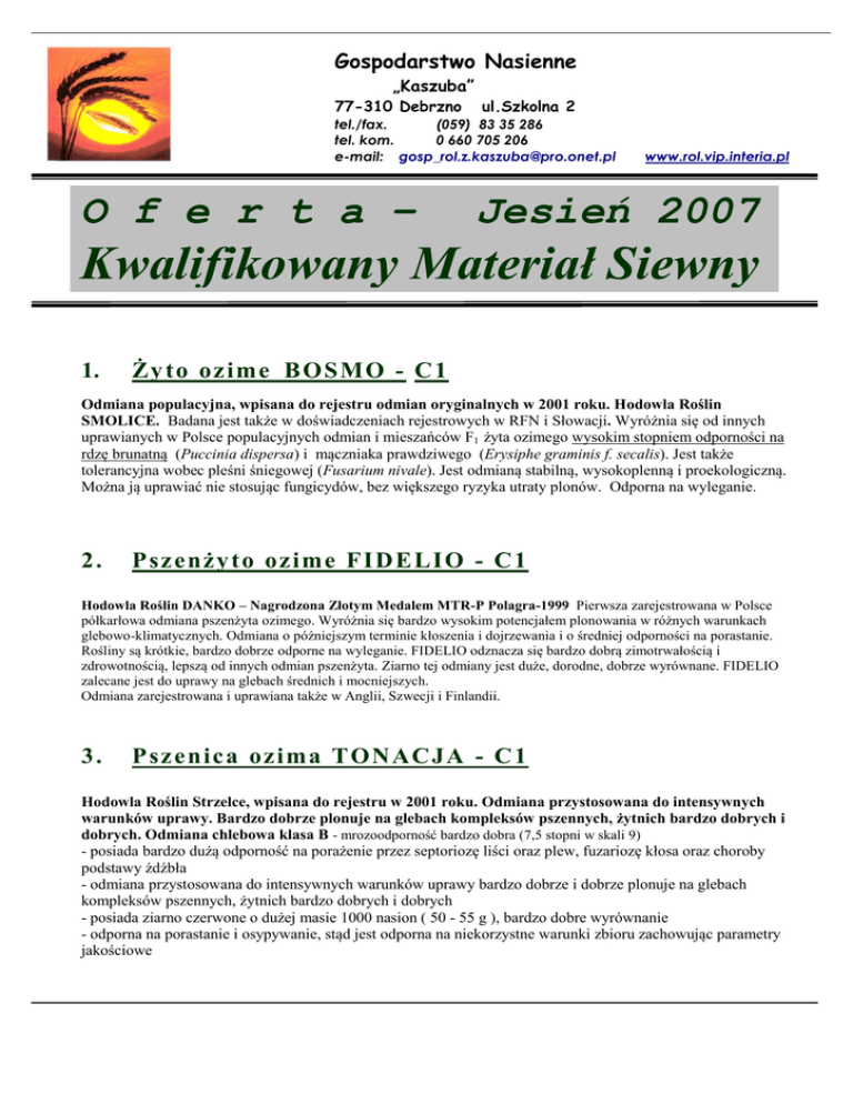 Gospodarstwo Nasienne „Kaszuba” 77-310 Debrzno ul.Szkolna 2 tel./fax. (059) 83 35 286 tel. kom. 0 660 705 206 e-mail: [email protected] O f e r t a – www.rol.vip.interia.pl Jesień 2007 Kwalifikowany Materiał Siewny 1. Ży to oz ime B OSMO - C 1 Odmiana populacyjna, wpisana do rejestru odmian oryginalnych w 2001 roku. Hodowla Roślin SMOLICE. Badana jest także w doświadczeniach rejestrowych w RFN i Słowacji. Wyróżnia się od innych uprawianych w Polsce populacyjnych odmian i mieszańców F1 żyta ozimego wysokim stopniem odporności na rdzę brunatną (Puccinia dispersa) i mączniaka prawdziwego (Erysiphe graminis f. secalis). Jest także tolerancyjna wobec pleśni śniegowej (Fusarium nivale). Jest odmianą stabilną, wysokoplenną i proekologiczną. Można ją uprawiać nie stosując fungicydów, bez większego ryzyka utraty plonów. Odporna na wyleganie. 2. Psz enży to oz ime FID E L IO - C 1 Hodowla Roślin DANKO – Nagrodzona Złotym Medalem MTR-P Polagra-1999 Pierwsza zarejestrowana w Polsce półkarłowa odmiana pszenżyta ozimego. Wyróżnia się bardzo wysokim potencjałem plonowania w różnych warunkach glebowo-klimatycznych. Odmiana o późniejszym terminie kłoszenia i dojrzewania i o średniej odporności na porastanie. Rośliny są krótkie, bardzo dobrze odporne na wyleganie. FIDELIO odznacza się bardzo dobrą zimotrwałością i zdrowotnością, lepszą od innych odmian pszenżyta. Ziarno tej odmiany jest duże, dorodne, dobrze wyrównane. FIDELIO zalecane jest do uprawy na glebach średnich i mocniejszych. Odmiana zarejestrowana i uprawiana także w Anglii, Szwecji i Finlandii. 3. Psz enica oz ima T ON AC JA - C 1 Hodowla Roślin Strzelce, wpisana do rejestru w 2001 roku. Odmiana przystosowana do intensywnych warunków uprawy. Bardzo dobrze plonuje na glebach kompleksów pszennych, żytnich bardzo dobrych i dobrych. Odmiana chlebowa klasa B - mrozoodporność bardzo dobra (7,5 stopni w skali 9) - posiada bardzo dużą odporność na porażenie przez septoriozę liści oraz plew, fuzariozę kłosa oraz choroby podstawy źdźbła - odmiana przystosowana do intensywnych warunków uprawy bardzo dobrze i dobrze plonuje na glebach kompleksów pszennych, żytnich bardzo dobrych i dobrych - posiada ziarno czerwone o dużej masie 1000 nasion ( 50 - 55 g ), bardzo dobre wyrównanie - odporna na porastanie i osypywanie, stąd jest odporna na niekorzystne warunki zbioru zachowując parametry jakościowe