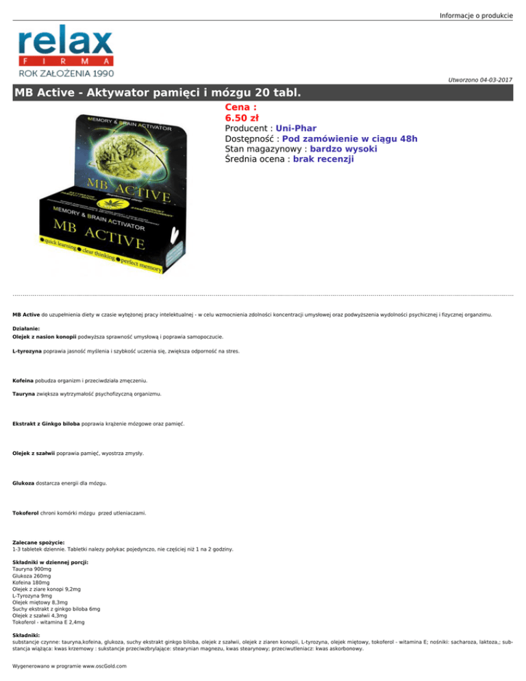 Informacje o produkcie Utworzono 04-03-2017 MB Active - Aktywator pamięci i mózgu 20 tabl. Cena : 6.50 zł Producent : Uni-Phar Dostępność : Pod zamówienie w ciągu 48h Stan magazynowy : bardzo wysoki Średnia ocena : brak recenzji MB Active do uzupełnienia diety w czasie wytężonej pracy intelektualnej - w celu wzmocnienia zdolności koncentracji umysłowej oraz podwyższenia wydolności psychicznej i fizycznej organzimu. Działanie: Olejek z nasion konopii podwyższa sprawność umysłową i poprawia samopoczucie. L-tyrozyna poprawia jasność myślenia i szybkość uczenia się, zwiększa odporność na stres. Kofeina pobudza organizm i przeciwdziała zmęczeniu. Tauryna zwiększa wytrzymałość psychofizyczną organizmu. Ekstrakt z Ginkgo biloba poprawia krążenie mózgowe oraz pamięć. Olejek z szałwii poprawia pamięć, wyostrza zmysły. Glukoza dostarcza energii dla mózgu. Tokoferol chroni komórki mózgu przed utleniaczami. Zalecane spożycie: 1-3 tabletek dziennie. Tabletki nalezy połykac pojedynczo, nie częściej niż 1 na 2 godziny. Składniki w dziennej porcji: Tauryna 900mg Glukoza 260mg Kofeina 180mg Olejek z ziare konopi 9,2mg L-Tyrozyna 9mg Olejek miętowy 8,3mg Suchy ekstrakt z ginkgo biloba 6mg Olejek z szałwii 4,3mg Tokoferol - witamina E 2,4mg Składniki: substancje czynne: tauryna,kofeina, glukoza, suchy ekstrakt ginkgo biloba, olejek z szałwii, olejek z ziaren konopii, L-tyrozyna, olejek miętowy, tokoferol - witamina E; nośniki: sacharoza, laktoza,; substancja wiążąca: kwas krzemowy : sukstancje przeciwzbrylające: stearynian magnezu, kwas stearynowy; przeciwutleniacz: kwas askorbonowy. Wygenerowano w programie www.oscGold.com Ostrzezenia: Produkt nie jest wskazany dla małych dzieci, kobiet w ciąży i w okresie karmienia oraz dla osób uczulonych na składniki preparatu Opakowanie: 20 tabletek