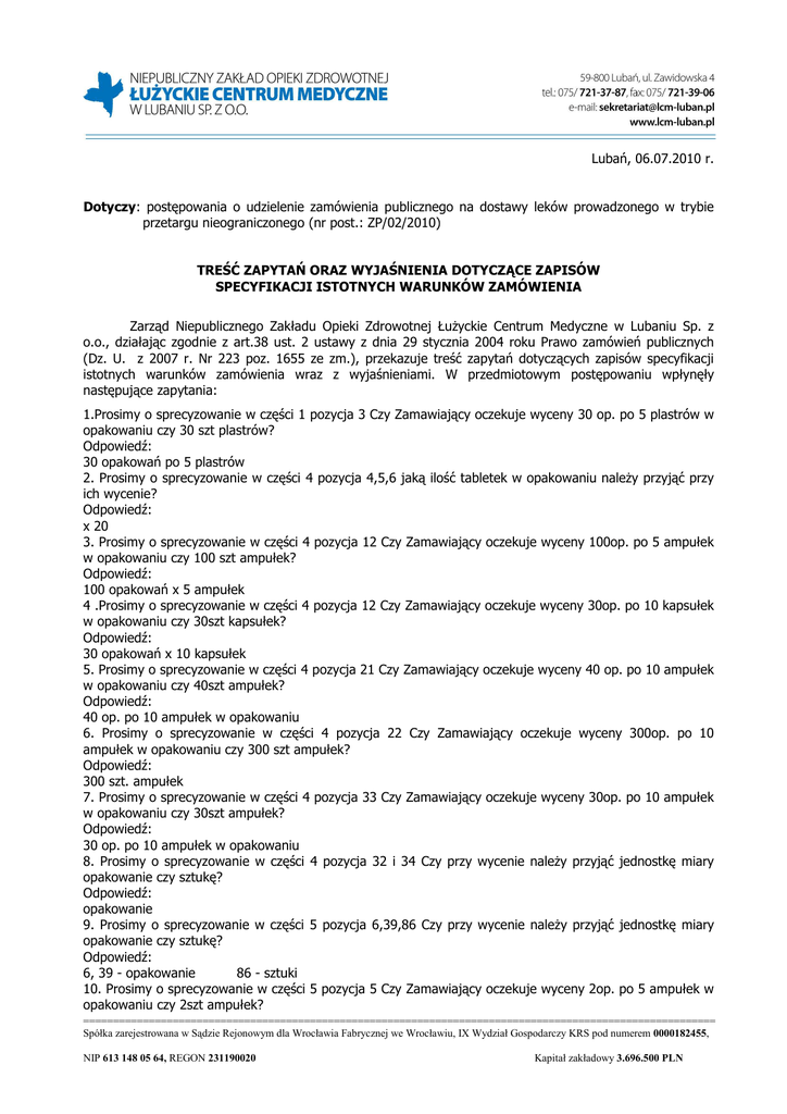Lubań, 06.07.2010 r. Dotyczy: postępowania o udzielenie zamówienia publicznego na dostawy leków prowadzonego w trybie przetargu nieograniczonego (nr post.: ZP/02/2010) TREŚĆ ZAPYTAŃ ORAZ WYJAŚNIENIA DOTYCZĄCE ZAPISÓW SPECYFIKACJI ISTOTNYCH WARUNKÓW ZAMÓWIENIA Zarząd Niepublicznego Zakładu Opieki Zdrowotnej Łużyckie Centrum Medyczne w Lubaniu Sp. z o.o., działając zgodnie z art.38 ust. 2 ustawy z dnia 29 stycznia 2004 roku Prawo zamówień publicznych (Dz. U. z 2007 r. Nr 223 poz. 1655 ze zm.), przekazuje treść zapytań dotyczących zapisów specyfikacji istotnych warunków zamówienia wraz z wyjaśnieniami. W przedmiotowym postępowaniu wpłynęły następujące zapytania: 1.Prosimy o sprecyzowanie w części 1 pozycja 3 Czy Zamawiający oczekuje wyceny 30 op. po 5 plastrów w opakowaniu czy 30 szt plastrów? Odpowiedź: 30 opakowań po 5 plastrów 2. Prosimy o sprecyzowanie w części 4 pozycja 4,5,6 jaką ilość tabletek w opakowaniu należy przyjąć przy ich wycenie? Odpowiedź: x 20 3. Prosimy o sprecyzowanie w części 4 pozycja 12 Czy Zamawiający oczekuje wyceny 100op. po 5 ampułek w opakowaniu czy 100 szt ampułek? Odpowiedź: 100 opakowań x 5 ampułek 4 .Prosimy o sprecyzowanie w części 4 pozycja 12 Czy Zamawiający oczekuje wyceny 30op. po 10 kapsułek w opakowaniu czy 30szt kapsułek? Odpowiedź: 30 opakowań x 10 kapsułek 5. Prosimy o sprecyzowanie w części 4 pozycja 21 Czy Zamawiający oczekuje wyceny 40 op. po 10 ampułek w opakowaniu czy 40szt ampułek? Odpowiedź: 40 op. po 10 ampułek w opakowaniu 6. Prosimy o sprecyzowanie w części 4 pozycja 22 Czy Zamawiający oczekuje wyceny 300op. po 10 ampułek w opakowaniu czy 300 szt ampułek? Odpowiedź: 300 szt. ampułek 7. Prosimy o sprecyzowanie w części 4 pozycja 33 Czy Zamawiający oczekuje wyceny 30op. po 10 ampułek w opakowaniu czy 30szt ampułek? Odpowiedź: 30 op. po 10 ampułek w opakowaniu 8. Prosimy o sprecyzowanie w części 4 pozycja 32 i 34 Czy przy wycenie należy przyjąć jednostkę miary opakowanie czy sztukę? Odpowiedź: opakowanie 9. Prosimy o sprecyzowanie w części 5 pozycja 6,39,86 Czy przy wycenie należy przyjąć jednostkę miary opakowanie czy sztukę? Odpowiedź: 6, 39 - opakowanie 86 - sztuki 10. Prosimy o sprecyzowanie w części 5 pozycja 5 Czy Zamawiający oczekuje wyceny 2op. po 5 ampułek w opakowaniu czy 2szt ampułek? ========================================================================================================== Spółka zarejestrowana w Sądzie Rejonowym dla Wrocławia Fabrycznej we Wrocławiu, IX Wydział Gospodarczy KRS pod numerem 0000182455, NIP 613 148 05 64, REGON 231190020 Kapitał zakładowy 3.696.500 PLN Odpowiedź: 2 szt. ampułek 11. Prosimy o sprecyzowanie w części 5 pozycja 24 Czy Zamawiający oczekuje wyceny 75op. po 10 ampułko-strzykawek w opakowaniu czy 75szt ampułko-strzykawek? Odpowiedź: 75 op. po 10 ampułko-strzykawek w opakowaniu 12. Prosimy o sprecyzowanie w części 5 pozycja 29 Czy Zamawiający oczekuje wyceny 150op. po 10 ampułko-strzykawek w opakowaniu czy 150szt ampułko-strzykawek? Odpowiedź: 150 op. po 10 ampułko-strzykawek w opakowaniu 13. Prosimy o sprecyzowanie w części 5 pozycja 30 Czy Zamawiający oczekuje wyceny 10op. po 10 ampułko-strzykawek w opakowaniu czy 10szt ampułko-strzykawek? Odpowiedź: 10 op. po 10 ampułko-strzykawek w opakowaniu 14. Prosimy o sprecyzowanie w części 5 pozycja 35 Czy Zamawiający oczekuje wyceny 3500op. po 5 ampułek w opakowaniu czy 3500szt ampułek? Odpowiedź: 3500 op. po 5 ampułek w opakowaniu 15. Prosimy o sprecyzowanie w części 5 pozycja 46 Czy Zamawiający oczekuje wyceny 500op. po 10 ampułek w opakowaniu czy 500szt ampułek? Odpowiedź: 500 szt. ampułek 16. Prosimy o sprecyzowanie w części 5 pozycja 47 Czy Zamawiający oczekuje wyceny 1000op. po 10ampułek w opakowaniu czy 1000szt ampułek? Odpowiedź: 1000 szt ampułek 17.Dotyczy części 5 pozycji 89 Czy Zamawiający miał na myśli wycenę Phenylbutazonum + lidocaine ,inj. 200mg/ml 3ml ampułki x 5 ? Odpowiedź: tak 18.Prosimy o sprecyzowanie jaką gramaturę żelu Zamawiający miał na myśli w części 8 pozycji 2? Odpowiedź: 75,0 19. Prosimy o sprecyzowanie jaką gramaturę żelu Zamawiający miał na myśli w części 8 pozycji 11? Odpowiedź: 50,0 20. .Prosimy o sprecyzowanie jaką postać gencjany Zamawiający miał na myśli w części 8 pozycji 20 i 41.Roztwór wodny czy spirytusowy? Odpowiedź: Pozycja 20 – roztwór spirytusowy, pozycja 41 – roztwór wodny 21.Dotyczy części 8 pozycji 36.Czy Zamawiający dopuści wycenę lidocainy w ampułko-strzykawce po 6ml ? Jeśli Zamawiający wyrazi zgodę ,prosimy o sprecyzowanie jaką ilość opakowań należy wówczas wycenić? Odpowiedź: Zamawiający dopuszcza wycenę lidocainy w ampułko-strzykawce po 6ml – 15 opakowań x 10 ampułkostrzykawek 22.Dotyczy części 8 pozycji 28 .Lek pakowany obecnie po 15 g .Prosimy o określenie czy należy wycenić 10op. po 15g czy przeliczyć ? Odpowiedź: wycenić 10 op. po 15g 23.Prosimy o określenie jakiego produktu zamawiający wymaga w części 9 pozycji 10. AMILORIDUM+HYDROCHLOROTHIAZIDUM O 1-D 0,0025+0,025 G-Tailorid Mitle tabl x 50.Czy AMILORIDUM+HYDROCHLOROTHIAZIDUM O 1-D 0,005+0,05 G-Talorid tabl x 50? Odpowiedź: Tialorid mitte ========================================================================================================== Spółka zarejestrowana w Sądzie Rejonowym dla Wrocławia Fabrycznej we Wrocławiu, IX Wydział Gospodarczy KRS pod numerem 0000182455, NIP 613 148 05 64, REGON 231190020 Kapitał zakładowy 3.696.500 PLN 24. Prosimy o sprecyzowanie w części 9 pozycja 33 Czy Zamawiający oczekuje wyceny 3op. po 30 tabletek w opakowaniu czy 3 szt tabletek? Odpowiedź: 3 op. po 30 tabletek w opakowaniu 25.Czy można wycenić leki w opakowaniu innej wielkości niż żądana przez Zmawiającego, a ilość opakowań odpowiednio przeliczyć tak, aby liczba sztuk była zgodna z SIWZ? Odpo