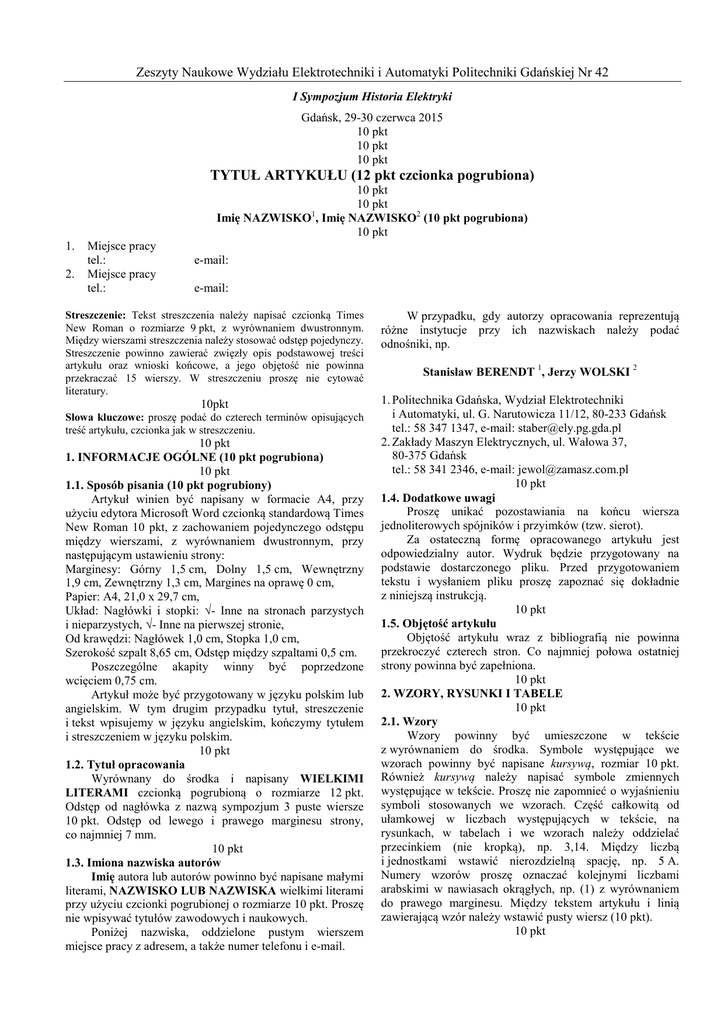 Zeszyty Naukowe Wydziału Elektrotechniki i Automatyki Politechniki Gdańskiej Nr 42 I Sympozjum Historia Elektryki Gdańsk, 29-30 czerwca 2015 10 pkt 10 pkt 10 pkt TYTUŁ ARTYKUŁU (12 pkt czcionka pogrubiona) 10 pkt 10 pkt Imię NAZWISKO1, Imię NAZWISKO2 (10 pkt pogrubiona) 10 pkt 1. 2. Miejsce pracy tel.: Miejsce pracy tel.: e-mail: e-mail: Streszczenie: Tekst streszczenia należy napisać czcionką Times New Roman o rozmiarze 9 pkt, z wyrównaniem dwustronnym. Między wierszami streszczenia należy stosować odstęp pojedynczy. Streszczenie powinno zawierać zwięzły opis podstawowej treści artykułu oraz wnioski końcowe, a jego objętość nie powinna przekraczać 15 wierszy. W streszczeniu proszę nie cytować literatury. 10pkt Słowa kluczowe: proszę podać do czterech terminów opisujących treść artykułu, czcionka jak w streszczeniu. 10 pkt 1. INFORMACJE OGÓLNE (10 pkt pogrubiona) 10 pkt 1.1. Sposób pisania (10 pkt pogrubiony) Artykuł winien być napisany w formacie A4, przy użyciu edytora Microsoft Word czcionką standardową Times New Roman 10 pkt, z zachowaniem pojedynczego odstępu między wierszami, z wyrównaniem dwustronnym, przy następującym ustawieniu strony: Marginesy: Górny 1,5 cm, Dolny 1,5 cm, Wewnętrzny 1,9 cm, Zewnętrzny 1,3 cm, Margines na oprawę 0 cm, Papier: A4, 21,0 x 29,7 cm, Układ: Nagłówki i stopki: √- Inne na stronach parzystych i nieparzystych, √- Inne na pierwszej stronie, Od krawędzi: Nagłówek 1,0 cm, Stopka 1,0 cm, Szerokość szpalt 8,65 cm, Odstęp między szpaltami 0,5 cm. Poszczególne akapity winny być poprzedzone wcięciem 0,75 cm. Artykuł może być przygotowany w języku polskim lub angielskim. W tym drugim przypadku tytuł, streszczenie i tekst wpisujemy w języku angielskim, kończymy tytułem i streszczeniem w języku polskim. 10 pkt 1.2. Tytuł opracowania Wyrównany do środka i napisany WIELKIMI LITERAMI czcionką pogrubioną o rozmiarze 12 pkt. Odstęp od nagłówka z nazwą sympozjum 3 puste wiersze 10 pkt. Odstęp od lewego i prawego marginesu strony, co najmniej 7 mm. 10 pkt 1.3. Imiona nazwiska autorów Imię autora lub autorów powinno być napisane małymi literami, NAZWISKO LUB NAZWISKA wielkimi literami przy użyciu czcionki pogrubionej o rozmiarze 10 pkt. Proszę nie wpisywać tytułów zawodowych i naukowych. Poniżej nazwiska, oddzielone pustym wierszem miejsce pracy z adresem, a także numer telefonu i e-mail. W przypadku, gdy autorzy opracowania reprezentują różne instytucje przy ich nazwiskach należy podać odnośniki, np. Stanisław BERENDT 1, Jerzy WOLSKI 2 1. Politechnika Gdańska, Wydział Elektrotechniki i Automatyki, ul. G. Narutowicza 11/12, 80-233 Gdańsk tel.: 58 347 1347, e-mail: [email protected] 2. Zakłady Maszyn Elektrycznych, ul. Wałowa 37, 80-375 Gdańsk tel.: 58 341 2346, e-mail: [email protected] 10 pkt 1.4. Dodatkowe uwagi Proszę unikać pozostawiania na końcu wiersza jednoliterowych spójników i przyimków (tzw. sierot). Za ostateczną formę opracowanego artykułu jest odpowiedzialny autor. Wydruk będzie przygotowany na podstawie dostarczonego pliku. Przed przygotowaniem tekstu i wysłaniem pliku proszę zapoznać się dokładnie z niniejszą instrukcją. 10 pkt 1.5. Objętość artykułu Objętość artykułu wraz z bibliografią nie powinna przekroczyć czterech stron. Co najmniej połowa ostatniej strony powinna być zapełniona. 10 pkt 2. WZORY, RYSUNKI I TABELE 10 pkt 2.1. Wzory Wzory powinny być umieszczone w tekście z wyrównaniem do środka. Symbole występujące we wzorach powinny być napisane kursywą, rozmiar 10 pkt. Również kursywą należy napisać symbole zmiennych występujące w tekście. Proszę nie zapomnieć o wyjaśnieniu symboli stosowanych we wzorach. Część całkowitą od ułamkowej w liczbach występujących w tekście, na rysunkach, w tabelach i we wzorach należy oddzielać przecinkiem (nie kropką), np. 3,14. Między liczbą i jednostkami wstawić nierozdzielną spację, np. 5 A. Numery wzorów proszę oznaczać kolejnymi liczbami arabskimi w nawiasach okrągłych, np. (1) z wyrównaniem do prawego marginesu. Między tekstem artykułu i linią zawierającą wzór należy wstawić pusty wiersz (10 pkt). 10 pkt 1 n (1) (xi − x śr )2 n − 1 i =1 10pkt gdzie: n – liczba pomiarów, xi – wynik kolejnego pomiaru, xśr – wartość średnia z n pomiarów. 10 pkt 2.2. Rysunki Rysunki z zachowaniem skali szarości powinny być umieszczone w tekście w odpowiednio wybranym miejscu (po odwołaniu do danego rysunku), z wyrównaniem do środka. 10 pkt s= ∑ 10 pkt Rys. 1. Właściwości dynamiczne przetwornika drugiego rzędu w przypadku odkształconego sygnału wejściowego (czcionka 9 pkt) 10 pkt Proszę zwrócić uwagę, czy po wydruku wszystkie szczegóły i teksty na rysunku są czytelne i wystarczającej wielkości. Proszę też sprawdzić, czy kolorowe oznaczenia (np. linie na wykresach) są czytelne na czarno-białym wydruku. Rysunkom należy przyporządkować kolejne numery arabskie, które wraz z opisem czcionką 9 pkt winny być umieszczone pod rysunkiem z wyrównaniem akapitu do środka. Między tekstem i rysunkiem należy wprowadzić pusty wiersz 10 pkt, między podpisem rysunku i dalszą częścią tekstu należy również pozostawić pusty wiersz 10 pkt. Przy powoływaniu się w tekście na rysunek o określonym numerze nie należy stosować skrótu „rys. 5”, należy napisać np. „przebieg zmian temperatury przedstawiono na rysunku 5”. W przypadku powoływania się na rysunek bez dodatkowego opisu stosuje się w nawiasie skrót „(rys. 5)”. Bardziej złożone rysunki mogą zajmować dwie szpalty. W przypadku wykorzystania rysunków, które nie są wykonane przez autorów artykułu, należy podać źródła ich pochodzenia przez umieszczenie w podpisie rysunku numeru pozycji bibliografii w nawiasie kwadratowym np. [1]. 10 pkt 2.3. Tablice Tablice powinny być umieszczone centralnie w tekście artykułu. Przypor