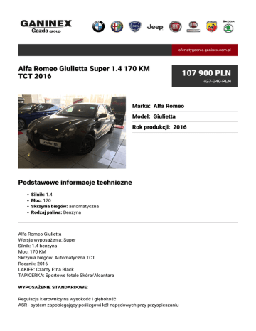 ofertatygodnia.ganinex.com.pl Alfa Romeo Giulietta Super 1.4 170 KM TCT 2016 107 900 PLN Marka: Alfa Romeo Model: Giulietta Rok produkcji: 2016 Podstawowe informacje techniczne Silnik: 1.4 Moc: 170 Skrzynia biegów: automatyczna Rodzaj paliwa: Benzyna Alfa Romeo Giulietta Wersja wyposażenia: Super Silnik: 1.4 benzyna Moc: 170 KM Skrzynia biegów: Automatyczna TCT Rocznik: 2016 LAKIER: Czarny Etna Black TAPICERKA: Sportowe fotele Skóra/Alcantara WYPOSAŻENIE STANDARDOWE: Regulacja kierownicy na wysokość i głębokość ASR - system zapobiegający poślizgowi kół napędowych przy przyspieszaniu 127 040 PLN Szyby tylne sterowane elektrycznie Szyby przednie sterowane elektrycznie Lusterka zewnętrzne sterowane elektrycznie z funkcja usuwania zaparowania Korektor ustawienia reflektorów Światła przednie przeciwmgielne Podłokietnik przedni miedzy siedzeniami Klimatyzacja automatyczna dwustrefowa Tylna kanapa składana i dzielona (60/40) Podłokietnik tylny ze schowkiem + 3-ci tylny zagłówek Koło kierownicy obszyte skóra Czujnik pomiaru ciśnienia w oponach Podkładka pod tablice rejestracyjna System kontroli trakcji vdc z samoblokującym mechanizmem elektronicznym Alfa Q2 Dywaniki welurowe Tempomat (cruise control) Komputer pokładowy (trip computer) Zestaw naprawczy do opon fix&go Schowek przedni Dezaktywacja poduszki powietrznej przedniej po stronie pasażera Wykończenie sportowe zegarów Łopatki w kolumnie kierownicy do zmiany biegów do skrzyni automatycznej Alfa TCT Poduszka powietrzna kierowcy Poduszka powietrzna przednia pasażera Poduszki powietrzne przednie boczne Czujnik temperatury zewnętrznej System alfa dna - system kontroli dynamiki pojazdu WYPOSAŻENIE DODATKOWE: Spryskiwacze przednich reflektorów Autoalarm fabryczny Reflektory bi-ksenonowe z funkcja AFS Zaciski hamulców o zwiększonych wymiarach lakierowane na czerwono Koło zapasowe / dojazdowe do kół o wymiarach R17'' i R18'' (125/80 r17) Lakier metalizowany Koła ze stopów lekkich oksydowane 18" Obramowania szyb bocznych w kolorze czarnym dla pakietu veloce Siedzenia alcantara / skóra z zintegrowanym zagłówkiem Pakiet Business Pakiet Veloce Katowice Katowice (Škoda) Pszczyna Gliwice Gliwice (BMW) al. Roździeńskiego 170 tel. 32 351 27 50 al. Roździeńskiego 182 tel. 32 203 66 00 ul. Bielska 31c tel. 32 210 10 00 ul. Pszczyńska 306 tel. 32 230 17 30 ul. Pszczyńska 322 tel. 32 700 10 00
