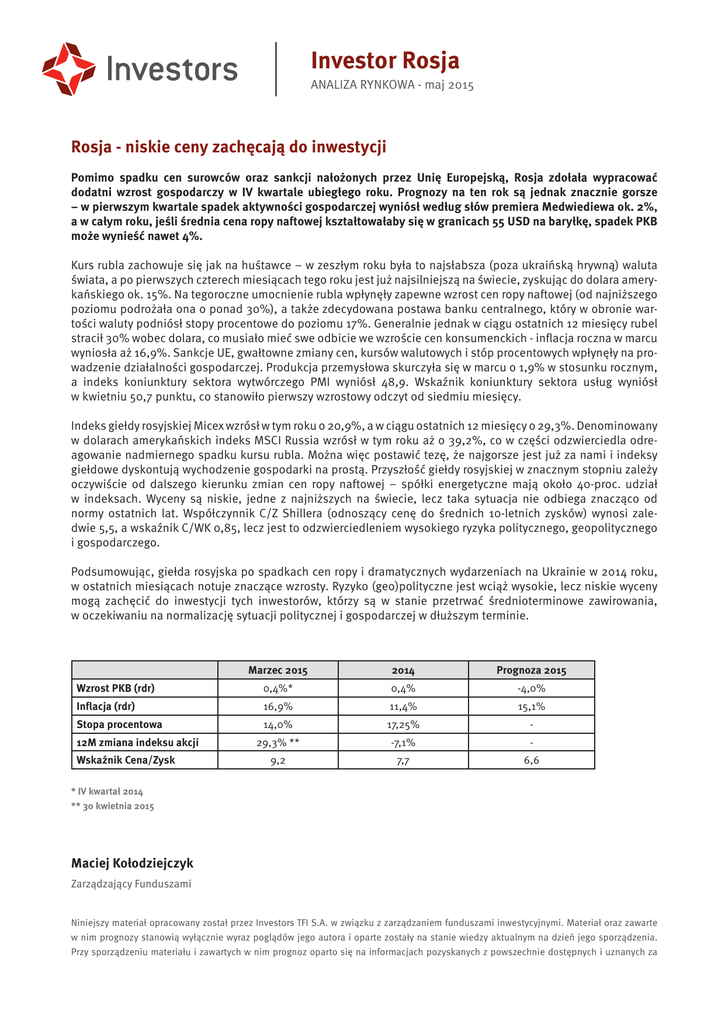 Investor Rosja ANALIZA RYNKOWA - maj 2015 Rosja - niskie ceny zachęcają do inwestycji Pomimo spadku cen surowców oraz sankcji nałożonych przez Unię Europejską, Rosja zdołała wypracować dodatni wzrost gospodarczy w IV kwartale ubiegłego roku. Prognozy na ten rok są jednak znacznie gorsze – w pierwszym kwartale spadek aktywności gospodarczej wyniósł według słów premiera Medwiediewa ok. 2%, a w całym roku, jeśli średnia cena ropy naftowej kształtowałaby się w granicach 55 USD na baryłkę, spadek PKB może wynieść nawet 4%. Kurs rubla zachowuje się jak na huśtawce – w zeszłym roku była to najsłabsza (poza ukraińską hrywną) waluta świata, a po pierwszych czterech miesiącach tego roku jest już najsilniejszą na świecie, zyskując do dolara amerykańskiego ok. 15%. Na tegoroczne umocnienie rubla wpłynęły zapewne wzrost cen ropy naftowej (od najniższego poziomu podrożała ona o ponad 30%), a także zdecydowana postawa banku centralnego, który w obronie wartości waluty podniósł stopy procentowe do poziomu 17%. Generalnie jednak w ciągu ostatnich 12 miesięcy rubel stracił 30% wobec dolara, co musiało mieć swe odbicie we wzroście cen konsumenckich - inflacja roczna w marcu wyniosła aż 16,9%. Sankcje UE, gwałtowne zmiany cen, kursów walutowych i stóp procentowych wpłynęły na prowadzenie działalności gospodarczej. Produkcja przemysłowa skurczyła się w marcu o 1,9% w stosunku rocznym, a indeks koniunktury sektora wytwórczego PMI wyniósł 48,9. Wskaźnik koniunktury sektora usług wyniósł w kwietniu 50,7 punktu, co stanowiło pierwszy wzrostowy odczyt od siedmiu miesięcy. Indeks giełdy rosyjskiej Micex wzrósł w tym roku o 20,9%, a w ciągu ostatnich 12 miesięcy o 29,3%. Denominowany w dolarach amerykańskich indeks MSCI Russia wzrósł w tym roku aż o 39,2%, co w części odzwierciedla odreagowanie nadmiernego spadku kursu rubla. Można więc postawić tezę, że najgorsze jest już za nami i indeksy giełdowe dyskontują wychodzenie gospodarki na prostą. Przyszłość giełdy rosyjskiej w znacznym stopniu zależy oczywiście od dalszego kierunku zmian cen ropy naftowej – spółki energetyczne mają około 40-proc. udział w indeksach. Wyceny są niskie, jedne z najniższych na świecie, lecz taka sytuacja nie odbiega znacząco od normy ostatnich lat. Współczynnik C/Z Shillera (odnoszący cenę do średnich 10-letnich zysków) wynosi zaledwie 5,5, a wskaźnik C/WK 0,85, lecz jest to odzwierciedleniem wysokiego ryzyka politycznego, geopolitycznego i gospodarczego. Podsumowując, giełda rosyjska po spadkach cen ropy i dramatycznych wydarzeniach na Ukrainie w 2014 roku, w ostatnich miesiącach notuje znaczące wzrosty. Ryzyko (geo)polityczne jest wciąż wysokie, lecz niskie wyceny mogą zachęcić do inwestycji tych inwestorów, którzy są w stanie przetrwać średnioterminowe zawirowania, w oczekiwaniu na normalizację sytuacji politycznej i gospodarczej w dłuższym terminie. Marzec 2015 2014 Prognoza 2015 Wzrost PKB (rdr) 0,4%* 0,4% -4,0% Inflacja (rdr) 16,9% 11,4% 15,1% Stopa procentowa 14,0% 17,25% - 29,3% ** -7,1% - 9,2 7,7 6,6 12M zmiana indeksu akcji Wskaźnik Cena/Zysk * IV kwartał 2014 ** 30 kwietnia 2015 Maciej Kołodziejczyk Zarządzający Funduszami Niniejszy materiał opracowany został przez Investors TFI S.A. w związku z zarządzaniem funduszami inwestycyjnymi. Materiał oraz zawarte w nim prognozy stanowią wyłącznie wyraz poglądów jego autora i oparte zostały na stanie wiedzy aktualnym na dzień jego sporządzenia. Przy sporządzeniu materiału i zawartych w nim prognoz oparto się na informacjach pozyskanych z powszechnie dostępnych i uznanych za Investor Rosja ANALIZA RYNKOWA - maj 2015 wiarygodne źródeł, dokładając należytej staranności, aby informacje zamieszczone w niniejszym materiale były rzetelne, niemniej jednak nie można zagwarantować ich poprawności, kompletności i aktualności. Investors TFI S.A. zastrzega sobie możliwość zmiany przedstawionych opinii, w tym w przypadku zmiany sytuacji rynkowej, bez konieczności powiadamiania o niej adresatów niniejszego materiału. Investors TFI S.A. nie gwarantuje ziszczenia się scenariuszy lub prognoz zamieszczonych w niniejszym materiale, w szczególności przedstawione informacje (historyczne i prognozowane) nie stanowią gwarancji osiągnięcia podobnych wyników w przyszłości. Materiał niniejszy nie stanowi oferty publicznej ani publicznego oferowania w zakresie nabycia lub sprzedaży jakichkolwiek papierów wartościowych ani oferty w rozumieniu przepisów ustawy z dnia 23 kwietnia 1964 r. – Kodeks cywilny. Wnioski wyciągnięte na podstawie przedstawionych komentarzy i prognoz nie powinny stanowić samodzielnej podstawy jakichkolwiek decyzji inwestycyjnych. Niniejszy materiał ma charakter wyłącznie informacyjny i marketingowy oraz nie zawiera pełnych informacji niezbędnych do oceny ryzyka związanego z inwestycją w papiery wartościowe oraz inne instrumenty finansowe. Decyzje inwestycyjne co do inwestowania w fundusze inwestycyjne powinny być podejmowane w oparciu o informacje obejmujące w szczególności: opis czynników ryzyka, zasady sprzedaży jednostek uczestnictwa/certyfikatów inwestycyjnych funduszy, tabelę opłat manipulacyjnych oraz szczegółowe informacje podatkowe zawarte w prospekcie informacyjnym funduszu/y, dostępnych w punktach dystrybucji funduszy, w siedzibie Investors TFI S.A. oraz na stronie www.investors.pl. Podejmowanie decyzji inwestycyjnych wyłącznie w oparciu o informacje zamieszczone na stronach wskazanego portalu internetowego lub wyłącznie na podstawie innych materiałów reklamowych Investors TFI S.A., następuje na ryzyko Klienta. Zaleca się również zapoznanie z najbardziej aktualnym zaudytowanym rocznym lub półrocznym sprawozdaniem finansowym danego funduszu. Dotychczasowe wyniki funduszy inwestycyjnych nie stanowią gwarancji osiągnięcia podobnych wyników w przy