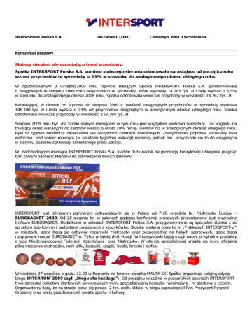 INTERSPORT Polska S.A. INTERSPPL (IPO) Cholerzyn, dnia 3 września br. Komunikat prasowy Słabszy sierpień, ale narastająco trend wzrostowy. Spółka INTERSPORT Polska S.A. pomimo słabszego sierpnia odnotowała narastająco od początku roku wzrost przychodów ze sprzedaży o 23% w stosunku do analogicznego okresu ubiegłego roku. W opublikowanym 3 września2009 roku raporcie bieżącym Spółka INTERSPORT Polska S.A. poinformowała o osiągniętych w sierpniu 2009 roku przychodach ze sprzedaży, które wyniosły 14.763 tys. zł i były wyższe o 3,5% w stosunku do analogicznego okresu 2008 roku. Spółka odnotowała wówczas przychody w wysokości 14.267 tys. zł. Narastająco, w okresie od stycznia do sierpnia 2009 r. wielkość osiągniętych przychodów ze sprzedaży wyniosła 146.100 tys. zł i była wyższa o 23% od przychodów osiągniętych w analogicznym okresie ubiegłego roku. Spółka odnotowała wówczas przychody w wysokości 118.780 tys. zł. Sierpień 2009 roku był dla Spółki słabym miesiącem w tym roku pod względem wielkości sprzedaży. Ze względu na trwający okres wakacyjny do salonów weszło o około 10% mniej klientów niż w analogicznym okresie ubiegłego roku. Była to typowa tendencja zauważalna we wszystkich centrach handlowych. Zdecydowana poprawa sprzedaży była widoczna pod koniec miesiąca (w ostatnim tygodniu wakacji) niemniej jednak nie przyczyniło się to do osiągnięcia w sierpniu poziomu sprzedaży zakładanego przez Zarząd. W nadchodzącym miesiącu INTERSPORT Polska S.A. kładzie duży nacisk na promocję koszykówki i biegania pragnąc tym samym zachęcić klientów do odwiedzania swoich salonów. INTERSPORT jest oficjalnym partnerem odbywających się w Polsce od 7-20 września br. Mistrzostw Europy – EUROBASKET`2009. Od 28 sierpnia br. w salonach podczas konferencji prasowych prezentowane jest oryginalne trofeum EUROBASKET. Dodatkowo w salonach INTERSPORT Polska S.A. przygotowywane są specjalne stoiska z ze sprzętem sportowym i gadżetami związanymi z koszykówką. Stoiska zostaną otwarte w 17 sklepach INTERSPORT-u* w miastach, gdzie będą się odbywać rozgrywki Mistrzostw oraz bezpośrednio na halach sportowych, gdzie będą rozgrywane mecze EUROBASKET-u. Tylko w takiej dystrybucji fani koszykówki będą mogli nabyć oryginalne produkty z logo Międzynarodowej Federacji Koszykówki oraz Mistrzostw. W ofercie sprzedażowej znajdą się m.in. oficjalna piłka meczowa mistrzostw, mini piłki, koszulki, czapki, kubki, breloki i trofea. W niedzielę 27 września o godz. 12.00 w Poznaniu na terenie ośrodka MALTA SKI Spółka organizuje kolejną edycję biegu INTERRUN`2009 czyli „Biegu dla każdego”. Od początku września w poznańskich salonach INTERSPORT trwa sprzedaż pakietów startowych zawierających m.in. specjalistyczną koszulkę runningową i nr startowy z czipem. Organizatorzy liczą, że na stracie stawi się ponad 2 tys. osób. Udział w biegu zapowiedział Pan Prezydent Ryszard Grobelny oraz wielu przedstawicieli świata sportu i kultury. INTERSPORT Polska S.A. Spółka jest w Polsce liderem wśród sieci sklepów sportowych, posiadającym obecnie 26 salonów zlokalizowanych w 14 największych miastach Polski: czterech w Warszawie i Poznaniu, trzech w Krakowie i Wrocławiu, dwóch w Gdańsku i Łodzi oraz po jednym salonie w Bielsku-Białej, Białymstoku, Bytomiu, Bydgoszczy, Gdyni, Katowicach, Sosnowcu i Opolu. Łączna powierzchnia salonów wynosi prawie 29 tys. m2. Według wstępnych szacunków, INTERSPORT Polska S.A. chce osiągnąć w roku 2009 dwudziestodwuprocentowy wzrost przychodów ze sprzedaży do około 230 mln zł oraz planuje znaczną poprawę zysku netto w stosunku do 2008 roku. Dodatkowych informacji udziela: Iwona Książek Kierownik Działu Komunikacji i RI tel. (012) 44 48 104, 600 401 271 e-mail: [email protected] www.inwestor.intersport.pl
