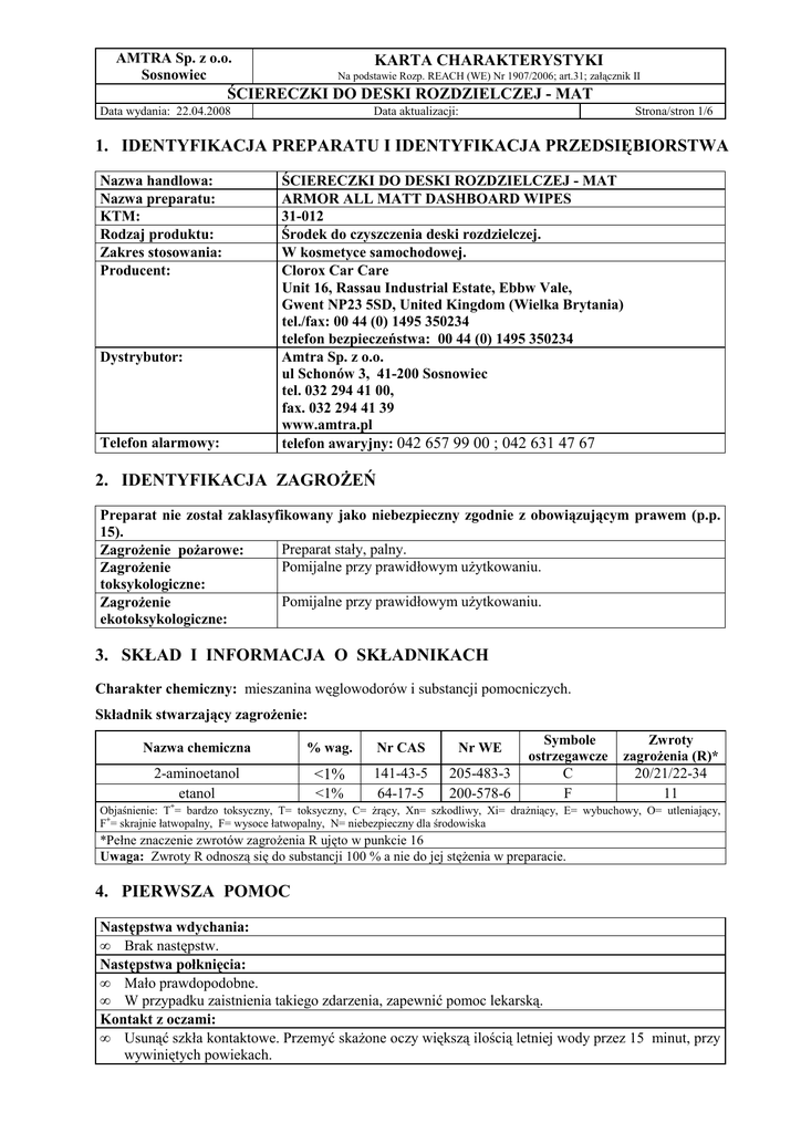 AMTRA Sp. z o.o. Sosnowiec KARTA CHARAKTERYSTYKI Na podstawie Rozp. REACH (WE) Nr 1907/2006; art.31; załącznik II ŚCIERECZKI DO DESKI ROZDZIELCZEJ - MAT Data wydania: 22.04.2008 Data aktualizacji: Strona/stron 1/6 1. IDENTYFIKACJA PREPARATU I IDENTYFIKACJA PRZEDSIĘBIORSTWA Nazwa handlowa: Nazwa preparatu: KTM: Rodzaj produktu: Zakres stosowania: Producent: Dystrybutor: Telefon alarmowy: ŚCIERECZKI DO DESKI ROZDZIELCZEJ - MAT ARMOR ALL MATT DASHBOARD WIPES 31-012 Środek do czyszczenia deski rozdzielczej. W kosmetyce samochodowej. Clorox Car Care Unit 16, Rassau Industrial Estate, Ebbw Vale, Gwent NP23 5SD, United Kingdom (Wielka Brytania) tel./fax: 00 44 (0) 1495 350234 telefon bezpieczeństwa: 00 44 (0) 1495 350234 Amtra Sp. z o.o. ul Schonów 3, 41-200 Sosnowiec tel. 032 294 41 00, fax. 032 294 41 39 www.amtra.pl telefon awaryjny: 042 657 99 00 ; 042 631 47 67 2. IDENTYFIKACJA ZAGROśEŃ Preparat nie został zaklasyfikowany jako niebezpieczny zgodnie z obowiązującym prawem (p.p. 15). Preparat stały, palny. ZagroŜenie poŜarowe: Pomijalne przy prawidłowym uŜytkowaniu. ZagroŜenie toksykologiczne: Pomijalne przy prawidłowym uŜytkowaniu. ZagroŜenie ekotoksykologiczne: 3. SKŁAD I INFORMACJA O SKŁADNIKACH Charakter chemiczny: mieszanina węglowodorów i substancji pomocniczych. Składnik stwarzający zagroŜenie: Nazwa chemiczna % wag. Nr CAS Nr WE 2-aminoetanol etanol <1% 141-43-5 64-17-5 205-483-3 200-578-6 <1% Symbole ostrzegawcze C F Zwroty zagroŜenia (R)* 20/21/22-34 11 Objaśnienie: T+= bardzo toksyczny, T= toksyczny, C= Ŝrący, Xn= szkodliwy, Xi= draŜniący, E= wybuchowy, O= utleniający, F+= skrajnie łatwopalny, F= wysoce łatwopalny, N= niebezpieczny dla środowiska *Pełne znaczenie zwrotów zagroŜenia R ujęto w punkcie 16 Uwaga: Zwroty R odnoszą się do substancji 100 % a nie do jej stęŜenia w preparacie. 4. PIERWSZA POMOC Następstwa wdychania: • Brak następstw. Następstwa połknięcia: • Mało prawdopodobne. • W przypadku zaistnienia takiego zdarzenia, zapewnić pomoc lekarską. Kontakt z oczami: • Usunąć szkła kontaktowe. Przemyć skaŜone oczy większą ilością letniej wody przez 15 minut, przy wywiniętych powiekach. AMTRA Sp. z o.o. Sosnowiec KARTA CHARAKTERYSTYKI Na podstawie Rozp. REACH (WE) Nr 1907/2006; art.31; załącznik II ŚCIERECZKI DO DESKI ROZDZIELCZEJ - MAT Data wydania: 22.04.2008 Data aktualizacji: Strona/stron 2/6 • W razie potrzeby zapewnić pomoc okulisty. Kontakt ze skórą: • Przemyć zanieczyszczoną skórę duŜą ilością wody. • W przypadku gdy wystąpi podraŜnienie skóry, które nie przemija, skonsultować się z lekarzem dermatologiem. 5. POSTĘPOWANIE W PRZYPADKU POśARU ZagroŜenia poŜarowe: Środki gaśnicze: Środki gaśnicze, których nie naleŜy stosować: Gaszenie poŜaru: Sprzęt ochronny straŜaków: Produkty spalania: Preparat palny. • piana gaśnicza • gaśnice CO2, • gaśnice proszkowe z proszkiem gaszącym ABC lub BC, • woda gaśnicza. Nie stosować zwartych strumieni wody na powierzchnię palącego się preparatu. Unikać stosowania strumieni wody pod wysokim ciśnieniem. Zalecane jest stosowanie mgły wodnej, o ile woda jest stosowana. Pełne wyposaŜenie ochronne. Aparaty izolujące drogi oddechowe. Produkty spalania mogą zawierać m.in. tlenek węgla, ditlenek węgla. 6. POSTĘPOWANIE W PRZYPADKU NIEZAMIERZONEGO UWOLNIENIA DO ŚRODOWISKA Środki ochrony indywidualnej: Metody oczyszczania: Zabezpieczenie środowiska: Nie dotyczy. Upuszczoną ściereczkę podnieść z podłoŜa. O ile nie została zabrudzona lub zniszczona, uŜyć ponownie. ZuŜytą ściereczkę wyrzucić do pojemnika ze śmieciami. 7. POSTĘPOWANIE Z PREPARATEM I JEGO MAGAZYNOWANIE Postępowanie z preparatem: Nie stosować preparatu: Magazynowanie: Metody postępowania z odpadami: Podczas wszelkich, wykonywanych czynności z preparatem: • nie jeść, nie pić, nie palić nie zaŜywać lekarstw, • unikać bezpośrednich kontaktów z preparatem. Po zakończonej pracy naleŜy umyć ręce. Nie uŜywać do czyszczenia ciała. Przechowywać we właściwie oznakowanych, fabrycznych, zamkniętych opakowaniach, z etykietą w języku polskim zgodną z obowiązującymi przepisami. Magazyny muszą być suche, przystosowane do przechowywania preparatów chemicznych. Przechowywać w chłodzie. Chronić przed działaniem promieni słonecznych i źródeł ciepła. Stosować się do zaleceń ujętych w karcie-charakterystyce. Odpadowy preparat likwidować na drodze spalania. 8. KONTROLA NARAśENIA I ŚRODKI OCHRONY INDYWIDUALNEJ Wartości graniczne naraŜenia: AMTRA Sp. z o.o. Sosnowiec KARTA CHARAKTERYSTYKI Na podstawie Rozp. REACH (WE) Nr 1907/2006; art.31; załącznik II ŚCIERECZKI DO DESKI ROZDZIELCZEJ - MAT Data wydania: 22.04.2008 Data aktualizacji: Strona/stron 3/6 NajwyŜsze dopuszczalne stęŜenie (mg/m3) w środowisku pracy poszczególnych składników preparatu – obowiązujące w Polsce: Nr CAS Składnik 2-aminoetanol etanol 141-43-5 64-17-5 NDS (mg/m3) NDSCh (mg/m3) 2,5 1900 7,5 - NajwyŜsze dopuszczalne stęŜenie (mg/m3) w środowisku pracy poszczególnych składników preparatu - obowiązujące w Unii Europejskiej: Nr CAS Nazwa czynnika Wartości dopuszczalne 8 godzin 3 141-43-5 64-17-5 2-aminoetanol etanol Krótkoterminowe Adnotacje 3 mg/m mg/m 2,5 - 7,6 - skóra - Kontrola naraŜenia: Kontrola naraŜenia w miejscu pracy: Ochrona rąk: Ochrona oczu: Ochrona dróg oddechowych: Ochrona skóry: Ogólne środki ochrony i higieny: Stosować rękawice ochronne. Nie dotyczy Nie dotyczy. Nie dotyczy. Obowiązują przepisy ogólne przemysłowej higieny pracy. Unikać bezpośredniego kontaktu powierzchni ciała z preparatem. Zanieczyszczone ubranie wymienić. Po pracy wymyć powierzchnię ciała oraz oczyścić ochrony osobiste. Nie jeść, nie pić, nie zaŜywać leków podczas pracy. Kontrola naraŜenia środowiska: brak danych 9. WŁAŚCIWOŚCI FIZYCZNE I CHEMICZNE INFORMACJE OGÓLNE W warunkach normalnych tka