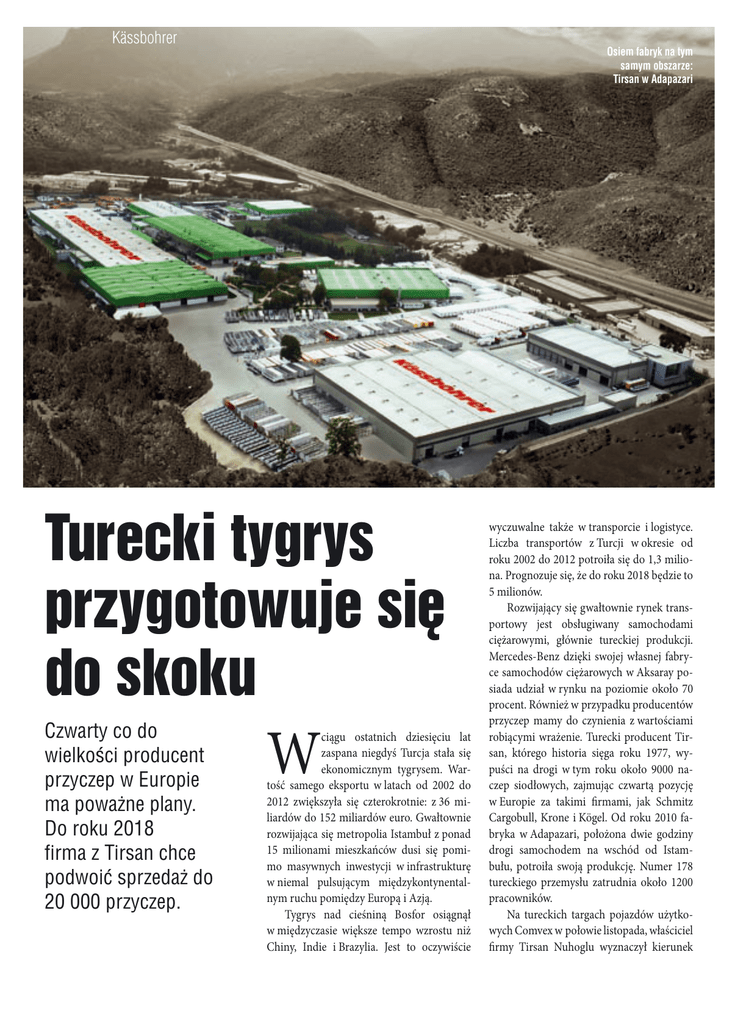 Kässbohrer Osiem fabryk na tym samym obszarze: Tirsan w Adapazari Turecki tygrys przygotowuje się do skoku Czwarty co do wielkości producent przyczep w Europie ma poważne plany. Do roku 2018 firma z Tirsan chce podwoić sprzedaż do 20 000 przyczep. W ciągu ostatnich dziesięciu lat zaspana niegdyś Turcja stała się ekonomicznym tygrysem. Wartość samego eksportu w latach od 2002 do 2012 zwiększyła się czterokrotnie: z 36 miliardów do 152 miliardów euro. Gwałtownie rozwijająca się metropolia Istambuł z ponad 15 milionami mieszkańców dusi się pomimo masywnych inwestycji w infrastrukturę w niemal pulsującym międzykontynentalnym ruchu pomiędzy Europą i Azją. Tygrys nad cieśniną Bosfor osiągnął w międzyczasie większe tempo wzrostu niż Chiny, Indie i Brazylia. Jest to oczywiście wyczuwalne także w transporcie i logistyce. Liczba transportów z Turcji w okresie od roku 2002 do 2012 potroiła się do 1,3 miliona. Prognozuje się, że do roku 2018 będzie to 5 milionów. Rozwijający się gwałtownie rynek transportowy jest obsługiwany samochodami ciężarowymi, głównie tureckiej produkcji. Mercedes-Benz dzięki swojej własnej fabryce samochodów ciężarowych w Aksaray posiada udział w rynku na poziomie około 70 procent. Również w przypadku producentów przyczep mamy do czynienia z wartościami robiącymi wrażenie. Turecki producent Tirsan, którego historia sięga roku 1977, wypuści na drogi w tym roku około 9000 naczep siodłowych, zajmując czwartą pozycję w Europie za takimi firmami, jak Schmitz Cargobull, Krone i Kögel. Od roku 2010 fabryka w Adapazari, położona dwie godziny drogi samochodem na wschód od Istambułu, potroiła swoją produkcję. Numer 178 tureckiego przemysłu zatrudnia około 1200 pracowników. Na tureckich targach pojazdów użytkowych Comvex w połowie listopada, właściciel firmy Tirsan Nuhoglu wyznaczył kierunek Technika Kässbohrer Aluminium i stal szlachetna: produkcja cystern i silosów marki Kässbohrer macie od dwóch do ośmiu osi. Na pierwszy rzut oka, pomimo dynamicznych warunków ramowych, plan ten wydaje się bardziej niż euforyczny. Turcja: silna lokalizacja przemysłu motoryzacyjnego „Do roku 2020 Tirsan będzie produkować rocznie 20 000 przyczep. Przejęcie innego producenta jest możliwą strategią.” Właściciel firmy Tirsan, Cetin Nuhoglu marszu na rok 2018: Tirsan chce za pomocą trzech swoich marek Tirsan, Kässbohrer i Talson ponownie podwoić sprzedaż – do 20000 sztuk, z tego 50% na eksport. Inne, samodzielnie wyznaczone cele są następujące: do 2015 roku lider rynku autocystern i silosów, a do roku 2016 europejski lider rynku przyczep niskopodwoziowych w for12 W Turcji, siódmej co do wielkości gospodarce narodowej Europy, każdego roku produkuje się 1,1 miliona samochodów wszelkiego rodzaju. Ten prężnie rozwijający się kraj jest obecnie największym zakładem produkcyjnym autobusów i lekkich pojazdów użytkowych w Europie. W Adapazari, gdzie swoją produkcję zlokalizowała firma Tirsan, a w samym regionie działa 17 dużych międzynarodowych firm z branży motoryzacyjnej, od Forda i Toyoty do Renault, ciągle coś się dzieje. W ośmiu fabrykach na jednym obszarze codziennie powstaje 40 przyczep różnego rodzaju: kurtyn, cystern, silosów, niskopodwoziowych, wywrotek, Air-Cargo marki Talson, suchego frachtu i chłodni. W ciągu ostatnich dwóch lat w zakładzie w Tirsan zainwestowano 14,2 miliona euro. W ciągu ostatnich trzech lat wybudowano nową halę produkcji przyczep niskopodłogowych, własną instalację KTL (wcześniej korzystano z instalacji MAN w sąsiedztwie), własny zakład produkcji paneli oraz produkcji wywrotek. Nowy jest również budynek działu badań i rozwoju, istniejącego od 2009 roku. Obecnie zatrudnionych jest tutaj 82 pracowników. Jeżeli wszystko przebiegnie zgodnie z planem, każdego miesiąca zatrudnienie znajdzie od dwóch do trzech nowych inżynierów. Tureckie państwo chętnie wspiera środkami przedsiębiorstwa, które przeznaczają na badania i rozwój co najmniej 2,3 procent swoich obrotów. Do roku 2015 Tirsan zatrudni tutaj 165 projektantów. Rekrutacja specjalistów nie stanowi problemu, ponieważ podaż dobrze wykształconych inżynierów-absolwentów jest w Turcji ogromna. Z drugiej strony w tureckim przemyśle motoryzacyjnym trwa silna walka o inżynierów. Aby można było lepiej wykwalifikować absolwentów w obszarze rzemieślniczym, w zakładzie działa własna „Akademia spawalnictwa Kässbohrer”, która kształci specjalistów przede wszystkim w zakresie obróbki stali szlachetnej i aluminium do produkcji autocystern i silosów. Własne zakładowe centrum testowe dysponuje obszerną paletą „narzędzi tortur” do ciągłego badania wytrzymałości konstrukcji. Do tego dochodzą miliony kilometrów testów na różnych obszarach testowych. Aby kwitnący lokalny przemysł motoryzacyjny nie miał już tak daleko, tureckie państwo funduje nowe centrum testowe o wartości 120 milionów euro w odległości około 60 km od Adapazari; powinno ono zostać otwarte w roku 2014. Inżynierowie rozwoju firmy Tirsan współpracują intensywnie ze swoimi dostawcami, takimi jak BPW, Knorr-Bremse i Lamilux. Jeżeli chodzi o części dostarczane przez dostawców do tureckich przyczep mamy do czynienia z firmami, które mają swoją rangę i renomę w przemyśle: od SAF, Edscha i Adaico po Jost i Hestal. Podczas produkcji wykorzystywane są wszystkie powszechnie stosowane nowoczesne metody – od symulacji CAD, poprzez „Lean Production”, aż do Kaizen. Cysterny i silosy dla rynku niemieckiego Dwie trzecie produkcji firmy Tirsan to naczepy kurtynowe, zaprojektowane do wymagającej, codziennej pracy na rdzennych rynkach Turcji i krajów sąsiednich oraz Rosji. Oprócz produkcji w Adapazari od roku 1998 firma posiada punkt wsparcia w Goch am Niederrhein oraz od 2012 roku linię montażową w rosyjskim mieście Jasnogorsk. Szczególn