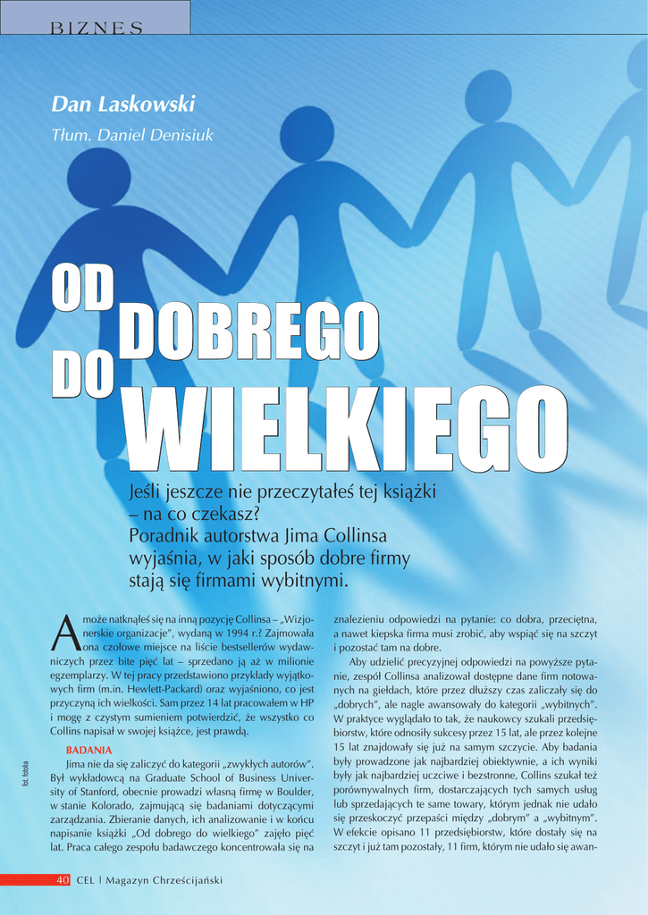 BIZNES Dan Laskowski Tłum. Daniel Denisiuk OD DOBREGO DO WIELKIEGO Jeśli jeszcze nie przeczytałeś tej książki – na co czekasz? Poradnik autorstwa Jima Collinsa wyjaśnia, w jaki sposób dobre firmy stają się firmami wybitnymi. A fot. fotolia może natknąłeś się na inną pozycję Collinsa – „Wizjonerskie organizacje”, wydaną w 1994 r.? Zajmowała ona czołowe miejsce na liście bestsellerów wydawniczych przez bite pięć lat – sprzedano ją aż w milionie egzemplarzy. W tej pracy przedstawiono przykłady wyjątkowych firm (m.in. Hewlett-Packard) oraz wyjaśniono, co jest przyczyną ich wielkości. Sam przez 14 lat pracowałem w HP i mogę z czystym sumieniem potwierdzić, że wszystko co Collins napisał w swojej książce, jest prawdą. BADANIA Jima nie da się zaliczyć do kategorii „zwykłych autorów”. Był wykładowcą na Graduate School of Business University of Stanford, obecnie prowadzi własną firmę w Boulder, w stanie Kolorado, zajmującą się badaniami dotyczącymi zarządzania. Zbieranie danych, ich analizowanie i w końcu napisanie książki „Od dobrego do wielkiego” zajęło pięć lat. Praca całego zespołu badawczego koncentrowała się na 40 CEL | Magazyn Chrześcijański znalezieniu odpowiedzi na pytanie: co dobra, przeciętna, a nawet kiepska firma musi zrobić, aby wspiąć się na szczyt i pozostać tam na dobre. Aby udzielić precyzyjnej odpowiedzi na powyższe pytanie, zespół Collinsa analizował dostępne dane firm notowanych na giełdach, które przez dłuższy czas zaliczały się do „dobrych”, ale nagle awansowały do kategorii „wybitnych”. W praktyce wyglądało to tak, że naukowcy szukali przedsiębiorstw, które odnosiły sukcesy przez 15 lat, ale przez kolejne 15 lat znajdowały się już na samym szczycie. Aby badania były prowadzone jak najbardziej obiektywnie, a ich wyniki były jak najbardziej uczciwe i bezstronne, Collins szukał też porównywalnych firm, dostarczających tych samych usług lub sprzedających te same towary, którym jednak nie udało się przeskoczyć przepaści między „dobrym” a „wybitnym”. W efekcie opisano 11 przedsiębiorstw, które dostały się na szczyt i już tam pozostały, 11 firm, którym nie udało się awan- sować do wyższej kategorii, oraz 7, które stały się wybitne, ale nie były w stanie długo utrzymać swojej pozycji. Przez pięć lat naukowcy zbierali dane, szukali tajemnic stanowiących klucz do prawdziwej wielkości danej firmy. Kiedy ich baza danych była pełna i zaczęli wyciągać wnioski – zauważyli coś dziwnego. Wiele przypuszczeń na temat przyczyn sukcesu pozostało... tylko przypuszczeniami. Po dokładnej analizie danych okazało się, że w wybitnych firmach nie udało im się znaleźć: 1. charyzmatycznych, ponadprzeciętnych przywódców; 2. stałych systemów wynagradzania pracowników; 3. nadzwyczajnych strategii; 4. specjalnej koncentracji wysiłków, aby firma stała się wybitna; 5. wyspecjalizowanych technologii, na których miałyby opierać się zmiany; 6. fuzji i nabywania innych przedsiębiorstw; 7. wyjątkowych programów motywacyjnych; 8. niestandardowych imprez otwierających nowe przedsięwzięcia; 9. specjalizacji w obiecujących dziedzinach świata biznesu. W wybitnych firmach znaleźli za to inne cechy – i pisząc książkę, każdej z nich poświęcili jeden rozdział. 1. Dobre jest wrogiem wielkiego 2. Przywództwo na poziomie 5 3. Po pierwsze KTO, po drugie CO 4. Konfrontacja z wrogą rzeczywistością 5. Prostota i koncentracja – Zasada Jeża 6. Kultura dyscypliny 7. Technologiczne turbodoładowanie 8. Koło zamachowe i spirala klęski 9. Od wielkich przedsiębiorstw do wizjonerskich organizacji TWORZENIE „WYBITNEJ” FIRMY CHRZEŚCIJAŃSKIEJ Naprawdę polecam zakup i przeczytanie tej książki – wnioski, jakie można wyciągnąć z jej lektury, na pewno przydadzą się w życiu. Póki co, chciałbym się podzielić własnymi przemyśleniami. Najwartościowszą rzeczą, której nauczyła mnie ta książka, jest zrozumienie tego, jakiego rodzaju przywódcą należy się stać, aby odnieść sukces, oraz w jaki sposób przyciągnąć odpowiednich ludzi na swój pokład. Badania Jima wykazały, że w analizowanych firmach występują dwa rodzaje przywódców, oraz dwa rodzaje struktur wspomagających przywódców. Pierwszym – i jednocześnie najczęściej występującym typem przywódcy był „skuteczny przywódca na poziomie 4”. Ten typ przywództwa występuje najczęściej w dobrych firmach, czasami nawet w przedsiębiorstwach, które na moment stały się wybitne. Tego typu organizacje są prowadzone przez „geniusza z tysiącem pomocników”. To, co wyróżniało wszystkie wybitne firmy od całej reszty, to fakt, że na ich czele stali przywódcy typu „specjalista poziomu 5”. To rzadko spotykany typ ludzi, łączący w sobie skromność oraz determinację do osiągania znakomi- tych wyników. Firmy koncentrowały się najpierw na znalezieniu odpowiednich ludzi i stworzeniu sprawnego zespołu, aby później opracować najlepszy sposób na osiągnięcie wielkości. Upraszczając: przywódcy z „poziomu 4” najpierw podejmują decyzje, w jakim kierunku ma się rozwijać ich firma oraz co należy uczynić, aby stała się ona wielka, a dopiero później zatrudniają pracowników mających im w tym pomóc. Liderzy z „poziomu 5” zbierają odpowiednich ludzi i wspólnie decydują o celach firmy oraz sposobach na odniesienie sukcesu. Tu mam ważną uwagę – na „poziomie 5” nie chodzi o demokrację. Aby firma stała się naprawdę wielka w swojej dziedzinie, potrzeba dużo więcej – ale o tym można się dowiedzieć, czytając książkę Collinsa. Zarządzając naszym rodzinnym przedsiębiorstwem (Wood-Mizer), najpierw zbieraliśmy zespół i włączaliśmy ludzi do długofalowego planowania. Kiedy jednak przyszło do podejmowania tej jednej, wielkiej decyzji, to jedna osoba decydowała o kier