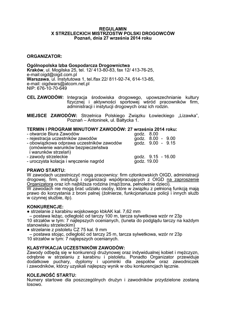 REGULAMIN X STRZELECKICH MISTRZOSTW POLSKI DROGOWCÓW Poznań, dnia 27 września 2014 roku ORGANIZATOR: Ogólnopolska Izba Gospodarcza Drogownictwa Kraków, ul. Mogilska 25, tel. 12/ 413-80-83, fax 12/ 413-76-25, e-mail:[email protected] Warszawa, ul. Instytutowa 1, tel./fax 22/ 811-92-74, 614-13-85, e-mail: [email protected] NIP: 676-10-70-649 CEL ZAWODÓW: Integracja środowiska drogowego, upowszechnianie kultury fizycznej i aktywności sportowej wśród pracowników firm, administracji i instytucji drogowych oraz ich rodzin. MIEJSCE ZAWODÓW: Strzelnica Polskiego Związku Łowieckiego „Lizawka”, Poznań – Antoninek, ul. Bałtycka 1. TERMIN I PROGRAM MINUTOWY ZAWODÓW: 27 września 2014 roku: - otwarcie Biura Zawodów godz. 8.00 - rejestracja uczestników zawodów godz. 8.00 - 9.00 - obowiązkowa odprawa uczestników zawodów godz. 9.00 - 9.15 (omówienie warunków bezpieczeństwa i warunków strzelań) - zawody strzeleckie godz. 9.15 - 16.00 - uroczysta kolacja i wręczenie nagród godz. 19.00 PRAWO STARTU: W zawodach uczestniczyć mogą pracownicy: firm członkowskich OIGD, administracji drogowej, firm, instytucji i organizacji współpracujących z OIGD na zaproszenie Organizatora oraz ich najbliższa rodzina (mąż/żona, pełnoletnie dzieci). W zawodach nie mogą brać udziału osoby, które w związku z pełnioną funkcją mają prawo do korzystania z broni palnej (żołnierze, funkcjonariusze policji i innych służb w czynnej służbie, itp). KONKURENCJE: ● strzelanie z karabinu wojskowego kbkAK kal. 7,62 mm – postawa leżąc, odległość od tarczy 100 m, tarcza sylwetkowa wzór nr 23p 10 strzałów w tym: 7 najlepszych ocenianych, (luneta do podglądu tarczy na każdym stanowisku strzeleckim) ● strzelanie z pistoletu CZ 75 kal. 9 mm – postawa stojąc, odległość od tarczy 25 m, tarcza sylwetkowa, wzór nr 23p 10 strzałów w tym: 7 najlepszych ocenianych. KLASYFIKACJA UCZESTNIKÓW ZAWODÓW: Zawody odbędą się w konkurencji drużynowej oraz indywidualnej kobiet i mężczyzn, odrębnie w strzelaniu z karabinu i pistoletu. Ponadto Organizator przewiduje dodatkowe puchary, dyplomy i upominki dla zespołów oraz zawodniczek i zawodników, którzy uzyskali najlepszy wynik w obu konkurencjach łącznie. KOLEJNOŚĆ STARTU: Numery startowe dla poszczególnych drużyn i zawodników przydzielone zostaną losowo. 2 ZGŁOSZENIA DO ZAWODÓW: Ze względu na sprawy organizacyjne, firmy zgłaszają listy uczestników lub ewentualne zmiany w składach drużyn do Organizatora w nieprzekraczalnym terminie do dnia 12 września br. do godz. 15.00, drogą pocztową na adres Izby, faxem, bądź mailem. WARUNKI UCZESTNICTWA: Każdy zawodnik ubezpiecza się we własnym zakresie i startuje na własne ryzyko. Warunkiem wpisu na listę startową jest zarówno zgłoszenie uczestnictwa jak i wpłacenie opłaty startowej w kwocie 50,00 zł od zawodnika w terminie do 12 września 2014 r. Opłatę prosimy wpłacać przelewem w na konto Izby w banku ING Bank Śląski nr: 52 1050 1445 1000 0012 0000 7449. Izba wystawi firmie fakturę VAT za uiszczone wpisowe. W przypadku rezygnacji z uczestnictwa w zawodach w terminie do dnia 12 września 2014 roku, Izba zwróci wpłaconą opłatę startową. Natomiast w razie zgłoszenia rezygnacji po dniu 12 września b.r., Izba nie zwraca opłaty startowej. BIURO ZAWODÓW: W dniu zawodów czynne będzie od godziny 8.00 na terenie Strzelnicy PZŁ „Lizawka”, Poznań – Antoninek ul. Bałtycka 1. W Biurze tym odbędzie się rejestracja zawodników i odbiór numerów startowych. SPOSÓB ROZGRYWANIA ZAWODÓW: Zgodnie z Regulaminem i przepisami obowiązującymi w Polskim Związku Łowieckim i Polskim Związku Strzelectwa Sportowego, w sprawach nie objętych regulaminem decyduje Sędzia Główny w porozumieniu z Kierownikiem Zawodów. WŁADZE ZAWODÓW: Sędzia Główny – płk Marek Świtek Kierownik Zawodów – Mariola Dzik Kierownik Biura Zawodów – Barbara Dzieciuchowicz NAGRODY: od I do III miejsca w konkurencji drużynowej i indywidualnej kobiet i mężczyzn – puchary; od I do VI miejsca we wszystkich konkurencjach – dyplomy; dodatkowe puchary i dyplomy dla najlepszych zawodników i drużyn w obydwu konkurencjach łącznie; medale okolicznościowe dla wszystkich uczestników zawodów; nagrody i upominki - w zależności od hojności sponsorów. Barbara Dzieciuchowicz p.o. Prezes Zarządu