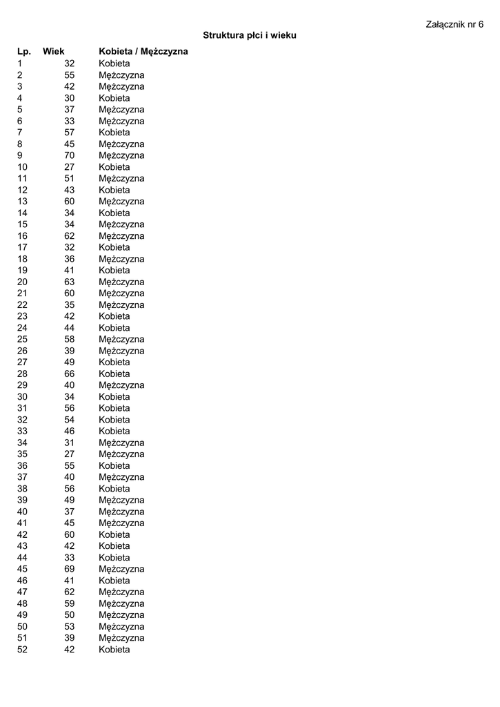 Struktura płci i wieku Załącznik nr 6 Lp. Wiek Kobieta / Mężczyzna 1