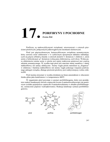 17. PORFIRYNY I POCHODNE Iwona śak Porfiryny są makrocyklicznymi związkami, utworzonymi z czterech pierścieni pirolowych, połączonych jednowęglowymi mostkami metinowymi. Pirol jest pięcioczłonowym, heterocyklicznym związkiem aromatycznym, który zawiera sześć elektronów π w cyklicznym sprzęŜonym układzie nakładających się pięciu orbitali p (kaŜdy z czterech atomów C dostarcza 1 elektron π, atom azotu o hybrydyzacji sp2 dostarcza wolną parę elektronową, czyli dwa). Wolna para elektronowa atomu azotu w pirolu jest mniej reaktywna poniewaŜ jest częścią sekstetu aromatycznego. W wyniku tego pirol jest znacznie mniej zasadowy i mniej nukleofilowy niŜ aminy alifatyczne. Atomy węgla pirolu natomiast są „bogatsze” w elektrony i bardziej nukleofilowe niŜ atomy węgla jedynego wiązania podwójnego jakiegoś związku, dlatego pierścień pirolowy jest reaktywniejszy wobec elektrofili. Pirol moŜna otrzymać w wyniku działania na furan amoniakiem w obecności tlenku glinu jako katalizatora i w temperaturze 400°C. W organizmie pirol powstaje w postaci porfobilinogenu, który jest produktem reakcji kondensacji dwóch cząsteczek kwasu δ-aminolewulinowego (na poniŜszym rysunku pojedyncze cząsteczki δ-aminolewulinianu w obrębie porfobilinogenu, zaznaczono poprzez wykropkowanie). Reakcję katalizuje syntaza porfobilinogenowa. H HC HC CH N H H HC H I N δ IV NH CH H γ HC α H HN II N III H pirol CH CH β H H porfina porfobilinogen 297 Wszystkie porfiryny zawierają makrocykliczny układ zwany porfiną, który nie występuje w przyrodzie w stanie wolnym, lecz analogi porfiny z podstawionymi łańcuchami bocznymi (do pierścieni pirolowych) są związkami bardzo istotnymi dla procesów Ŝyciowych. Typowymi przedstawicielami są hemy i chlorofile. Rodzaj łańcuchów bocznych w porfirynach moŜe być róŜny, zwykle występują podstawniki zarówno o krótszym, jak i dłuŜszym łańcuchu alifatycznym. Typowe podstawniki boczne porfiryn CH2 COOCH3 CH2 CH2 COOCH CH2 Strukturę porfiryn moŜna przedstawiać za pomocą uproszczonych wzorów Fischera. Cyfry rzymskie oznaczają numer pierścienia pirolowego, natomiast arabskie numery atomów węgli pierścieni pirolowych, do których przyłączone są podstawniki (łańcuchy alifatyczne). 1 8 7 2 I IV III 6 II 34 5 uproszczony wzór Fischera porfiryny Rozmieszczenie podstawników bocznych jest podstawą istnienia porfiryn w czterech typach izomerycznych (typ I symetryczny i typy II, III, IV – asymetryczne). Biologicznie waŜne izomeryczne typy porfiryn typ I symetryczny 298 typ III asymetryczny Asymetryczne rozmieszczenie podstawników w typie III porfiryn występuje we wszystkich biologicznie waŜnych porfirynach. Tego typu porfiryny określane są teŜ jako porfiryny IX, wynika to z faktu, Ŝe wykryto je jako dziewiątą formę izomeryczną. Symetryczne rozmieszczenie podstawników w typie I porfiryn występuje tylko w tych, które powstają w warunkach patologicznych, np. we wrodzonej porfirii erytropoetycznej. Asymetryczne typy II i III porfiryn otrzymano jedynie syntetycznie i nie mają Ŝadnego znaczenia biologicznego, dlatego nie zostały przedstawione ich wzory. Cząsteczki porfiryn są płaskie, bardzo trwałe i silnie zabarwione. Tworzą kompleksy z jonami metali (Ŝelaza lub magnezu) umiejscowionymi w środku struktury cząsteczki porfiryny, dzięki temu, Ŝe jony metali przejmują pary elektronowe od atomów azotu piroli. Porfiryny pochłaniają światło i posiadają charakterystyczne widma absorpcyjne zarówno w części widzialnej, jak i nadfioletowej. Wszystkie porfiryny, niezaleŜnie od rodzaju posiadanych podstawników bocznych, wykazują maksimum absorpcji przy długości fali około 400 nm, pasmo to określane jest mianem pasma Soreta. widmo absorpcyjne porfiryn Roztwory porfiryn po naświetleniu światłem nadfioletowym wykazują silną, charakterystyczną czerwoną fluorescencję, którą wykorzystuje się do wykrywania nawet śladowych ilości wolnych porfiryn. Z punktu widzenia diagnostyki klinicznej waŜne jest wykrywanie w materiale biologicznym obecności uroporfiryn i koproporfiryn, poniewaŜ związki te w zwiększonych ilościach wydalane są z organizmu w przypadku stanu patologicznego, zwanego porfirią. Uroporfiryna i koproporfiryna są metabolitami pośrednimi szlaku biosyntetycznego hemu. Barwna uroporfiryna III powstaje w cytoplazmie z bezbarwnego 299 uroporfirynogenu III pod wpływem światła w reakcji samoutlenienia, tworzącej mostki metinowe w tej porfirynie. COO COO CH 2 OOC CH 2 CH 2 H H I C N H H H HN II IV NH H H N H C C III H H C OOC H 2C H 2C H 2C - OOC CH 2 OOC CH 2 CH 2 COO CH2 CH2 - OOC 6H+ H 2C na świetle IV NH H 2C samoutlenienie H 2C CH2 - COO CH COO CH 2 HN II CH 2 N III HC CH CH 2 COO OOC CH 2 CH 2 CH 2 I N HC CH2 CH 2 COO CH2 COO COO COO uroporfirynogen III uroporfiryna III W podobnej reakcji powstaje barwna koproporfiryna III z bezbarwnego koproporfirynogenu III. COO COO CH 2 CH2 CH3 CH 2 CH3 CH2 H H3C H2C H2C - OOC H I N H H H CH3 NH HN II IV H CH2 H N H CH2 III H H COO CH2 CH 3 I N HC + 6H H3C na świetle IV NH H2C samoutlenienie H2C - HC CH CH 3 HN II N III CH OOC CH 2 COO CH2 CH3 CH2 CH2 COO COO koproporfirynogen III CH 2 koproporfiryna III Uroporfirynogen III jest wspólnym prekursorem dla wszystkich hemów, chlorofili oraz witaminy B12. 300 Uroporfirynę III wykryto pierwotnie w moczu, lecz nie jest to jedyne miejsce jej występowania w organizmie. Koproporfirynę III stwierdzono pierwotnie w kale, obecna jest równieŜ w moczu. Koproporfirynogen III powstaje z uroporfirynogenu III w cytoplazmie komórki w reakcji dekarboksylacji, która przekształca wszystkie boczne podstawniki acetylowe uroporfirynogenu w podstawniki metylowe koproporfirynogenu. W stanach patologicznych pojawiają się uroporfiryna I i koproporfiryna I, które powstają na tych samych zasadach, jak ich fizjologiczne izomery typu III. Koproporfirynogen III w mitochondriach przekszta