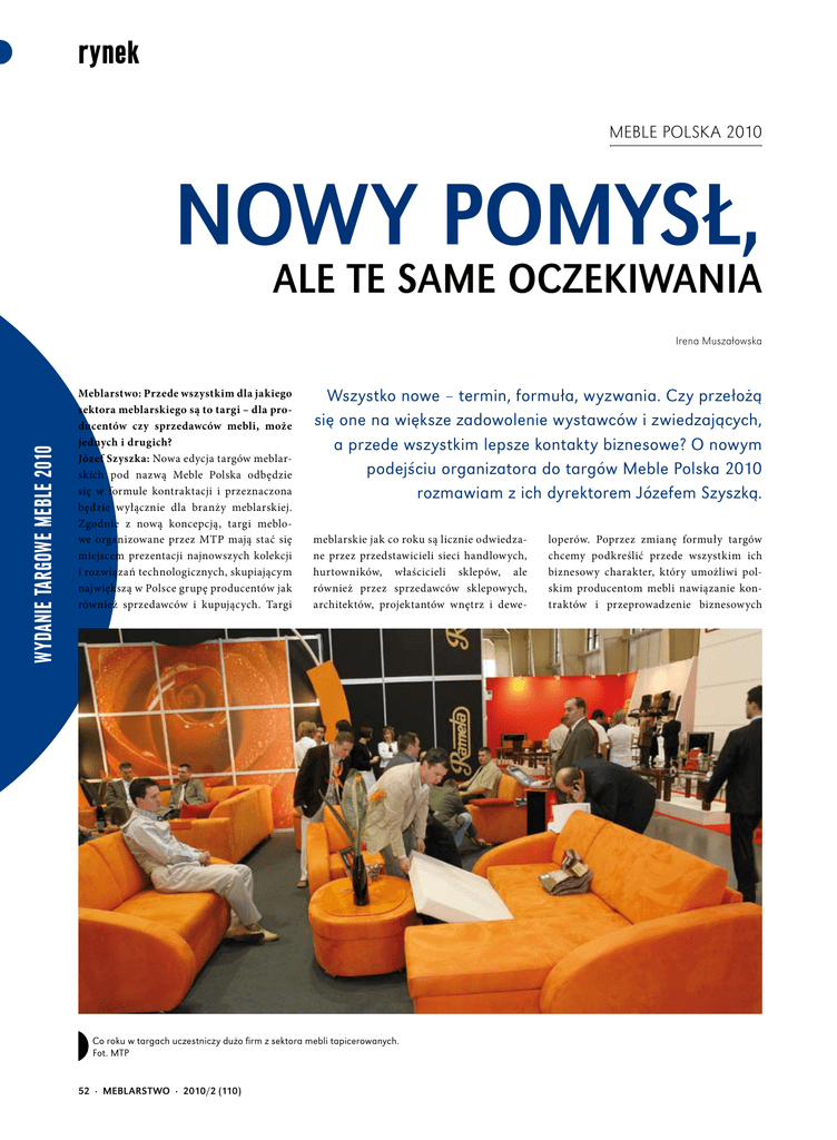 rynek Meble Polska 2010 Nowy pomysł, ale te same oczekiwania wydanie targowe meble 2010 Irena Muszałowska Meblarstwo: Przede wszystkim dla jakiego sektora meblarskiego są to targi – dla producentów czy sprzedawców mebli, może jednych i drugich? Józef Szyszka: Nowa edycja targów meblarskich pod nazwą Meble Polska odbędzie się w formule kontraktacji i przeznaczona będzie wyłącznie dla branży meblarskiej. Zgodnie z nową koncepcją, targi meblowe organizowane przez MTP mają stać się miejscem prezentacji najnowszych kolekcji i rozwiązań technologicznych, skupiającym największą w Polsce grupę producentów jak również sprzedawców i kupujących. Targi Wszystko nowe – termin, formuła, wyzwania. Czy przełożą się one na większe zadowolenie wystawców i zwiedzających, a przede wszystkim lepsze kontakty biznesowe? O nowym podejściu organizatora do targów Meble Polska 2010 rozmawiam z ich dyrektorem Józefem Szyszką. meblarskie jak co roku są licznie odwiedzane przez przedstawicieli sieci handlowych, hurtowników, właścicieli sklepów, ale również przez sprzedawców sklepowych, architektów, projektantów wnętrz i dewe- Co roku w targach uczestniczy dużo firm z sektora mebli tapicerowanych. Fot. MTP 52 · Meblarstwo · 2010/2 (110) loperów. Poprzez zmianę formuły targów chcemy podkreślić przede wszystkim ich biznesowy charakter, który umożliwi polskim producentom mebli nawiązanie kontraktów i przeprowadzenie biznesowych rynek Meblarstwo: Jakie przesłanie niesie ze sobą nowa nazwa targów – MEBLE POLSKA. Można by przypuszczać, że będą one promocją polskiej branży meblarskiej, polskich producentów. Skąd więc udział firm zagranicznych bądź firm polskich, które sprzedają meble producentów zagranicznych? J. Sz.: Nazwę targów Meble Polska można odczytywać na wielu płaszczyznach. Rzeczywiście podczas targów zaprezentowana zostanie w większości oferta producentów mebli z Polski, których produkcja dobrej jakości mebli zdobyła wysoką pozycję w Europie i na świecie (trzeci w Europie i czwarty na świecie największy eksporter mebli, przyp. red.). Prezentacja na targach zintegrowanej oferty wśród odwiedzających targi z Polski i zagranicy sprzyja budowaniu wizerunku dobrych, polskich produktów, które mogą konkurować z najlepszymi. Z drugiej strony, targi to również sprzedawcy i kupujący, i do tego sektora chcą dotrzeć zagraniczni wystawcy ze swoją ofertą. Polska dla takich firm, jak Asiades, Delta New Wave, Eremita, Intimacy Furnitures, Matrade, Nabytek Polach, Rajasthan Draft, Sedital to doskonałe miejsce do prezentacji swoich kolekcji jak również miejsce nawiązania kontaktów. Polska będzie więc rynkiem zbytu dla zagranicznych firm. I ostatnie, w nazwie chcemy wyraźnie zaznaczyć miejsce, gdzie odbywają się największe targi dla branży w tej części Europy. Meblarstwo: Jaka była frekwencja ubiegłorocznej edycji targów, zarówno pod względem wystawców jak i zwiedzających? Czy w tym roku utrzyma się na podobnym poziomie, czy może należy spodziewać się większego zainteresowania? J. Sz.: Podczas ostatniej edycji targów branży mebli i wyposażenia wnętrz – odbywających się równolegle targów MEBLE, BIURO, HOME DECOR wraz z Salonem LUMINEXPO oraz BUDMA INTERIOR – udział wzięło ponad 20 000 osób. W tym roku jednak oferta dla przedsiębiorców i kupców związanych zawodowo z branżą wykończenia i wyposażenia wnętrz zostanie zaprezentowana w Poznaniu podczas trzech niezależnych wydarzeń: targów dla producentów i kupców meblowych Meble Polska, targów Wnętrz HOME DECOR w maju oraz targów wyposażenia hoteli INVEST-HOTEL w październiku. Zmianie uległa formuła targów, która przewiduje obecność wyłącznie przedstawicieli branży. Na targi Meble Polska wprowadzona została rejestracja gości targowych w naszym serwisie, wstęp na targi jest możliwy na podstawie wysłanych przez organizatora bądź wystawcę zaproszeń. W ramach zaproszenia przekazanego przez MTP lub wystawcę kupcy meblowi będą mogli skorzystać z licznych ułatwień: bezpłatny wstęp i wjazd na targi, możliwość zaparkowania pojazdu na terenach targowych, całodzienny catering oraz zaproszenie na karnawałowy wieczór branżowy. Dotychczas udział w targach zapowiedziało blisko 2000 zarejestrowanych kupców meblowych z 37 krajów, w tym m.in. z Belgii, Wielkiej Brytanii, Niemiec, Francji, Białorusi, Szwajcarii, Czech, Danii, Grecji, Węgier, Irlandii, Litwy, Holandii, Rumunii, Bułgarii, Słowacji oraz Turcji. Zmianie ulegnie więc z pewnością nie „ilość”, ale „jakość” odwiedzających targi gości. Meblarstwo: W ubiegłym roku szczególną uwagę przykładano do potencjalnych klientów zagranicznych. Czy oczekiwania te spełniły się i nawiązano satysfakcjonującą liczbę kontaktów? J. Sz.: Jak już wspomnieliśmy, podczas ubiegłorocznej edycji prezentowane były, oprócz kolekcji mebli, również dekoracje, oświetlenie, produkty do wykończenia wnętrz oraz najnowsze trendy w designie. Licznie pojawili się wystawcy z zagranicy, a ekspozycja otwar- ta była dla profesjonalistów oraz dla klientów indywidualnych, zainteresowanych urządzeniem swojego mieszkania. Tegoroczne targi Meble Polska mają zupełnie inny, biznesowy charakter. Pojawiło się wiele firm z Niemiec, Hiszpanii, Litwy, Czech, Słowenii, Węgier, Włoch, ale też z Indii, Indonezji, Malezji czy Bangladeszu, zainteresowanych polskim rynkiem meblarskim. Obserwujemy też duże zainteresowanie kupców meblowych z zagranicy, przede wszystkim z Niemiec, Austrii i krajów Europy Wschodniej. Ilość zarejestrowanych przerosła nasze oczekiwania. Meblarstwo: Pod bokiem MTP rośnie konkurencja – MTM w Ostródzie. Zainteresowanie nimi jest coraz większe. Czy nie obawiacie się, że mogą one przejąć klientów MTP i co przemawia za tym, aby klienci pozostali jednak przy waszej formule imprezy? A może uzup