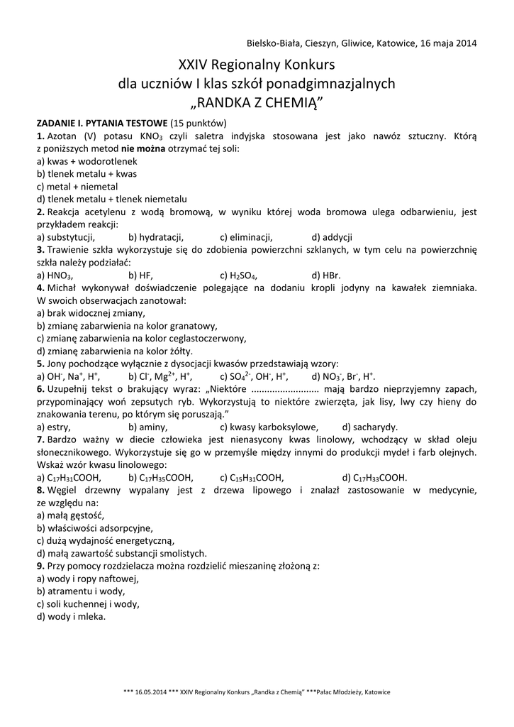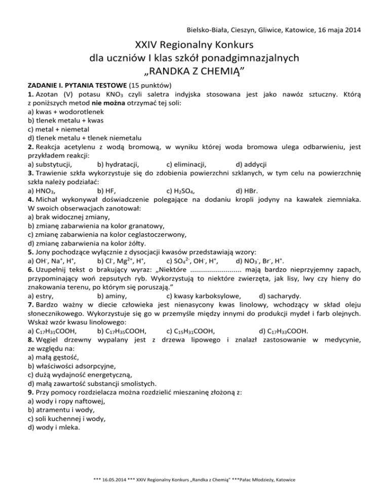 Bielsko-Biała, Cieszyn, Gliwice, Katowice, 16 maja 2014 XXIV Regionalny Konkurs dla uczniów I klas szkół ponadgimnazjalnych „RANDKA Z CHEMIĄ” ZADANIE I. PYTANIA TESTOWE (15 punktów) 1. Azotan (V) potasu KNO3 czyli saletra indyjska stosowana jest jako nawóz sztuczny. Którą z poniższych metod nie można otrzymać tej soli: a) kwas + wodorotlenek b) tlenek metalu + kwas c) metal + niemetal d) tlenek metalu + tlenek niemetalu 2. Reakcja acetylenu z wodą bromową, w wyniku której woda bromowa ulega odbarwieniu, jest przykładem reakcji: a) substytucji, b) hydratacji, c) eliminacji, d) addycji 3. Trawienie szkła wykorzystuje się do zdobienia powierzchni szklanych, w tym celu na powierzchnię szkła należy podziałać: a) HNO3, b) HF, c) H2SO4, d) HBr. 4. Michał wykonywał doświadczenie polegające na dodaniu kropli jodyny na kawałek ziemniaka. W swoich obserwacjach zanotował: a) brak widocznej zmiany, b) zmianę zabarwienia na kolor granatowy, c) zmianę zabarwienia na kolor ceglastoczerwony, d) zmianę zabarwienia na kolor żółty. 5. Jony pochodzące wyłącznie z dysocjacji kwasów przedstawiają wzory: a) OH-, Na+, H+, b) Cl-, Mg2+, H+, c) SO42-, OH-, H+, d) NO3-, Br-, H+. 6. Uzupełnij tekst o brakujący wyraz: „Niektóre .......................... mają bardzo nieprzyjemny zapach, przypominający woń zepsutych ryb. Wykorzystują to niektóre zwierzęta, jak lisy, lwy czy hieny do znakowania terenu, po którym się poruszają.” a) estry, b) aminy, c) kwasy karboksylowe, d) sacharydy. 7. Bardzo ważny w diecie człowieka jest nienasycony kwas linolowy, wchodzący w skład oleju słonecznikowego. Wykorzystuje się go w przemyśle między innymi do produkcji mydeł i farb olejnych. Wskaż wzór kwasu linolowego: a) C17H31COOH, b) C17H35COOH, c) C15H31COOH, d) C17H33COOH. 8. Węgiel drzewny wypalany jest z drzewa lipowego i znalazł zastosowanie w medycynie, ze względu na: a) małą gęstość, b) właściwości adsorpcyjne, c) dużą wydajność energetyczną, d) małą zawartość substancji smolistych. 9. Przy pomocy rozdzielacza można rozdzielić mieszaninę złożoną z: a) wody i ropy naftowej, b) atramentu i wody, c) soli kuchennej i wody, d) wody i mleka. *** 16.05.2014 *** XXIV Regionalny Konkurs „Randka z Chemią” ***Pałac Młodzieży, Katowice 10. Wskaż, które ze zdań dotyczy wiązania jonowego: a) tworzy się głównie pomiędzy atomami niemetali, b) powstaje w wyniku uwspólnienia elektronów walencyjnych, c) powstaje w wyniku przekazania elektronów walencyjnych z atomu metalu do atomu niemetalu, d) polega na przyciąganiu elektrostatycznym między atomem wodoru i atomem elektroujemnym zawierającym wolne pary elektronowe. 11. Kwaśne deszcze powstają w wyniku opadu atmosferycznego w połączeniu z : a) tlenkami siarki, tlenkami azotu, tlenkiem węgla(IV), b) tlenkami siarki, chlorowodorem, tlenkiem wapnia, c) tlenkami azotu, tlenkiem węgla(II), tlenkiem węgla(IV), d) tlenkiem magnezu, chlorowodorem, tlenkami azotu. 12. Wskaż prawidłowy zapis rozmieszczenia elektronów na powłokach dla jonu Ga3+ a) K2L8M8N8, b) K2L8M18, c) K2L8M8N13, d) K2L8M18N3. 13. Która z poniższych właściwości nie opisuje metali: a) są ciągliwe i kowalne, b) dobrze przewodzą prąd elektryczny, c) posiadają metaliczny połysk, d) są izolatorami. 14. Metal ten nazywany jest płynnym srebrem, jego źródłem są wybuchy wulkaniczne, wietrzenia i erozja minerałów. O jakim metalu mowa? a) srebro, b) cyna, c) rtęć, d) tal. 15. Sól gorzka to związek stosowany w przemyśle jako substancja susząca, natomiast w lecznictwie jako środek przeczyszczający. Składa się z metalu drugiej grupy układu okresowego oraz reszty kwasu tlenowego i nie powoduje zabarwienia płomienia palnika. Wzór tej soli to: a) Sr(NO3)2, b) MgSO4 · 7 H2O, c) CuCO3 · 2 H2O, d) BaCl2. ZADANIE II. ZADANIA OBLICZENIOWE (10 punktów) 1. W temperaturze 80 0C sporządzono 200 g 60% roztworu KNO3. Roztwór ochłodzono do 20 0C. Ile gramów KNO3 wykrystalizowało po ochłodzeniu? Rozpuszczalność KNO3 w 800C: 170,9g, Rozpuszczalność KNO3 w 200C: 31,9g a) 88,10 g, b) 56,20 g, c) 94,48 g, d) 139,00 g. 3 2. Zmieszano 300 ml 4,25 mol/l roztworu KOH (d=1,19 g/cm ) z 200 g 15% KOH. Jakie jest stężenie powstałego roztworu? a) 22,3 %, b) 18,2 %, c) 3,6 mol/dm3, d) 1,8 mol/dm3. 3. Jaką objętość w warunkach normalnych zajmuje 6,02 · 1019 cząsteczek wodoru? Wynik podaj w cm3. a) 0,00224 cm3, b) 22,4 cm3, c) 22400000 cm3, d) 2,24 cm3. 4. Pewien związek organiczny zawiera 6 atomów siarki w cząsteczce. Procentowa zawartość siarki w tym związku wynosi 4,18%. Jaka jest masa cząsteczkowa tego związku? a) 4593,3 u, b) 763,7 u, c) 192,0 u, d) 802,5 u. 5. W ilu gramach wody należy rozpuścić 25,5 g Na2SO4 · 10H2O aby otrzymać roztwór o stężeniu 5,44%? a) ok. 181 g, b) ok. 195 g, c) ok. 453 g d) ok. 469 g. *** 16.05.2014 *** XXIV Regionalny Konkurs „Randka z Chemią” ***Pałac Młodzieży, Katowice ZADANIE III. ZADANIA Z TREŚCIĄ (18 punktów) Za błędne odpowiedzi odejmowane są punkty! ZADANIE 1. Nadmierne spożywanie sacharozy prowadzi do otyłości oraz chorób układu krążenia, może też być przyczyną próchnicy zębów. W wielu produktach spożywczych sacharoza zastąpiona jest innymi substancjami słodzącymi pochodzenia naturalnego, takimi jak np. syrop klonowy, melasa czy miód lub syntetycznymi np. acesulfanem K, ksylitolem lub ponad 300 razy słodszą od sacharozy sacharyną. Przeanalizuj przedstawione poniżej wzory dwóch popularnych słodkich substancji: aspartamu i sacharozy, a następnie umieść w tabeli znak „x” jeśli stwierdzenie dotyczące danego związku jest prawdziwe. A B Związek A Związek B Jest to wzór aspartamu. Ma większą masę cząsteczkową. Posiada grupę/y hydroksylową/e. Posiada grupę karboksylową. Posiada pierścień aromatyczny. ZADANIE 2. Tlenek krzemu(IV) należy do najbardziej rozpowszechnionych w skorupie ziemskiej tlenk