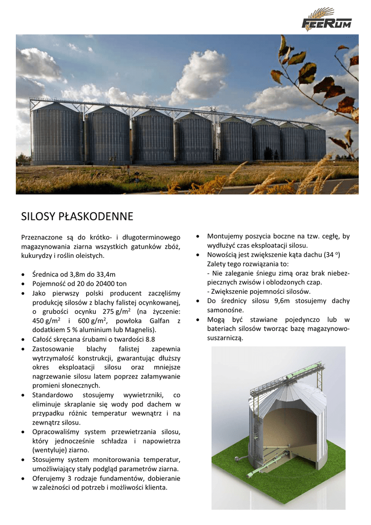 SILOSY PŁASKODENNE Przeznaczone są do krótko- i długoterminowego magazynowania ziarna wszystkich gatunków zbóż, kukurydzy i roślin oleistych. • • • • • • • • • Średnica od 3,8m do 33,4m Pojemność od 20 do 20400 ton Jako pierwszy polski producent zaczęliśmy produkcję silosów z blachy falistej ocynkowanej, o grubości ocynku 275 g/m2 (na życzenie: 450 g/m2 i 600 g/m2, powłoka Galfan z dodatkiem 5 % aluminium lub Magnelis). Całość skręcana śrubami o twardości 8.8 Zastosowanie blachy falistej zapewnia wytrzymałość konstrukcji, gwarantując dłuższy okres eksploatacji silosu oraz mniejsze nagrzewanie silosu latem poprzez załamywanie promieni słonecznych. Standardowo stosujemy wywietrzniki, co eliminuje skraplanie się wody pod dachem w przypadku różnic temperatur wewnątrz i na zewnątrz silosu. Opracowaliśmy system przewietrzania silosu, który jednocześnie schładza i napowietrza (wentyluje) ziarno. Stosujemy system monitorowania temperatur, umożliwiający stały podgląd parametrów ziarna. Oferujemy 3 rodzaje fundamentów, dobieranie w zależności od potrzeb i możliwości klienta. • • • • Montujemy poszycia boczne na tzw. cegłę, by wydłużyć czas eksploatacji silosu. Nowością jest zwiększenie kąta dachu (34 o) Zalety tego rozwiązania to: - Nie zaleganie śniegu zimą oraz brak niebezpiecznych zwisów i oblodzonych czap. - Zwiększenie pojemności silosów. Do średnicy silosu 9,6m stosujemy dachy samonośne. Mogą być stawiane pojedynczo lub w bateriach silosów tworząc bazę magazynowosuszarniczą. Standardowe wyposażenie silosu: 1. Dach silosu 2. Wywietrzniki dachowe 3. Właz dachowy ocynkowany 4. Właz boczny ocynkowany 5. Słupy nośne silosu, ocynkowane 6. Poszycie boczne silosu – stal konstrukcyjna falista ocynkowana 7. Komplet śrub, nakrętek i podkładek montażowych klasy 8.8 8. Komplet kotew mocujących silos do podłoża 9. Uszczelniacz do blach ocynkowanych 10. Wytyczne fundamentowe pod wybrany silos Dodatkowe wyposażenie silosu: 11. Czujnik napełnienia 12. Wentylator elektryczny dachowy 13. System nawiewowy dachowy do ciągu silosów 14. Drabina zewnętrzna z pałąkiem 15. Podesty spoczynkowe 16. Galeria z podporami pod transport zasypowy 17. Schody dachowe 18. Sonda temperatur z układem pomiaru 19. Rozsypnik podłużny ziarna 20. Rozsypnik ostrosłupowy 21. System kanałów do przewietrzania silosu 22. Wentylator dolny przewietrzający ziarno z wózkiem jezdnym 23. Schładzalnik do nawiewania ziarna 24. Wygarniacz ślimakowy 25. Zasuwa podsilosowa elektryczna, pneumatyczna lub ręczna 26. Metaloplastyka 27. Podłoga perforowana 28. System monitorowania komputerowego Ilość carg / Wysokość części walcowej h[m] 2 / 2,24 3 / 3,37 4 / 4,49 5 / 5,61 6 / 6,73 7 / 7,85 8 / 8,98 9/ 10,10 10 / 11,22 11 / 12,34 12 / 13,46 13 / 14,59 14 / 15,71 15 / 16,83 16 / 17,95 17 / 19,07 18 / 20,20 19 / 21,32 20 / 22,44 21 / 23,56 22 / 24,68 23 / 25,81 24 / 26,93 25 / 28,05 OBJĘTOŚĆ [m3] / (ŁADOWNOŚĆ [ton]) TYP SILOSU / ŚREDNICA - D [m] FSP 3,8 3,82 26 (20) 39 (30) 52 (40) 65 (49) 78 (59) 90 (68) 103 (78) 116 (88) FSP 4,8 4,78 FSP 5,7 5,73 FSP 6,7 6,68 63 (48) 83 (63) 108 (82) 123 (93) 143 (109) 164 (125) 184 (140) 205 (156) 84 (64) 113 (86) 142 (108) 171 (130) 200 (152) 229 (174) 258 (196) 287 (218) 316 (240) 345 (262) 374 (284) 403 (306) 157 (119) 196 (149) 236 (179) 275 (209) 314 (239) 354 (269) 393 (299) 432 (328) 472 (359) 511 (388) 551 (419) FSP 7,6 7,63 FSP 8,6 8,60 FSP 9,6 9,55 263 (200) 314 (239) 366 (278) 417 (317) 468 (356) 520 (395) 571 (434) 623 (473) 674 (512) 726 (552) 777 (591) 828 (629) 879 (668) 339 424 (258) (322) 404 504 (307) (383) 469 584 (356) (444) 534 665 (406) (505) 599 745 (455) (566) 664 825 (505) (627) 729 906 (554) (689) 794 986 (603) (749) 860 1066 (654) (810) 925 1147 (703) (872) 990 1227 (752) (933) 1055 1308 (802) (994) 1120 1388 (851) (1055) 1469 (1116) FSP 10,5 10,50 FSP 11,5 11,46 516 (392) 613 (466) 710 (540) 807 (613) 904 (687) 1001 (761) 1098 (834) 1195 (908) 1292 (982) 1390 (1056) 1487 (1130) 1584 (1204) 1681 (1278) 1779 (1352) 748 (568) 864 (657) 980 (745) 1096 (833) 1211 (920) 1327 (1009) 1413 (1074) 1559 (1185) 1674 (1272) 1790 (1360) 1906 (1449) 2021 (1536) 2137 (1624) FSP 12,4 12,42 1027 (781) 1163 (884) 1299 (987) 1435 (1091) 1570 (1193) 1706 (1297) 1842 (1400) 1978 (1503) 2114 (1607) 2249 (1709) 2385 (1813) 2521 (1916) 2657 (2019) WYSOKOŚĆ DACHU - Hd [m] 1,15 1,47 1,84 2,11 2,45 2,71 2,95 3,21 3,83 4,14 * przybliżona wartość dla pszenicy o wilgotności 14% i gęstości 0,76t/m3 FSP 15,3 15,30 1973 (1499) 2179 (1656) 2385 (1813) 2591 (1969) 2798 (2126) 3004 (2283) 3210 (2440) 3417 (2597) 3623 (2753) 3829 (2910) 4035 (3067) 4242 (3224) 4448 (3380) 4654 (3537) 5,1 FSP 18,2 18,15 FSP 20,1 20,06 FSP 22,1 22,10 2836 (2155) 3126 (2376) 3416 (2596) 3707 (2817) 3997 (3038) 4287 (3258) 4577 (3497) 4867 (3699) 5157 (3919) 5447 (4140) 5737 (4360) 6027 (4581) 6317 (4801) 6607 (5021) 3887 (2954) 4242 (3224) 4596 (3493) 4951 (3763) 5305 (4032) 5659 (4301) 6014 (4571) 6368 (4840) 6723 (5109) 7078 (5379) 7433 (5649) 7788 (5919) 8143 (6189) 4808 (3654) 5238 (3981) 5668 (4308) 6098 (4634) 6528 (4961) 6958 (5288) 7389 (5616) 7819 (5942) 8249 (6269) 8679 (6596) 9109 (6923) 9540 (7250) 9971 (7578) 5,45 6,1 6,8 FSP 23,8 23,80 FSP 30,6 30,60 FSP 33,4 33,42 7903 (6006) 8405 (6388) 8908 (6770) 9410 (7152) 9912 (7533) 10414 (7915) 10917 (8297) 11419 (8678) 13159 (10001) 13982 (10626) 14805 (11252) 15628 (11877) 16451 (12503) 17274 (13128) 18096 (13753) 18919 (14378) 19742 (15004) 20565 (15629) 21388 (16255) 22211 (16880) 16042 (12192) 17026 (12940) 18010 (13688) 18994 (14435) 19978 (15183) 20962 (15931) 21945 (16679) 22929 (17426) 23913 (18174) 24897 (18922) 25881 (19670) 26865 (20417) 7,86 10,40 11,77