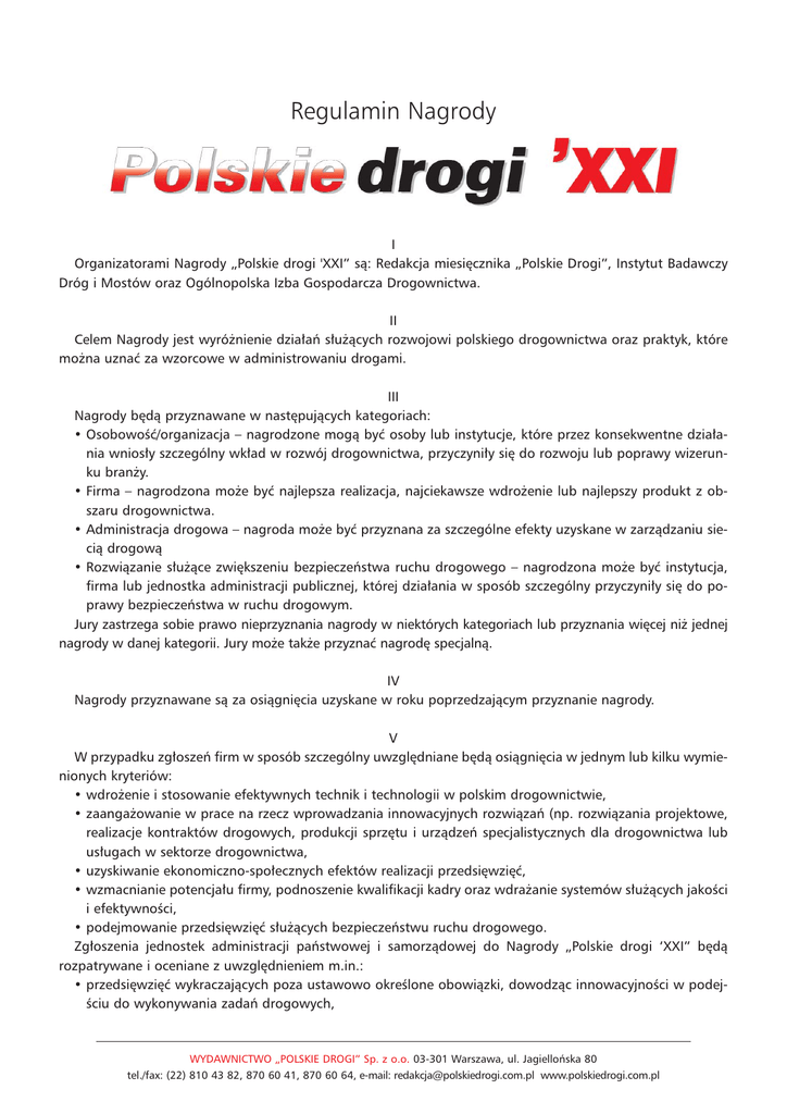Regulamin Nagrody I Organizatorami Nagrody „Polskie drogi 'XXI” są: Redakcja miesięcznika „Polskie Drogi”, Instytut Badawczy Dróg i Mostów oraz Ogólnopolska Izba Gospodarcza Drogownictwa. II Celem Nagrody jest wyróżnienie działań służących rozwojowi polskiego drogownictwa oraz praktyk, które można uznać za wzorcowe w administrowaniu drogami. III Nagrody będą przyznawane w następujących kategoriach: • Osobowość/organizacja – nagrodzone mogą być osoby lub instytucje, które przez konsekwentne działania wniosły szczególny wkład w rozwój drogownictwa, przyczyniły się do rozwoju lub poprawy wizerunku branży. • Firma – nagrodzona może być najlepsza realizacja, najciekawsze wdrożenie lub najlepszy produkt z obszaru drogownictwa. • Administracja drogowa – nagroda może być przyznana za szczególne efekty uzyskane w zarządzaniu siecią drogową • Rozwiązanie służące zwiększeniu bezpieczeństwa ruchu drogowego – nagrodzona może być instytucja, firma lub jednostka administracji publicznej, której działania w sposób szczególny przyczyniły się do poprawy bezpieczeństwa w ruchu drogowym. Jury zastrzega sobie prawo nieprzyznania nagrody w niektórych kategoriach lub przyznania więcej niż jednej nagrody w danej kategorii. Jury może także przyznać nagrodę specjalną. IV Nagrody przyznawane są za osiągnięcia uzyskane w roku poprzedzającym przyznanie nagrody. V W przypadku zgłoszeń firm w sposób szczególny uwzględniane będą osiągnięcia w jednym lub kilku wymienionych kryteriów: • wdrożenie i stosowanie efektywnych technik i technologii w polskim drogownictwie, • zaangażowanie w prace na rzecz wprowadzania innowacyjnych rozwiązań (np. rozwiązania projektowe, realizacje kontraktów drogowych, produkcji sprzętu i urządzeń specjalistycznych dla drogownictwa lub usługach w sektorze drogownictwa, • uzyskiwanie ekonomiczno-społecznych efektów realizacji przedsięwzięć, • wzmacnianie potencjału firmy, podnoszenie kwalifikacji kadry oraz wdrażanie systemów służących jakości i efektywności, • podejmowanie przedsięwzięć służących bezpieczeństwu ruchu drogowego. Zgłoszenia jednostek administracji państwowej i samorządowej do Nagrody „Polskie drogi ‘XXI” będą rozpatrywane i oceniane z uwzględnieniem m.in.: • przedsięwzięć wykraczających poza ustawowo określone obowiązki, dowodząc innowacyjności w podejściu do wykonywania zadań drogowych, WYDAWNICTWO „POLSKIE DROGI” Sp. z o.o. 03-301 Warszawa, ul. Jagiellońska 80 tel./fax: (22) 810 43 82, 870 60 41, 870 60 64, e-mail: [email protected] www.polskiedrogi.com.pl • konsekwencji w realizacji wyznaczonych działań, • systemowego podejścia do zarządzania majątkiem drogowym oraz do planowania i realizacji zadań inwestycyjnych, • podejmowania działań służących podnoszeniu jakości i trwałości dróg, • zorientowania na długofalowe korzyści, • współdziałania różnych administracji w celu uzyskania lepszych efektów. VI Kandydatów do Nagrody „Polskie drogi ‘XXI” w poszczególnych kategoriach mogą zgłaszać organizacje i instytucje reprezentujące środowiska inżynierskie i przedsiębiorstwa różnych sektorów budownictwa drogowego (stowarzyszenia, izby, korporacje), organizacje samorządowe i inne organizacje drogowców, a także firmy oraz organy administracji państwowej i jednostki samorządu. Instytucja lub organizacja może także dokonać zgłoszenia we własnym imieniu. VII Zgłoszenia będą rozpatrywane przez 5-osobowe Jury złożone z przedstawicieli Wydawnictwa „Polskie Drogi”, Ogólnopolskiej Izby Gospodarczej Drogownictwa oraz Instytutu Badawczego Dróg i Mostów. VIII Zgłoszenie (wraz z ewentualnymi załącznikami w postaci zdjęć lub innej dokumentacji) zawierające opis przedsięwzięcia nominowanego do Nagrody „Polskie drogi ‘XXI” powinno wyczerpująco prezentować uzyskane osiągnięcia. IX Rozstrzygnięcie konkursu nastąpi nie później niż do 9 maja 2014 r. Wręczenie nagród nastąpi podczas Targów Autostrada-Polska, 14 maja 2014 r. w Kielcach. X Zgłoszenia do XIV edycji Nagrody „Polskie drogi ‘XXI” należy przesłać do 18 kwietnia br. do redakcji „Polskich Dróg”, 03-301 Warszawa, ul. Jagiellońska 80 lub elektronicznie pod adresem: [email protected]. Informacje o konkursie dostępne są również na www.polskiedrogi.com.pl oraz www.oigd.com.pl. Można je także uzyskać pod numerem tel. 22 810 43 82 lub pisząc na adres: [email protected]. WYDAWNICTWO „POLSKIE DROGI” Sp. z o.o. 03-301 Warszawa, ul. Jagiellońska 80 tel./fax: (22) 810 43 82, 870 60 41, 870 60 64, e-mail: [email protected] www.polskiedrogi.com.pl