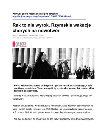 Artykuł i galerie można znaleźć pod adresem: http://trojmiasto.gazeta.pl/trojmiasto/1,35635,7554855.html _______________________________________________________________ Rak to nie wyrok. Rzymskie wakacje chorych na nowotwór tekst i fotografie: Bożena Aksamit 2010-02-13, ostatnia aktualizacja 2010-02-12 14:03 - Po co ksiądz ich zabiera do Rzymu? - pytam Jana Kaczkowskiego, szefa puckiego hospicjum. To on wymyślił tę wycieczkę, znalazł też osobę, która zapłaciła za wszystko. - Wierzę w to, że człowiek, który więcej zobaczy, dotknie i posmakuje, staje się wrażliwszy. Jest ich dwudziestka, wolontariusze z hospicjum, kilka młodych osób chorych na raka i dwóch księży - drugim jest Piotr Szeląg, na Uniwersytecie Gregoriańskim w Rzymie robi doktorat z prawa kanonicznego, będzie naszym przewodnikiem. - Nie boi się ksiądz, że chorzy nie dadzą rady? Będziemy całe dnie maszerować. - Nowotwór nie jest wyrokiem natychmiastowej śmierci, z rakiem można żyć, można też wyzdrowieć. Chciałem, aby wolontariusze nauczyli się otwartości, żeby nie paraliżował ich strach, gdy mają spojrzeć w oczy osobie, która ma zdiagnozowany nowotwór. *** - Boże, jaki on piękny! - dziewczyny szepczą do siebie. Okrzyk nie dotyczy widoku za oknem. Piękny jest konduktor, który spaceruje między fotelami w kolejce. Jedziemy do centrum miasta, tam mamy hotel. Rzym jest jeszcze piękniejszy. Za kilkanaście minut, na Piazza Del Popolo już nikt nie ogląda się za zjawiskowymi dziewczętami i chłopcami w modnych ciuchach. Nie dowierzamy, że miasto może tak wyglądać. Przez cztery dni - bo tyle będziemy w Rzymie - przyzwyczajamy się do tego, że w kościołach wiszą obrazy Caravaggia, że wszystko jest smaczne i że można trafić na śpiewającego taksówkarza. - Wy Polacy jesteście trochę smutni - powie nam na pożegnanie. - Ale to nie wasza wina, wszystko przez ten brak słońca. *** Gdy samolot wzniósł się nad bielą Gdańska, termometr pokazywał minus 12 st. Celsjusza, Rzym przywitał nas słońcem i jak tłumaczyli nam Włosi - zimnymi dniami, było tylko plus 10. Przez pierwsze dwa dni zrobiliśmy koło 20 kilometrów, zobaczyliśmy dziesiątki słynnych kościołów, placów, ulic, fontann. Egipskie obeliski, antyczne ruiny i arcydzieła renesansu - Rzym nie daje chwili oddechu. - Marta, o czym ty rozmawiasz z pacjentami hospicjum? - pytam mojej współlokatorki, gdy leżymy już w wielkim małżeńskim łożu. Nasz hotel mieści się w starej kamienicy, stojącej przy Piazza del Poppolo. Każdy pokój jest urządzony w innym kolorze, mnóstwo tu starych mebli, pięknych przedmiotów i dwuosobowych łóżek. - O życiu - Marta za miesiąc zdaje maturę, chce studiować psychologię. Ostatnio sprzeczałem się o światopogląd. To są fajne rozmowy, szczere, mądre. Czasami mam wrażenie, że więcej dostaję od pacjentów niż im daję. *** Trzeciego dnia pędzimy w pobliże dzielnicy żydowskiej i na Via dei Delfini, gdzie mieści się polska ambasada przy Stolicy Apostolskiej. Zostaliśmy zaproszeni na śniadanie przez premier Hannę Suchocką, która od 2001 roku szefuje placówce. Cała ambasada wraz z rezydencją to po prostu dwa mieszkania w kamienicy, jak to się ładnie po włosku nazywa - w palazzo. - To opowiedzcie coś o sobie - pani premier zachęca uśmiechem. - A na początek proszę do stołu. Stoją ciasta i stosy kanapek. - Bo widzi pani, ja to jestem taki chłopak, który kiedyś bawił się w narkotyki Krzysiek postanawia zacząć. - Dziś mam to za sobą i trochę pomagam w hospicjum. Przedstawiamy się po kolei. Dwie godziny później ustawiamy się w kolejce do Bazyliki św. Piotra. Nieszpory. Papież porusza się powoli. Rozdaje uśmiechy, ściska wyciągnięte dłonie. - Papa, Papa!! - krzyczą zakonnice. Kilka tysięcy sióstr przyjechało z całego świata. Dziś jest ich święto. Piszczą, klaszczą. Kilka osób wskakuje na krzesła. Nad głowami las rąk, trzymają aparaty, komórki, kamery. Po kwadransie zaczyna się nabożeństwo. *** Gdy lądujemy, nad Gdańskiem fruwa śnieg. W samolocie wymyślamy, jak zdobyć pieniądze na hospicjum. Może kalendarz z wolontariuszami, podobny do tego z portretami młodych księży, który zrobił w Rzymie furorę? Źródło: Gazeta Wyborcza Trójmiasto