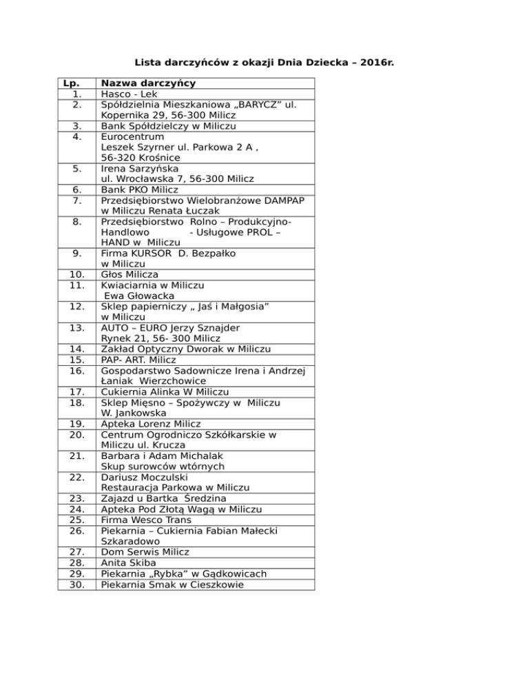Lista darczyńców z okazji Dnia Dziecka – 2016r. Lp. 1. 2. 3. 4. 5. 6. 7. 8. 9. 10. 11. 12. 13. 14. 15. 16. 17. 18. 19. 20. 21. 22. 23. 24. 25. 26. 27. 28. 29. 30. Nazwa darczyńcy Hasco - Lek Spółdzielnia Mieszkaniowa „BARYCZ” ul. Kopernika 29, 56-300 Milicz Bank Spółdzielczy w Miliczu Eurocentrum Leszek Szyrner ul. Parkowa 2 A , 56-320 Krośnice Irena Sarzyńska ul. Wrocławska 7, 56-300 Milicz Bank PKO Milicz Przedsiębiorstwo Wielobranżowe DAMPAP w Miliczu Renata Łuczak Przedsiębiorstwo Rolno – ProdukcyjnoHandlowo - Usługowe PROL – HAND w Miliczu Firma KURSOR D. Bezpałko w Miliczu Głos Milicza Kwiaciarnia w Miliczu Ewa Głowacka Sklep papierniczy „ Jaś i Małgosia” w Miliczu AUTO – EURO Jerzy Sznajder Rynek 21, 56- 300 Milicz Zakład Optyczny Dworak w Miliczu PAP- ART. Milicz Gospodarstwo Sadownicze Irena i Andrzej Łaniak Wierzchowice Cukiernia Alinka W Miliczu Sklep Mięsno – Spożywczy w Miliczu W. Jankowska Apteka Lorenz Milicz Centrum Ogrodniczo Szkółkarskie w Miliczu ul. Krucza Barbara i Adam Michalak Skup surowców wtórnych Dariusz Moczulski Restauracja Parkowa w Miliczu Zajazd u Bartka Średzina Apteka Pod Złotą Wagą w Miliczu Firma Wesco Trans Piekarnia – Cukiernia Fabian Małecki Szkaradowo Dom Serwis Milicz Anita Skiba Piekarnia „Rybka” w Gądkowicach Piekarnia Smak w Cieszkowie