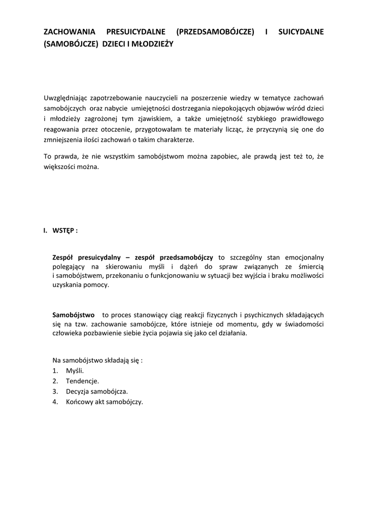 ZACHOWANIA PRESUICYDALNE (PRZEDSAMOBÓJCZE) (SAMOBÓJCZE) DZIECI I MŁODZIEŻY I SUICYDALNE Uwzględniając zapotrzebowanie nauczycieli na poszerzenie wiedzy w tematyce zachowań samobójczych oraz nabycie umiejętności dostrzegania niepokojących objawów wśród dzieci i młodzieży zagrożonej tym zjawiskiem, a także umiejętność szybkiego prawidłowego reagowania przez otoczenie, przygotowałam te materiały licząc, że przyczynią się one do zmniejszenia ilości zachowań o takim charakterze. To prawda, że nie wszystkim samobójstwom można zapobiec, ale prawdą jest też to, że większości można. I. WSTĘP : Zespół presuicydalny – zespół przedsamobójczy to szczególny stan emocjonalny polegający na skierowaniu myśli i dążeń do spraw związanych ze śmiercią i samobójstwem, przekonaniu o funkcjonowaniu w sytuacji bez wyjścia i braku możliwości uzyskania pomocy. Samobójstwo to proces stanowiący ciąg reakcji fizycznych i psychicznych składających się na tzw. zachowanie samobójcze, które istnieje od momentu, gdy w świadomości człowieka pozbawienie siebie życia pojawia się jako cel działania. Na samobójstwo składają się : 1. Myśli. 2. Tendencje. 3. Decyzja samobójcza. 4. Końcowy akt samobójczy. II. OBJAWY ZESPOŁU PRESUICYDALNEGO : • Osoba jest przekonana, że znajduje się w sytuacji bez wyjścia. • W zachowaniu dominuje lęk, bezradność, widzenie świata w czarnych barwach. • Działania w kierunku autoagresji, agresja na zewnątrz jest hamowana. • Osoba jest przekonana o swojej mniejszej wartości. • Często przyjmuje postawę rezygnacyjną. • W funkcjonowaniu dominuje sfera emocjonalna, racjonalne myślenie jest spychane na dalszy plan. • Występuje zawężenie stosunków międzyludzkich. • Osoba czuje się osamotniona, odizolowana, opuszczona i niezrozumiana. • Ucieczka od realnych trudności w świat fantazji i rozważań o śmierci i samobójstwie. • Wypowiadane są myśli o samobójstwie i swojej śmierci. • Osoba porządkuje swoje sprawy, np.: pisze testament lub szuka pojednania ze swoimi dawnymi nieprzyjaciółmi. III. MOTYWY SAMOBÓJSTW MŁODYCH LUDZI : • Model depresyjny – skłonność do samobójstwa jest rodzajem choroby i jako taka powinna być leczona. • Model stresowy – wskazuje na kontekst społeczny : - Zemsta – złość i wrogość połączone z pragnieniem wzbudzenia w innych poczucia winy i impulsywnością - Izolacja – osoba czuje się niezdolna do dopasowania się do grupy, uważa, ze nikogo nie obchodzi i nikt po niej nie będzie płakał - Beznadziejność – poczucie uwięzienia w sytuacji, nad którą człowiek nie ma kontroli ( ciąża, przemoc, alkoholizm w rodzinie, rozwód rodziców) - Niepowodzenie - często wyolbrzymione - Strata – najpoważniejsza przyczyna samobójstw. Obiekt straty może być realny( śmierć, rozstanie), symboliczny (poczucie własnej wartości, cel w życiu) lub wyimaginowany - Wahania nastroju IV. SYGNAŁY OSTRZEGAWCZE WŚRÓD DZIECI I MŁODZIEŻY ZAGROŻONEJ SAMOBÓJSTWEM : • Zachowanie w szkole – utrata zainteresowania szkołą, nieobecności, gorsze stopnie, senność, rozkojarzenie, drażliwość, tematyka śmierci w pracach pisemnych i plastycznych • Relacje interpersonalne – izolowanie się, zrywanie przyjaźni, rozdaje rzeczy, osoba nie chce być dotykana • Zachowanie w domu – utrata zainteresowania wyglądem własnym, gwałtowna zmiana wagi ciała, blizny i inne ślady samookaleczeń, zmiana godzin snu, możliwe ucieczki z domu • Inne sygnały w zachowaniu – zachowania nierozważne, niebezpieczne, zmiana nastroju, kompulsywna wesołość, wypowiedzi o śmierci bezpośrednie i pośrednie V. CZYNNIKI ZWIĘKSZAJĄCE RYZYKO ZACHOWAŃ SAMOBÓJCZYCH : 1. PSYCHOLOGICZNE: • • • • • • • • • • • • Zespoły depresyjne Negatywne zaburzenia poznawcze Natrętne negatywne myśli Negatywna kontrola wewnętrzna Nadmierny samokrytycyzm Mała skuteczność Oczekiwanie porażki Niska samoocena Obwinianie się Zachowania autoagresywne Nadużywanie alkoholu, zażywanie narkotyków Perfekcjonizm • Niedojrzałe lub dysfunkcyjne mechanizmy obronne 2. SPOŁECZNE : • • • • Porażka Niepowodzenia szkolne Problemy w domu Zawód miłosny 3. RODZINNE : • • • • • • • • • Przemoc domowa, zwłaszcza psychiczna i seksualna Faktyczna lub symboliczna nieobecność ojca Alkoholizm ojca Ciężka choroba lub śmierć kogoś z rodziny, zwłaszcza samobójcza Oddanie dziecka pod opiekę instytucji, np. domu dziecka Stawianie dziecku nieadekwatnych do jego możliwości wymagań Wzajemne oskarżanie się rodziców i podważanie autorytetu Brak opieki nad dzieckiem Dostarczanie negatywnych wzorców postępowania przez rodzinę patologiczną VI. POMOC PSYCHOLOGICZNA DLA OSÓB W SYTUACJI ZAGROŻENIA SAMOBÓJSTWEM : • • • • • • • Zapewnienie bezpieczeństwa Dostarczenie wsparcia Ocena stanu i rozmiaru kryzysu Określenie problemu kryzysowego Analiza możliwości poradzenia sobie z kryzysem Sformułowanie planów Uzyskanie zobowiązania (plan działania, możliwe rozwiązania sytuacji trudnej) VII. WSKAZÓWKI DO POSTĘPOWANIA DLA OTOCZENIA : • Wsparcie otoczenia • Rozpoznawanie czynników ryzyka, sygnałów wołania o pomoc • Akceptacja osoby i jej problemu, wzmacnianie poczucia wartości osoby, wyzwalanie jej z poczucia winy, rozpaczy i perfekcjonizmu • Programy profilaktyczne już na poziomie przedszkola, badania dzieci i postaw wychowawczych rodziców • Kierowanie do specjalistycznych ośrodków pomocy : poradnie zdrowia psychicznego, poradnie psychologiczno – pedagogiczne, ośrodki interwencji psychologicznej. Opracowała: Jolanta Wdowiak–Konkolska – psycholog Bibliografia: 1. Badura-Madej Wanda: Kryzysy i interwencja kryzysowa w terapii dzieci i młodzieży w ,,Psychiatria dzieci i młodzieży" pod red. Ireny Namysłowskiej. - Warszawa: Wydaw. Lekarskie PZWL 2004 2. Kozak Stanisław: