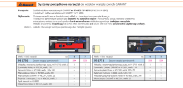 Systemy porządkowe narzędzi do wózków warsztatowych GARANT Pasuje do: Szuflad wózków warsztatowych GARANT nr 916300 / 916310 (916320 / 916340) i mobilnych stołów warsztatowych GARANT nr 916330. Wykonanie: Zestawy narzędziowe w dwukolorowej wkładce z twardego tworzywa piankowego. Tworzywo o zamkniętych porach jest odporne na działanie olejów i nie wchłania cieczy. Warstwa wierzchnia antracytowa, umieszczona pod spodem kontrastowa barwa niebieska sygnalizuje brakujące narzędzia. Wkładki z tworzywa wypełniają 1/3 (176×390×30 mm) albo 2/3 (352× 390×30 mm) powierzchni użytkowej szuflady. Wielk. 0 – wkładki z twardego tworzywa piankowego bez narzędzi (puste). 1 1 3 Wielk. = ilość narzędzi 91 6710 szt. Zestaw narzędzi pomiarowych Wkładka z tworzywa piankowego, pusta, nr 91 6710, wielk. 0 Suwmiarka Holex, nr 41 0200, wielk. 150 Kątownik Holex nr 45 2600, wielk. 150×100 Miara stalowa Holex nr 46 1805, wielk. 300 Miara zwijana GARANT nr 46 2201, wielk. 2,5 Przymiar z tworzywa, 2 m, nr 46 6200, wielk. 2 Rysik traserski nr 45 8800 Poziomnica Holex nr 46 7435, wielk. 300 0 7 XXX XXX 1 − − − − − − − 1 1 1 1 1 1 1 1 3 Wielk. = ilość narzędzi 91 6711 szt. Zestaw narzędzi pomiarowych Wkładka z tworzywa piankowego, pusta, nr 91 6711, wielk. 0 Suwmiarka cyfrowa GARANT nr 41 2601, wielk. 150 Kątownik płaski Holex nr 45 2100, wielk. 100×70 Kątomierz Holex nr 45 3000, wielk. 120×150 Precyzyjny przymiar stalowy Holex nr 46 1600, wielk. 300 Miara zwijana GARANT nr 46 2201, wielk. 2,5 0 5 XXX XXX 1 − − − − − 1 1 1 1 1 1