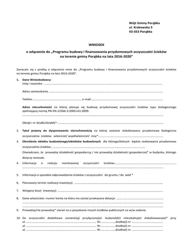 Wójt Gminy Porąbka ul. Krakowska 3 43-353 Porąbka WNIOSEK o włączenie do „Programu budowy i finansowania przydomowych oczyszczalni ścieków na terenie gminy Porąbka na lata 2016-2020” Zwracam się z prośbą o włączenie mnie do „Programu budowy i finansowania przydomowych oczyszczalni ścieków na terenie gminy Porąbka na lata 2016-2020”. 1. Dane Wnioskodawcy: Imię i nazwisko …………………………………………………………………………………………………………………………………………… Adres zamieszkania ……………………………………………………………………………………………………………………………………… Telefon ……………….………………………………………. e-mail…………………………………………….……………………………………… Adres nieruchomości na której planuje się budowę przydomowej oczyszczalni ścieków typu biologicznego spełniającej normę PN-EN-12566-3:2005+A1:2009: ……………………………………………………………………………………………………………………………………………………………………… Obręb i nr działki/działek*: …………………………………………………………………………………………………………………………… 2. Tytuł prawny do dysponowania nieruchomością na której zostanie zlokalizowana przydomowa biologiczna oczyszczalnia ścieków: właściciel/ współwłaściciel/ inny*…………………………………………………………………………… 3. Określenie obiektu budowlanego/obiektów budowlanych dla którego/których będzie realizowania przydomowa oczyszczalnia ścieków:……………………………………………………………………………………………………………… Oświadczam, że prowadzę działalność gospodarczą / nie prowadzę działalności gospodarczej* w budynku, którego dotyczy wniosek. 4. Informacja o rodzaju montowanej oczyszczalni ścieków:………………………………………………………………………. ……………………………………………………………………………………………………………………………………………………………………… 5. Informacja o sposobie odprowadzenia ścieków z oczyszczalni: do gruntu / do wód * 6. Planowany termin realizacji inwestycji: ………………………………………………………………………………………………………. 7. Wstępny koszt inwestycji: …………………………………………………………………………………………………………………………... 8. Dane właściciela i numer konta na który ma zostać przekazana dotacja: ……………………………………………………… ……………………………………………………………………………………………………………………………………………………………………… ……………………………………………………………………………………………………………………………………………………………………… Prowadzę/nie prowadzę* starań na o pozyskanie innych środków publicznych na w/w zadanie. 9. 10. Do oczyszczalni dodatkowo zostanie(ą) przyłączony(e): budynek(ki) mieszkalny(e) zlokalizowany(e)* przy ul. …………………………………………………………………………………. Nr………………, działka(i) nr …………………………………... ul. …………………………………………………………………………………. Nr………………, działka(i) nr …………………………………... ul. …………………………………………………………………………………. Nr………………, działka(i) nr …………………………………... 11. Inne istotne informacje: ………………………………………………………………………………………………………………………………. ……………………………………………………………………………………………………………………………………………………………………… ……………………………………………………………………………………………………………………………………………………………………… Oświadczam, że: 1) 2) 3) 4) 5) 6) 7) 8) Nie posiadam zaległości z tytułu podatków, opłat i innych należności względem Gminy Porąbka. Będę użytkował oczyszczalnię zgodnie z rozwiązaniem projektowym oraz zaleceniami producenta. Zapoznałem się i akceptuję treść Regulaminu realizacji „Programu budowy i finansowania przydomowych oczyszczalni ścieków na terenie gminy Porąbka na lata 2016-2020”. Budynek, który zamierzam podłączyć do przydomowej oczyszczalni ścieków został oddany do użytkowania zgodnie z Prawem budowlanym, / (dla nowo budowanych budynków) zostanie oddany do użytkowania w terminie do ……………………………………………………... Wyrażam zgodę na przetwarzanie swoich danych osobowych w ramach realizacji „Programu budowy i finansowania przydomowych oczyszczalni ścieków na terenie gminy Porąbka na lata 2016-2020”, zgodnie z Ustawą z dnia 29 sierpnia 1997 r. o ochronie danych osobowych (tekst jednolity Dz. U. z 2014 r., poz. 1182 ze zm.). W przypadku likwidacji instalacji przed upływem 5 lat od daty zakończenia zadania, licząc od 1 stycznia roku następnego po realizacji inwestycji dotację zwrócę wraz z odsetkami w wysokości jak dla zaległości podatkowych. Wyrażam zgodę na przesunięcie, w uzgodnieniu ze mną, terminu realizacji zadania 