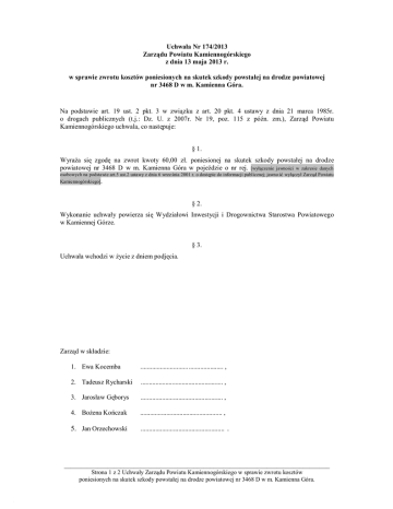 Uchwała Nr 174/2013 Zarządu Powiatu Kamiennogórskiego z dnia 13 maja 2013 r. w sprawie zwrotu kosztów poniesionych na skutek szkody powstałej na drodze powiatowej nr 3468 D w m. Kamienna Góra. Na podstawie art. 19 ust. 2 pkt. 3 w związku z art. 20 pkt. 4 ustawy z dnia 21 marca 1985r. o drogach publicznych (t.j.: Dz. U. z 2007r. Nr 19, poz. 115 z późn. zm.), Zarząd Powiatu Kamiennogórskiego uchwala, co następuje: § 1. Wyraża się zgodę na zwrot kwoty 60,00 zł. poniesionej na skutek szkody powstałej na drodze powiatowej nr 3468 D w m. Kamienna Góra w pojeździe o nr rej. [wyłączenie jawności w zakresie danych osobowych na podstawie art.5 ust.2 ustawy z dnia 6 wrze śnia 2001 r. o dostępie do informacji publicznej; jawno ść wyłączył Zarząd Powiatu Kamiennogórskiego]. § 2. Wykonanie uchwały powierza się Wydziałowi Inwestycji i Drogownictwa Starostwa Powiatowego w Kamiennej Górze. § 3. Uchwała wchodzi w życie z dniem podjęcia. Zarząd w składzie: 1. Ewa Kocemba ............................. ..................... , 2. Tadeusz Rycharski .................................................. , 3. Jarosław Gęborys .................................................. , 4. Bożena Kończak .................................................. , 5. Jan Orzechowski ................................................... . ________________________________________________________________________________ Strona 1 z 2 Uchwały Zarządu Powiatu Kamiennogórskiego w sprawie zwrotu kosztów poniesionych na skutek szkody powstałej na drodze powiatowej nr 3468 D w m. Kamienna Góra. UZASADNIENIE do Uchwały Nr 174/2013 Zarządu Powiatu Kamiennogórskiego z dnia 13 maja 2013r. w sprawie zwrotu kosztów poniesionych na skutek szkody powstałej na drodze powiatowej nr 3468 D w m. Kamienna Góra. W dniu 20.03.2013 r. Pan [wyłączenie jawności w zakresie danych osobowych na podstawie art.5 ust.2 ustawy z dnia 6 września 2001 r. o dostępie do informacji publicznej; jawno ść wyłączył Zarząd Powiatu Kamiennogórskiego] zgłosił uszkodzenie pojazdu na drodze powiatowej 3468 D ul. Krzeszowska w m. Kamienna Góra, polegające na awarii poduszki amortyzatora tylnego koła w pojeździe o nr rej [wyłączenie jawności w zakresie danych osobowych na podstawie art.5 ust.2 ustawy z dnia 6 września 2001 r. o dostępie do informacji publicznej; jawno ść wyłączył Zarząd Powiatu Kamiennogórskiego]. Poszkodowany wniósł o zwrot 120,00 zł wynikających z zakupu oraz wymiany części. Wnioskowana kwota jest niższa od franszyzy integralnej (wynoszącej 300,00 zł), zatem szkody poniżej tej wartości winny być pokrywane bezpośrednio z budżetu powiatu kamiennogórskiego. W związku z tym iż poszkodowany udokumentował jedynie wydatek w wysokości 60,00 zł poniesiony na zakup poduszki silnika (kserokopia paragonu fiskalnego z dnia 21.03.2013 r.) wnioskuje się o wypłatę rzeczonej kwoty. ________________________________________________________________________________ Strona 2 z 2 Uchwały Zarządu Powiatu Kamiennogórskiego w sprawie zwrotu kosztów poniesionych na skutek szkody powstałej na drodze powiatowej nr 3468 D w m. Kamienna Góra.