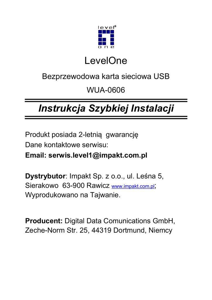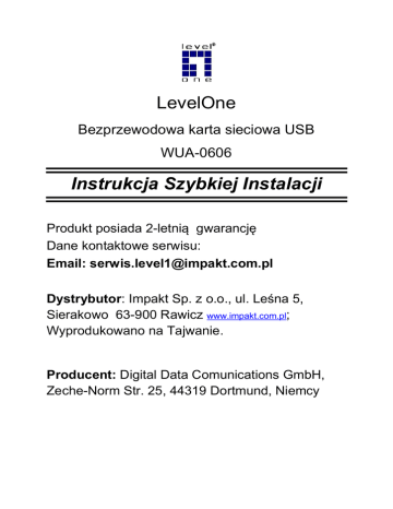 LevelOne Bezprzewodowa karta sieciowa USB WUA-0606 Instrukcja Szybkiej Instalacji Produkt posiada 2-letnią gwarancję Dane kontaktowe serwisu: Email: [email protected] Dystrybutor: Impakt Sp. z o.o., ul. Leśna 5, Sierakowo 63-900 Rawicz www.impakt.com.pl; Wyprodukowano na Tajwanie. Producent: Digital Data Comunications GmbH, Zeche-Norm Str. 25, 44319 Dortmund, Niemcy Przekreślony kosz - produkt oznaczony tym symbolem oznacza, że nie może być traktowany jako odpad domowy. Zapewniając prawidłową utylizację pomagasz chronić środowisko naturalne. W celu uzyskania szczegółowych informacji dotyczących recyklingu niniejszego produktu należy skontaktować się z punktem sprzedaży detalicznej, w którym dokonano zakupu, lub organem władzy lokalnej. Oznakowanie CE - umieszczone na wyrobie jest deklaracją producenta, że oznakowany produkt spełnia wymagania dyrektyw tzw. "Nowego Podejścia" Unii Europejskiej. Dyrektywy te dotyczą zagadnień związanych z bezpieczeństwem użytkowania, ochroną zdrowia i ochroną środowiska, określają zagrożenia, które producent powinien wykryć i wyeliminować. Zatem oznaczenie świadczy o tym, że produkt nie zagraża zdrowiu ani nie jest szkodliwy dla środowiska naturalnego. Oznaczenie ROHS - celem wprowadzenia dyrektywy jest zmniejszenie ilości substancji niebezpiecznych, produkt został wyprodukowany zgodnie z tą dyrektywą. 1. Włóż płytę CD-ROM do napędu, jeśli nie instalacja nie uruchomi się automatycznie, uruchom autorun.exe. 2. Wybierz Easy Setup. Naciśnij „akceptuję warunki umowy”/”I accept the terms of the license agreement” i naciśnij „Next”. 3. Naciśnij “Next”. 4. Naciśnij “Install” 5. Instalacja oprogramowania i sterowników. 6. W Windows Vista może wyskoczyć komunikat, naciśnij “Zainstaluj mimo to”/”Install this driver software anyway”. 7. Naciśnij „Finish”. 8. Po instalacji pojawi się ikona w obszarze powiadomień w Windows. Uwaga przekreślona ikona oznacza, że adapter nie jest podłączony do portu USB. 9. Teraz podłącz adapter do wolnego portu USB i postępuj zgodnie z instrukcjami na ekranie. Instalacja zakończona, możesz przejść do konfiguracji. Konfiguracja sieci bezprzewodowej. 10. Kliknij dwukrotnie na ikonę LevelOne Wireless LAN Utility znajdującą się na pulpicie. 11. Przejdź do zakładki „Site Survery”, aby zeskanować dostępne sieci bezprzewodowe. Kliknij dwukrotnie na dostępną sieć, do której chcesz się przyłączyć. Spowoduje to powstanie nowego profilu. Wybierz rodzaj szyfrowania i wpisz klucz sieciowy. Ustawienia te muszą być identyczne jak w Routerze/Access Poincie. 12. Naciśnij „->” aby kontynuować. 13. Naciśnij „->” aby zakończyć konfigurację. UWAGA LevelOne rekomenduje szyfrowanie WPA2PSK (AES), pozwala ono na maksymalne zmniejszenie prawdopodobieństwa włamania.