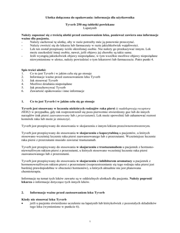 Ulotka dołączona do opakowania: informacja dla użytkownika Tyverb 250 mg tabletki powlekane Lapatynib Należy zapoznać się z treścią ulotki przed zastosowaniem leku, ponieważ zawiera ona informacje ważne dla pacjenta. Należy zachować tę ulotkę, aby w razie potrzeby móc ją ponownie przeczytać. Należy zwrócić się do lekarza lub farmaceuty w razie jakichkolwiek wątpliwości. Lek ten został przepisany ściśle określonej osobie. Nie należy go przekazywać innym. Lek może zaszkodzić innej osobie, nawet, jeśli objawy jej choroby są takie same. Jeśli wystąpią jakiekolwiek objawy niepożądane, w tym wszelkie możliwe objawy niepożądane niewymienione w ulotce, należy powiedzieć o tym lekarzowi lub farmaceucie. Patrz punkt 4. Spis treści ulotki: 1. Co to jest Tyverb i w jakim celu się go stosuje 2. Informacje ważne przed zastosowaniem leku Tyverb 3. Jak stosować Tyverb 4. Możliwe działania niepożądane 5. Jak przechowywać Tyverb 6. Zawartość opakowania i inne informacje 1. Co to jest Tyverb i w jakim celu się go stosuje Tyverb jest stosowany w leczeniu niektórych rodzajów raka piersi (z nadekspresją receptora HER2) w przypadku, gdy rak rozprzestrzenił się poza pierwotnie stwierdzony guz lub do innych narządów (rak piersi zaawansowany lub z przerzutami). Lek może spowolnić lub zahamować rozrost komórek raka lub może je zniszczyć. Tyverb jest przepisywany do stosowania w skojarzeniu z innym lekiem przeciwnowotworowym. Tyverb jest przepisywany do stosowania w skojarzeniu z kapecytabiną u pacjentów, u których stosowano wcześniej leczenie raka piersi zaawansowanego lub z przerzutami. Wcześniejsze leczenie raka piersi z przerzutami musiało zawierać trastuzumab. Tyverb jest przepisywany do stosowania w skojarzeniu z trastuzumabem u pacjentek z hormononiewrażliwym rakiem piersi z przerzutami, u których stosowano wcześniej leczenie raka piersi zaawansowanego lub z przerzutami. Tyverb jest przepisywany do stosowania w skojarzeniu z inhibitorem aromatazy u pacjentek z hormonowrażliwym rakiem piersi z przerzutami (rozprzestrzenianie się tego rodzaju raka piersi jest bardziej prawdopodobne w obecności hormonów), u których aktualnie nie jest planowana chemioterapia. Informacje na temat tych leków zawarte są w oddzielnych ulotkach dla pacjenta. Należy poprosić lekarza o informacje dotyczące tych innych leków. 2. Informacje ważne przed zastosowaniem leku Tyverb Kiedy nie stosować leku Tyverb jeśli u pacjenta stwierdzono uczulenie na lapatynib lub którykolwiek z pozostałych składników tego leku (wymienione w punkcie 6). 1 Kiedy zachować szczególną ostrożność stosując Tyverb Przed rozpoczęciem leczenia i w trakcie stosowania leku Tyverb lekarz przeprowadzi badania oceniające czy czynność serca jest prawidłowa. Przed rozpoczęciem stosowania leku Tyverb należy poinformować lekarza, jeśli u pacjenta występuje choroba serca. Przed rozpoczęciem stosowania leku Tyverb należy również poinformować lekarza: jeśli pacjent ma chorobę płuc jeśli pacjent ma zapalenie płuc jeśli pacjent ma chorobę wątroby jeśli pacjent ma chorobę nerek jeśli pacjent ma biegunkę (patrz punkt 4). Przed rozpoczęciem leczenia i podczas stosowania leku Tyverb lekarz zaleci przeprowadzenie badań oceniających czy czynność wątroby jest prawidłowa. Należy poinformować lekarza w przypadku wystąpienia tych okoliczności. Ciężkie reakcje skórne W związku zastosowaniem produktu Tyverb obserwowano ciężkie reakcje skórne. Objawy mogą obejmować wysypkę skórną, pęcherze i złuszczanie skóry. Należy jak najszybciej poinformować lekarza w razie wystąpienia któregokolwiek z tych objawów. Inne leki i Tyverb Należy powiedzieć lekarzowi lub farmaceucie o wszystkich lekach przyjmowanych obecnie lub ostatnio, a także o lekach, które pacjent planuje stosować. Dotyczy to również leków ziołowych i innych leków, które wydawane są bez recepty. Szczególnie ważne jest, aby poinformować lekarza w przypadku stosowania aktualnie lub ostatnio któregokolwiek z leków wymienionych poniżej. Niektóre leki mogą wpływać na działanie leku Tyverb lub lek Tyverb może wpływać na działanie innych leków. Dotyczy to niektórych leków z opisanych poniżej grup: leki zawierające ziele dziurawca – leki ziołowe stosowane w leczeniu depresji erytromycyna, ketokonazol, itrakonazol, posakonazol, worykonazol, ryfabutyna, ryfampicyna, telitromycyna – leki stosowane w leczeniu infekcji cyklosporyna – lek stosowany w celu osłabienia układu odporności na przykład po przeszczepieniu narządu rytonawir, sakwinawir – leki stosowane w leczeniu HIV fenytoina, karbamazepina – leki stosowane w leczeniu napadów padaczkowych cyzapryd – lek stosowany w leczeniu niektórych zaburzeń układu trawiennego pimozyd – lek stosowany w leczeniu niektórych zaburzeń psychicznych chinidyna, digoksyna – leki stosowane w leczeniu niektórych chorób serca repaglinid – lek stosowany w leczeniu cukrzycy werapamil – lek stosowany w leczeniu wysokiego ciśnienia krwi lub chorób serca (choroby niedokrwiennej serca) nefazodon – lek stosowany w leczeniu depresji topotekan, paklitaksel, irynotekan, docetaksel – leki stosowane w leczeniu niektórych rodzajów raka rozuwastatyna – lek stosowany w leczeniu dużego stężenia cholesterolu we krwi leki zmniejszające kwaśność soku żołądkowego – stosowane w leczeniu choroby wrzodowej żołądka lub niestrawności 2 Należy poinformować lekarza w przypadku stosowania aktualnie lub ostatnio któregokolwiek z tych leków. Lekarz dokona przeglądu leków stosowanych aktualnie przez pacjenta, aby upewnić się, że nie są stosowane żadne leki, których nie można przyjmować jednocześnie z lekiem Tyverb. Lekarz udzieli informacji na temat możliwości innego leczenia. Tyverb z jedzeniem i piciem Podczas leczenia lekiem Tyverb nie należy pić soku grejpfrutowego. Może mie