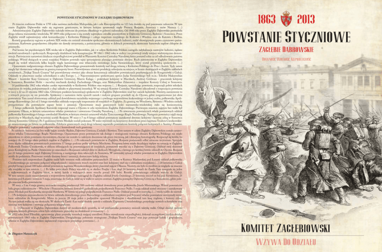 POWSTANIE STYCZNIOWE W ZAGŁĘBIU DĄBROWSKIM Po trzecim rozbiorze Polski w 1795 roku zarówno zachodnia Małopolska, jak i cała Rzeczpospolita na 123 lata dostała się pod panowanie zaborców. W tym czasie Zagłębie Dąbrowskie stało się regionem granicznym, w którym kolejno sprawowali rządy Prusacy, Rosjanie, Austriacy i znów Niemcy. (…) Administracyjnie Zagłębie Dąbrowskie należało wówczas do powiatu olkuskiego w guberni radomskiej. Od 1848 roku przez Zagłębie Dąbrowskie prowadziła droga żelazna warszawsko-wiedeńska. W 1859 roku połączone z nią zostały największe ośrodki przemysłowe w Dąbrowie Górniczej, Będzinie i Sosnowcu. Przez Zagłębie wiódł najważniejszy szlak komunikacyjny z Królestwa Polskiego i całego imperium rosyjskiego do Krakowa i Wiednia oraz do Katowic i Berlina. Rozwój gospodarczy regionu w połowie XIX wieku nie zmienił stosunków społeczno-ekonomicznych ludności, nadal obowiązywało prawo czynszowo-pańszczyźniane. Karłowate gospodarstwa chłopskie nie dawały utrzymania, a pańszczyzna, głównie w dobrach prywatnych, skutecznie hamowała napływ chłopów do przemysłu. Pod koniec lat pięćdziesiątych XIX wieku tak w Zagłębiu Dąbrowskim, jak i w całym Królestwie Polskim nastąpiła radykalizacja nastrojów ludności, żądano swobód narodowych i społecznych. Rozpoczęły działalność koła konspiracyjne. W 1861 i 1862 roku w stolicy i na prowincji miały miejsce wielotysięczne demonstracje. Patriotycznie nastawieni działacze niepodległościowi powołali w Warszawie Komitet Centralny Narodowy, który postawił sobie za cel odbudowanie państwa polskiego. Wśród służących w armii rosyjskiej Polaków powstało tajne sprzysiężenie planujące powstanie zbrojne. Ruch patriotyczny w Zagłębiu Dąbrowskim skupił się wokół właściciela kilku kopalń węgla kamiennego oraz właściciela ziemskiego Jacka Siemieńskiego, który został przywódcą spiskowców. (…) Opanowanie nadgranicznego obszaru Zagłębia Dąbrowskiego gwarantowało kontrolę nad drogą żelazną z Królestwa Polskiego do Prus i Austrii. Tędy zatem mogły być dostarczane zakupione za granicą transporty broni. Przewidywano również produkcję uzbrojenia na miejscu, w licznie działających w Zagłębiu zakładach metalowych. „Trójkąt Trzech Cesarzy” był przewidywany również jako obszar koncentracji oddziałów powstańczych przybywających do Kongresówki z Galicji. Oddziały te planowano zasilać ochotnikami z całej Europy. (…) Najczynniejszymi spiskowcami oprócz Jacka Siemieńskiego byli m.in.: Telesfor Maksymilian Wanert – kontroler Kasy Górniczej w Dąbrowie Górniczej, Marcin Kalaga – praktykant kolejowy w Maczkach, Andrzej Goldman – pracownik kolejowy w Sosnowcu, Bronisław Holtz – naczelny mechanik dyrekcji Zachodniego Okręgu, oraz Maksymilian Zdanowicz – inspektor Komory Celnej w Sosnowcu. 14 października 1862 roku władze carskie wprowadziły w Królestwie Polskim stan wojenny. (…) Rosjanie, uprzedzając powstanie, rozpoczęli pobór młodych mężczyzn do wojska, podejrzewanych o chęć udziału w planowanej insurekcji. W tej sytuacji Komitet Centralny Narodowy zdecydował o rozpoczęciu powstania w nocy z 22 na 23 stycznia 1863 roku. Głównym punktem koncentracji spiskowców w Zagłębiu Dąbrowskim miał być zamek będziński. Niestety, zamierzenie to z różnych przyczyn się nie powiodło. Spiskowcy z nastaniem świtu opuścili zamek i małymi grupami przedarli się do Ojcowa, gdzie zorganizowano już obóz powstańczy. Tam został sformowany oddział pod dowództwem naczelnika wojennego i cywilnego województwa krakowskiego w jednej osobie, pułkownika Apolinarego Kurowskiego. Już od 1 lutego niewielkie oddziały rozpoczęły rozpoznanie sił rosyjskich w Zagłębiu. Za granicą, we Wrocławiu, Bytomiu i Wiedniu czekały przygotowane dla powstańców zapasy broni i amunicji. Oponowanie stacji granicznych kolei warszawsko-wiedeńskiej stało się koniecznością. 5 lutego pułkownik Apolinary Kurowski rozpoczął marsz z Ojcowa w celu wyzwolenia Zagłębia Dąbrowskiego. Pierwszym miastem zajętym bez walki był powiatowy Olkusz, w którym ustanowiono władze powstańcze i utworzono Gwardię Narodową. (…) Po utworzeniu powstańczych władz powiatowych oddział pułkownika Kurowskiego 6 lutego oswobodził Sławków, w którym również ustanowił władze Tymczasowego Rządu Narodowego. Następnie powstańcy zajęli stację graniczną w Maczkach, skąd wcześniej uciekli Rosjanie. W nocy z 7 na 8 lutego oddział powstańczy zaatakował dworzec kolejowy i komorę celną w Sosnowcu (dzisiaj Sosnowiec Główny). Po 5-godzinnej bitwie Moskale zostali pokonani. W walce wyróżnili się kosynierzy dowodzeni przez kapitana Teodora Cieszkowskiego awansowanego po bitwie na pułkownika. Zdobycie granicznych stacji drogi żelaznej zapewniło powstańcom kontrolę połączeń kolejowych z Austrią i Prusami. Odtąd to powstańcy wykonywali odprawy celne i kontrolowali ruch graniczny. Po zdobyciu Sosnowca już bez walki zajęte zostały: Będzin, Dąbrowa Górnicza, Czeladź i Siewierz. Tym samym w całym Zagłębiu Dąbrowskim została ustanowiona władza Tymczasowego Rządu Narodowego. Opanowanie przez powstańców tak dużego i strategicznie ważnego obszaru Królestwa Polskiego nie miało precedensu w całym powstaniu styczniowym, chociaż nie zostało to należycie docenione tak przez ówczesną, jak i dzisiejszą historiografię. Rozpoczął się krótki, bo trwający do 23 lutego okres polskich rządów w Zagłębiu. (…) Po sukcesach powstańców w Zagłębiu, Rosjanie postanowili odbić utracone terytorium. Sprzyjała temu klęska oddziałów powstańczych poniesiona 17 lutego podczas próby zdobycia Miechowa. Przegrana bitwa miała decydujący wpływ na sytuację w Zagłębiu. Pułkownik Teodor Cieszkowski, w obliczu zbliżających się przeważających sił rosyjskich, postanowił wycofa