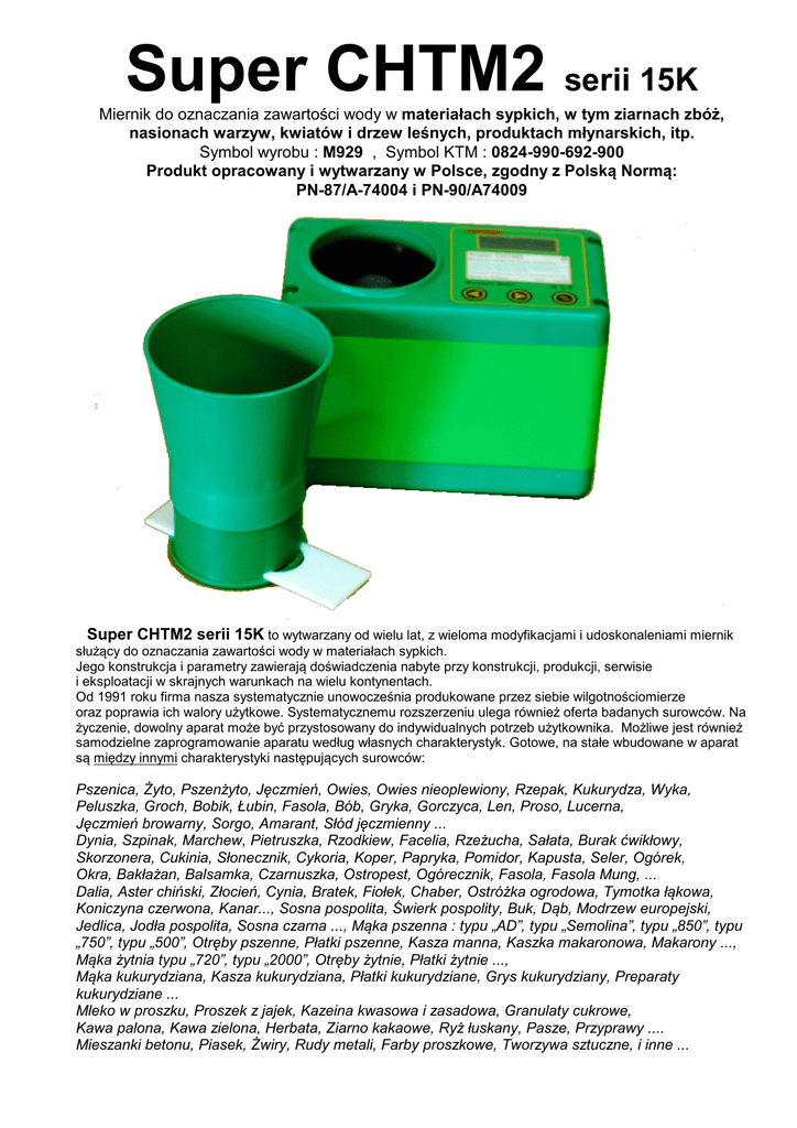 Super CHTM2 serii 15K Miernik do oznaczania zawartości wody w materiałach sypkich, w tym ziarnach zbóż, nasionach warzyw, kwiatów i drzew leśnych, produktach młynarskich, itp. Symbol wyrobu : M929 , Symbol KTM : 0824-990-692-900 Produkt opracowany i wytwarzany w Polsce, zgodny z Polską Normą: PN-87/A-74004 i PN-90/A74009 Super CHTM2 serii 15K to wytwarzany od wielu lat, z wieloma modyfikacjami i udoskonaleniami miernik służący do oznaczania zawartości wody w materiałach sypkich. Jego konstrukcja i parametry zawierają doświadczenia nabyte przy konstrukcji, produkcji, serwisie i eksploatacji w skrajnych warunkach na wielu kontynentach. Od 1991 roku firma nasza systematycznie unowocześnia produkowane przez siebie wilgotnościomierze oraz poprawia ich walory użytkowe. Systematycznemu rozszerzeniu ulega również oferta badanych surowców. Na życzenie, dowolny aparat może być przystosowany do indywidualnych potrzeb użytkownika. Możliwe jest również samodzielne zaprogramowanie aparatu według własnych charakterystyk. Gotowe, na stałe wbudowane w aparat są między innymi charakterystyki następujących surowców: Pszenica, Żyto, Pszenżyto, Jęczmień, Owies, Owies nieoplewiony, Rzepak, Kukurydza, Wyka, Peluszka, Groch, Bobik, Łubin, Fasola, Bób, Gryka, Gorczyca, Len, Proso, Lucerna, Jęczmień browarny, Sorgo, Amarant, Słód jęczmienny ... Dynia, Szpinak, Marchew, Pietruszka, Rzodkiew, Facelia, Rzeżucha, Sałata, Burak ćwikłowy, Skorzonera, Cukinia, Słonecznik, Cykoria, Koper, Papryka, Pomidor, Kapusta, Seler, Ogórek, Okra, Bakłażan, Balsamka, Czarnuszka, Ostropest, Ogórecznik, Fasola, Fasola Mung, ... Dalia, Aster chiński, Złocień, Cynia, Bratek, Fiołek, Chaber, Ostróżka ogrodowa, Tymotka łąkowa, Koniczyna czerwona, Kanar..., Sosna pospolita, Świerk pospolity, Buk, Dąb, Modrzew europejski, Jedlica, Jodła pospolita, Sosna czarna ..., Mąka pszenna : typu „AD”, typu „Semolina”, typu „850”, typu „750”, typu „500”, Otręby pszenne, Płatki pszenne, Kasza manna, Kaszka makaronowa, Makarony ..., Mąka żytnia typu „720”, typu „2000”, Otręby żytnie, Płatki żytnie ..., Mąka kukurydziana, Kasza kukurydziana, Płatki kukurydziane, Grys kukurydziany, Preparaty kukurydziane ... Mleko w proszku, Proszek z jajek, Kazeina kwasowa i zasadowa, Granulaty cukrowe, Kawa palona, Kawa zielona, Herbata, Ziarno kakaowe, Ryż łuskany, Pasze, Przyprawy .... Mieszanki betonu, Piasek, Żwiry, Rudy metali, Farby proszkowe, Tworzywa sztuczne, i inne ... W każdym z podanych przypadków Super CHTM2 umożliwia oznaczanie zawartości wody w objętościowych porcjach surowca, zasypywanie komory do pełna - max 450ml, bądź porcjach uprzednio zważonych. Pomiary dokonywane są dla wszystkich spotykanych w praktyce wartości zawartości wody, np. dla kukurydzy do ponad 60% zawartości wody.. Super CHTM2 dokonuje pośredniej identyfikacji wilgotności badanych surowców przez zbadanie ich właściwości w polu elektromagnetycznym wysokiej częstotliwości. Warunkiem niezbędnym uzyskania poprawnych wyników jest stosowanie lejków zasypowych stanowiących wyposażenie miernika. Konstrukcja urządzenia jest oryginalnym opracowaniem firmy, szereg rozwiązań zostało opatentowanych. W zastosowaniu do badania zawartości wody we wszystkich oferowanych wersjach nasze urządzenie posiada zupełnie wyjątkowe właściwości. Nie niszczy i nie uszkadza badanych materiałów. Dla poprawnego działania nie wymaga zewnętrznego zasilania ani specjalnego, wydzielonego stanowiska roboczego. Miernik jest odporny na kurz, wstrząsy, intensywne światło słoneczne. Z uwagi na niewielkie wymiary i masę (1400g) pozwala na stosowanie w polu, przy suszarni albo w laboratorium. Obecny model i jego wcześniejsze odmiany przeszły w kilkunastu sezonach pomyślne testy w różnych i często skrajnych warunkach u licznych dotychczasowych użytkowników. Posiada pozytywne opinie i atesty wielu znaczących ośrodków i laboratoriów. Zastosowano czytelny w każdych warunkach niebieski wyświetlacz graficzny OLED przekazujący operatorowi oprócz wyniku pomiaru, wszelkie niezbędne informacje, takie jak nazwy surowców, uwagi dotyczące obsługi, stan baterii, parametry kalibracyjne, stan działania interfejsów. Na uwagę zasługuje fakt znakomitej stabilności w czasie i powtarzalności pomiaru zawartości wody w badanych materiałach. Błąd powtarzalności mieści się w granicach od ±0.1%. Aparat nie rozregulowuje i nie rozstraja się. Nie wymaga okresowych kalibracji. Szczególnie atrakcyjną cechą proponowanego urządzenia jest nadzwyczaj prosta i nieskomplikowana obsługa. Wynik oznaczenia zawartości wody wyświetlany jest po mniej niż sekundzie od chwili zasypania komory pomiarowej i jest podawany w [%] zawartości wody. Użytkownik, po wybraniu odpowiedniego zakresu powinien jedynie nacisnąć przycisk „%” - to wszystko. Niespotykanym w innych tej klasy urządzeniach elementem jest łącze radiowe BLUETOOTH, które oferujemy w wyposażeniu podstawowym, jak również drukarka-kalkulator, interfejs RS232 czy interfejs USB. Drukarka umożliwia pozyskanie wydruku wyników na taśmie papierowej natomiast interfejsy pozwalają na przeprogramowanie urządzenia, zmianę zakresów pomiarowych, wprowadzenie nowych kalibracji jak również na bezprzewodowe połączenie miernika z systemem informatycznym użytkownika, czy bezprzewodowe wyprowadzanie danych pomiarowych na drukarkę. Czynnikiem przesądzającym o wyjątkowych parametrach Super CHTM2 jest możliwość zaprogramowania aparatu przez użytkownika samodzielnie, stosownie do własnych potrzeb. Zwłaszcza, gdy zachodzi potrzeba określania zawartości wody w surowcach wykraczających poza te, zaprogramowane na stałe w pamięci Super CMTM2 albo w sytuacji, gdy któraś z zaprogramowanych na stałe charakterystyk odbiega z różnych powodów od rzeczywistych właściwości badanego surowca. Użytkownik mo