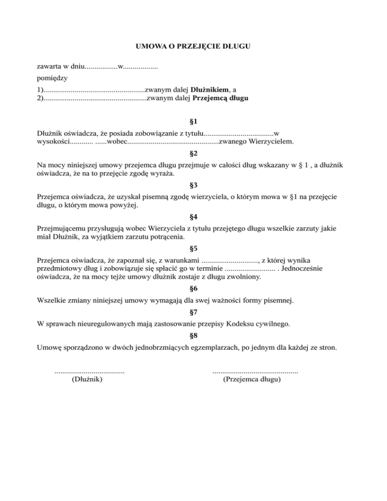 UMOWA O PRZEJĘCIE DŁUGU zawarta w dniu.................w.................. pomiędzy 1)....................................................zwanym dalej Dłużnikiem, a 2).....................................................zwanym dalej Przejemcą długu §1 Dłużnik oświadcza, że posiada zobowiązanie z tytułu....................................w wysokości............ ......wobec...............................................zwanego Wierzycielem. §2 Na mocy niniejszej umowy przejemca długu przejmuje w całości dług wskazany w § 1 , a dłużnik oświadcza, że na to przejęcie zgodę wyraża. §3 Przejemca oświadcza, że uzyskał pisemną zgodę wierzyciela, o którym mowa w §1 na przejęcie długu, o którym mowa powyżej. §4 Przejmującemu przysługują wobec Wierzyciela z tytułu przejętego długu wszelkie zarzuty jakie miał Dłużnik, za wyjątkiem zarzutu potrącenia. §5 Przejemca oświadcza, że zapoznał się, z warunkami ............................., z której wynika przedmiotowy dług i zobowiązuje się spłacić go w terminie .......................... . Jednocześnie oświadcza, że na mocy tejże umowy dłużnik zostaje z długu zwolniony. §6 Wszelkie zmiany niniejszej umowy wymagają dla swej ważności formy pisemnej. §7 W sprawach nieuregulowanych mają zastosowanie przepisy Kodeksu cywilnego. §8 Umowę sporządzono w dwóch jednobrzmiących egzemplarzach, po jednym dla każdej ze stron. .................................... (Dłużnik) ............................................ (Przejemca długu)