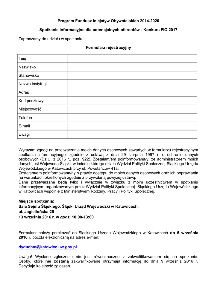 Program Fundusz Inicjatyw Obywatelskich 2014-2020 Spotkanie informacyjne dla potencjalnych oferentów - Konkurs FIO 2017 Zapraszamy do udziału w spotkaniu Formularz rejestracyjny Imię Nazwisko Stanowisko Nazwa instytucji Adres Kod pocztowy Miejscowość Telefon E-mail Uwagi Wyrażam zgodę na przetwarzanie moich danych osobowych zawartych w formularzu rejestracyjnym spotkania informacyjnego, zgodnie z ustawą z dnia 29 sierpnia 1997 r. o ochronie danych osobowych (Dz.U. z 2016 r., poz. 922). Zostałam/em poinformowana/y, że administratorem moich danych jest Wojewoda Śląski, w imieniu którego działa Wydział Polityki Społecznej Śląskiego Urzędu Wojewódzkiego w Katowicach przy ul. Powstańców 41a. Zostałam/em poinformowana/ny o prawie dostępu do moich danych osobowych oraz ich poprawiania na warunkach określonych zgodnie z przywołaną powyżej ustawą. Dane przetwarzane będą tylko i wyłącznie w związku z moim uczestnictwem w spotkaniu informacyjnym organizowanym przez Wydział Polityki Społecznej Śląskiego Urzędu Wojewódzkiego w Katowicach wspólnie z Ministerstwem Rodziny, Pracy i Polityki Społecznej. Miejsce spotkania: Sala Sejmu Śląskiego, Śląski Urząd Wojewódzki w Katowicach, ul. Jagiellońska 25 13 września 2016 r. w godz. 10:00-13:00 Formularz należy przekazać do Śląskiego Urzędu Wojewódzkiego w Katowicach do 5 września 2016 r. pocztą elektroniczną na adres e-mail: [email protected] Uwaga! Wysłane zgłoszenie nie jest równoznaczne z zakwalifikowaniem się na spotkanie. Osoby, które nie zostaną zakwalifikowane otrzymają informację do dnia 9 września 2016 r. Decyduje kolejność zgłoszeń.