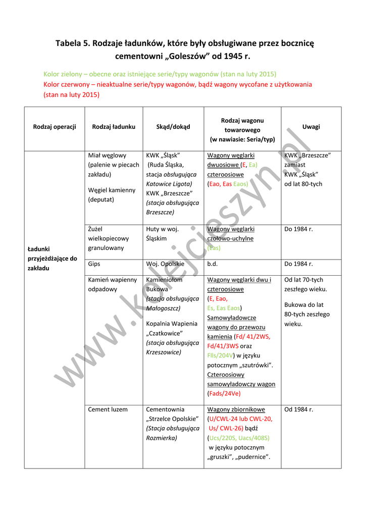 Tabela 5. Rodzaje ładunków, które były obsługiwane przez bocznicę cementowni „Goleszów” od 1945 r. Kolor zielony – obecne oraz istniejące serie/typy wagonów (stan na luty 2015) Kolor czerwony – nieaktualne serie/typy wagonów, bądź wagony wycofane z użytkowania (stan na luty 2015) Rodzaj operacji Skąd/dokąd Miał węglowy (palenie w piecach zakładu) KWK „Śląsk” (Ruda Śląska, stacja obsługująca Katowice Ligota) KWK „Brzeszcze” (stacja obsługująca Brzeszcze) Wagony węglarki dwuosiowe (E, Ea) czteroosiowe (Eao, Eas Eaos) KWK „Brzeszcze” zamiast KWK „Śląsk” od lat 80-tych Żużel wielkopiecowy granulowany Huty w woj. Śląskim Wagony węglarki czołowo-uchylne (Eas) Do 1984 r. Gips Woj. Opolskie b.d. Do 1984 r. Kamień wapienny odpadowy Kamieniołom Bukowa (stacja obsługująca Małogoszcz) Wagony węglarki dwu i czteroosiowe (E, Eao, Es, Eas Eaos) Samowyładowcze wagony do przewozu kamienia (Fd/ 41/2WS, Fd/41/3WS oraz Flls/204V) w języku potocznym „szutrówki”. Czteroosiowy samowyładowczy wagon (Fads/24Ve) Od lat 70-tych zeszłego wieku. Wagony zbiornikowe (U/CWL-24 lub CWL-20, Us/ CWL-26) bądź (Ucs/220S, Uacs/408S) w języku potocznym „gruszki”, „pudernice”. Od 1984 r. Węgiel kamienny (deputat) Ładunki przyjeżdżające do zakładu Rodzaj wagonu towarowego (w nawiasie: Seria/typ) Rodzaj ładunku Kopalnia Wapienia „Czatkowice” (stacja obsługująca Krzeszowice) Cement luzem Cementownia „Strzelce Opolskie” (Stacja obsługująca Rozmierka) Uwagi Bukowa do lat 80-tych zeszłego wieku. Rodzaj operacji Rodzaj wagonu towarowego (w nawiasie: Seria/typ) Rodzaj ładunku Skąd/dokąd Cement pakowany w workach Różni odbiorcy (indywidualni, oraz przedsiębiorstwa m.in. GS) w Polsce Wagony kryte: -dwuosiowe (G, Gs, Ggs lub Gbs, Gbkks) - czteroosiowe (Gas, Gags-t/401 K, 401Ka) Cement luzem Różni odbiorcy Wagony zbiornikowe (U/CWL-24 lub CWL-20, Us/CWL-26 bądź Ucs/220S, Uacs/408S) w języku potocznym „gruszki”, „pudernice”. Wapno palone luzem Zakłady Chemiczne w Policach (stacja obsługująca Jasienica) Wagony zbiornikowe (U/CWL-24, Us/ CWL-26 bądź (Ucs/206S, Ucs/220S, Uacs/408S) w języku potocznym „gruszki”, „pudernice”. Wapno palone w kawałkach Różni odbiorcy (np. w stacji Otwock) Wagony węglarki czteroosiowe (Eaos) zabezpieczone oponami wagonowymi. Wyjeżdżało z zakładu Opracował: Błażej Forjasz Wersja 4, luty 2015, Koleje Śląska Cieszyńskiego Uwagi Od 1984 roku.