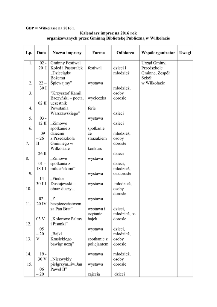 Kalendarz imprez na 2016 rok organizowanych przez Gminną