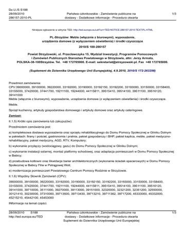Dz.U./S S188 28/09/2010 286157-2010-PL Państwa członkowskie - Zamówienie publiczne na dostawy - Dodatkowe informacje - Procedura otwarta 1/3 Niniejsze ogłoszenie w witrynie TED: http://ted.europa.eu/udl?uri=TED:NOTICE:286157-2010:TEXT:PL:HTML PL-Strzyżów: Meble (włącznie z biurowymi), wyposażenie, urządzenia domowe (z wyłączeniem oświetlenia) i środki czyszczące 2010/S 188-286157 Powiat Strzyżowski, ul. Przecławczyka 15, Wydział Inwestycji, Programów Pomocowych i Zamówień Publicznych Starostwa Powiatowego w Strzyżowie, attn: Jerzy Armata, POLSKA-38-100Strzyżów. Tel. +48 172765000. E-mail: [email protected]. Fax +48 172765000. (Suplement do Dziennika Urzędowego Unii Europejskiej, 4.9.2010, 2010/S 172-263298) Przedmiot zamówienia: CPV:39000000, 39100000, 39220000, 33192000, 33190000, 33192150, 33192200, 33193000, 33150000, 33158400, 33155000, 37420000, 37441700, 19211100, 19244000, 44115811, 39515410, 39514100, 39511100, 39516120, 39141000 Meble (włącznie z biurowymi), wyposażenie, urządzenia domowe (z wyłączeniem oświetlenia) i środki czyszczące. Meble. Sprzęt kuchenny, artykuły gospodarstwa domowego i artykuły domowe oraz artykuły cateringowe. Zamiast: II.1.5) Krótki opis zamówienia lub zakupu(ów): Przedmiotem zamówienia jest: a) kompleksowa dostawa wyposażenia oraz sprzętu rehabilitacyjnego do Domu Pomocy Społecznej w Gliniku Dolnym w pakietach: firany i pościel, gastronomia i pralnia, pakiet gospodarczy i BHP, pakiet kaplica, meble, pakiet medycznorehabilitacyjny, pakiet medyczny, AGD, RTV, Komputery; b) wykonanie przyłączy (wodociągowy, gazu) do Domu Pomocy Społecznej w Gliniku Dolnym; c) wykonanie instalacji solarnej, montaż platformy schodowej, oraz adaptacja pomieszczeń w Domu Pomocy Społecznej w Babicy; d) przebudowa kotłowni oraz likwidacja barier architektonicznych (wykonanie ścieżek spacerowych) w Domu Pomocy Społecznej w Babicy Filia w Pstrągowej Woli; e) modernizacja pomieszczeń Powiatowego Centrum Pomocy Rodzinie w Strzyżowie. II.1.6) Wspólny Słownik Zamówień (CPV): 39000000, 39100000, 39220000, 33192000, 33190000, 33192150, 33192200, 33193000, 33150000, 33158400, 33155000, 37420000, 37441700, 19211100, 19244000, 44115811, 39515410, 39514100, 39511100, 39516120, 39141000, 39710000, 35111000, 39270000, 39113000, 39151000, 32320000, 32321200, 32351200, 32550000, 30121410, 30230000, 37310000, 39713500, 39713430, 39713210, 39711362, 39717200, 45333000, 45332000, 45215210, 45442100, 45453000 INformacje na temat części. 28/09/2010 S188 http://ted.europa.eu/TED Państwa członkowskie - Zamówienie publiczne na dostawy - Dodatkowe informacje - Procedura otwarta Suplement do Dziennika Urzędowego Unii Europejskiej 1/3 Dz.U./S S188 28/09/2010 286157-2010-PL Państwa członkowskie - Zamówienie publiczne na dostawy - Dodatkowe informacje - Procedura otwarta 2/3 Część nr 1 Nazwa Pakiet Firany i pościel. 1) Krótki opis: Zamówienie dotyczy dostawy tkanin zasłonowych, firankowych, pościeli, poduszek, kocy, narzut, ręczników, żaluzji, rolet, moskitierów oraz karniszy. 2) Wspólny słownik zamówień (CPV): 19211100, 19244000, 44115811, 39515410, 39514100, 39511100, 39516120 III.1.1) Wymagane wadia i gwarancje: a) Część I – Wyposażenie DPS W Gliniku Dolnym – Pakiet Firany i pościel w kwocie 2 000,00 PLN Powinno być: II.1.5) Krótki opis zamówienia lub zakupu(ów): Przedmiotem zamówienia jest: a) kompleksowa dostawa wyposażenia oraz sprzętu rehabilitacyjnego do Domu Pomocy Społecznej w Gliniku Dolnym w pakietach: wystrój okien, pościele, aranżacja wnętrz; gastronomia i pralnia; pakiet gospodarczy i BHP; pakiet kaplica; meble; pakiet medyczno-rehabilitacyjny; pakiet medyczny; AGD, RTV, Komputery; b) wykonanie przyłączy (wodociągowy, gazu) do Domu Pomocy Społecznej w Gliniku Dolnym; c) wykonanie instalacji solarnej, montaż platformy schodowej, oraz adaptacja pomieszczeń w Domu Pomocy Społecznej w Babicy; d) przebudowa kotłowni oraz likwidacja barier architektonicznych (wykonanie ścieżek spacerowych) w Domu Pomocy Społecznej w Babicy Filia w Pstrągowej Woli; e) modernizacja pomieszczeń Powiatowego Centrum Pomocy Rodzinie w Strzyżowie. II.1.6) Wspólny Słownik Zamówień (CPV): 39000000, 39100000, 39220000, 33192000, 33190000, 33192150, 33192200, 33193000, 33150000, 33158400, 33155000, 37420000, 37441700, 19211100, 19244000, 44115811, 39515410, 39514100, 39511100, 39516120, 39141000, 39710000, 35111000, 39270000, 39113000, 39151000, 32320000, 32321200, 32351200, 32550000, 30121410, 30230000, 37310000, 39713500, 39713430, 39713210, 39711362, 39717200, 45333000, 45332000, 45215210, 45442100, 45453000, 30193800, 30192170, 30195920, 39298300, 39298900, 39531000, 39532000, 39299300 Informacje na temat części. Część nr 1 Nazwa Pakiet Wystrój wnętrz, pościele, aranżacja wnętrz. 1) Krótki opis: Zamówienie dotyczy dostawy tkanin zasłonowych, firankowych, pościeli, poduszek, kocy, narzut, ręczników, żaluzji, rolet, moskitierów, karniszy, aranżacji wnętrz (w tym przedmiotów dekoracyjnych, dywanów, luster), tabliczek ogłoszeniowych, oznakowania drzwi. 2) Wspólny słownik zamówień (CPV): 19211100, 19244000, 44115811, 39515410, 39514100, 39511100, 39516120, 30193800, 30192170, 30195920, 39298300, 39298900, 39531000, 39532000, 39299300 28/09/2010 S188 http://ted.europa.eu/TED Państwa członkowskie - Zamówienie publiczne na dostawy - Dodatkowe informacje - Procedura otwarta Suplement do Dziennika Urzędowego Unii Europejskiej 2/3 Dz.U./S S188 28/09/2010 286157-2010-PL Państwa członkowskie - Zamówienie publiczne na dostawy - Dodatkowe informacje - Procedura otwarta 3/3 III.1.1) Wymagane wadia i gwarancje: a) Część I – Wyposażenie DPS W Gliniku Dolnym – Pakiet Wystrój okien, pościele, aranżacja wnętrz w kwocie 2 000,00 PLN. 28/09/2010 S188 http://ted.europa.eu/TED Państwa członkowskie - Zamówienie publiczne na dostawy - Dodatkowe informacje - Procedura otwar