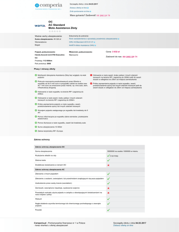 Szczegóły oferty z dnia 04.03.2017 Zobacz ofertę on-line Zrób porównanie on-line Masz pytania? Zadzwoń! 22 395 52 72 OC AC Standard Moto Assistance Złoty Ważne cechy ubezpieczenia: Dokumenty do pobrania: Suma ubezpieczenia: 45 324 zł Wzór zawiadomienia o sprzedaży przedmiotu ubezpieczenia Wprowadzona OWU ACStandard 2014.01.01 Bagaż WARTA Moto Assistance OWU Pojazd, podsumowanie: Właściciel, podsumowanie: Honda Accord 2.2i-CTDi Executive Mężczyzna Cena: 3 632 zł Zadzwoń do nas: 22 395 52 71 lea Przebieg: 112 000km Rok produkcji: 2008 Plusy i minusy oferty Możliwość dokupienia Assistance Złoty bez względu na wiek pojazdu Pokrycie roszczenia poszkodowanych przez Klienta w wypadku aż do 5 mln euro w przypadku szkód na osobie oraz do 1 mln euro za zniszczone przez mienie, np. inne auto, dom, infrastrukturę drogową Holowanie w razie awarii, braku paliwa i innych zdarzeń losowych na terenie RP i zagranicą do 200km jeśli do awarii doszło w odległości do 25km od miejsca zamieszkania Próba usprawnienia pojazdu w razie wypadku, awarii, przedziurawienia opony lub innych zdarzeń losowych jeśli do awarii doszło w odległości do 25km od miejsca zamieszkania Holowanie w razie wypadku na terenie RP i zagranicą do 200km Holowanie w razie awarii, braku paliwa i innych zdarzeń losowych na terenie RP i zagranicą do 200km Próba usprawnienia pojazdu w razie wypadku, awarii, przedziurawienia opony lub innych zdarzeń losowych Wynajem pojazdu zastępczego po wypadku lub kradzieży do 5 dni Pomoc informacyjna po wypadku (dane serwisów, przekazanie wiadomości) Pomoc tłumacza w razie wypadku, awarii lub kradzieży auta Suma ubezpieczenia 10 000zł Zakres terytorialny RP i Europa Zakres ochrony Zakres ochrony ubezpieczenia OC Suma ubezpieczenia Rozłożenie składki na raty 5000000 na osobie 1000000 w mieniu 2 lub 4raty Zielona karta Dodatkowe świadczenia w ramach OC Zakres ochrony ubezpieczenia AC Zderzenie z innym pojazdem Zderzenie z osobami, zwierzętami, lub przedmiotami znajdującymi się poza pojazdem Uszkodzenie przez osoby trzecie (wandalizm) Zamieszki, wewnętrzne niepokoje, wydarzenia wojenne Powstałych wskutek użycia pojazdu w związku z obowiązującymi świadczeniami na rzecz wojska i policji Wybuch Nagłe działanie czynnika termicznego lub chemicznego pochodzącego z zewnątrz pojazdu Powódź Comperia.pl - Porównywarka finansowa nr 1 w Polsce - teraz również z ofertą ubezpieczeń Szczegóły oferty z dnia 04.03.2017 Zobacz ofertę on-line Szczegóły oferty z dnia 04.03.2017 Zobacz ofertę on-line Zrób porównanie on-line Masz pytania? Zadzwoń! 22 395 52 72 Lawina Osunięcie i zapadanie się ziemi Grad Uderzenie pioruna Huragan Trzęsienie ziemi Kradzież pojazdu opcja dodatkowa Rabunek/Rozbój opcja dodatkowa Upadek statku powietrznego Pożar Zakres ochrony Assistance Suma ubezpieczenia 10000 zł. Zakres terytorialny Polska i Europa Wiek pojazdu do którego można wykupić ubezpieczenie bez limitu Rodzaj pojazdu na który można wykupić ubezpieczenie samochód osobowy, ciężarowo-osobowe, sam.specjalne kempingowe, przyczepy specjalne kempingowe oraz przyczepy lekkie (bez świadczenia pojazdu zastępczego) motocykle Ograniczenia ze względu na sposób użytkowania pojazdu (np. taxi, nauka jazdy, rent a car) nie są objęte ubezpieczeniem Opcje zawarcia z OC i/lub AC Usprawnienie pojazdu na miejscu zdarzenia Pomoc w razie awarii Pomoc w razie wypadku Limit odległości od miejsca zamieszkania Awaria, kradzież czy inne zdarzenia losowe –powyżej 25 km od miejsca zamieszkania Miejsce holowania Polska 200 km/ Europa 200 km (jeśli do zdarzenia doszło w odległości ponad 25 km od miejsca zamieszkania) Samochód zastępczy Do 5 dni ( po wypadku lub kradzieży) Złomowanie pojazdu Parkowanie pojazdu Transport zastępczy/przewóz osób Do 2 dób Do miejsca bliższego miejscu zdarzenia Nocleg/zakwaterowanie Dodatkowe informacje pomoc informacyjna po wypadku, pomoc tłumacza za granicą, Terytorium ochrony Terytorium ochrony ubezpieczenia AC Kraje Unii Europejskiej Algeria Albania Libia Maroko Mołdawia Białoruś Comperia.pl - Porównywarka finansowa nr 1 w Polsce - teraz również z ofertą ubezpieczeń Szczegóły oferty z dnia 04.03.2017 Zobacz ofertę on-line Szczegóły oferty z dnia 04.03.2017 Zobacz ofertę on-line Zrób porównanie on-line Masz pytania? Zadzwoń! 22 395 52 72 Rosja (część europejska) Tylko w części europejskiej Czarnogóra Serbia Bośnia i Hercegowina Tunezja Iran Turcja Tylko w części europejskiej Izrael Ukraina Wyłączenia Wyłączenia ubezpieczenia AC Udział własny w szkodzie Możliwość wprowadzenia Amortyzacja za części Możliwość zniesienia Rodzaj stacji naprawczej (ze względu na metodę naprawy) Faktura- serwis Kosztorys- stacja naprawcza Rodzaj używanych części do naprawy Faktura- części nowe oryginalne. Kosztoryszamienniki Okres eksploatacji pojazdu w jakim można wykupić polisę AutoCasco Brak limitu Minimalna szkoda (franszyza integralna) Brak Szkoda została spowodowana wskutek rażącego niedbalstwa Kierowanie pojazdem w stanie nietrzeźwości, po zażyciu alkoholu, środków odurzających, substancji psychotropowych, lub jego pochodnych Kierujący pojazdem nie posiadał uprawnień do prowadzenia pojazdu Sprawca zbiegł lub oddalił się z miejsca zdarzenia Pojazd nie miał ważnego przeglądu technicznego lub nie jest dopuszczony do ruchu Nie wypłaci, jeśli stan techniczny miał wpływ bezpośrednio na powstanie i rozmiar szkody. Przywłaszczenie pojazdu Kradzież wyposażenia dodatkowego Wypłaci, jeżeli zostało doubezpieczone wyposażenie dodatkowe Uszkodzenie wyposażenia dodatkowego pojazdu Wypłaci, jeżeli zostało doubezpieczone wyposażenie dodatkowe Wada fabryczna pojazdu, jego naprawa, użytkowanie w sposób niezgodny z jego przeznaczeniem Uszkodzenie lub zniszczenie ogumienia Konsumpcja sumy ubezpieczenia Możliwość zniesienia Szyby Wypłaci (możliwość dokupienia pakie