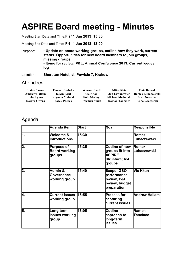 ASPIRE Board meeting - Minutes Meeting Start Date and Time: Fri 11 Jan 2013 15:30 Meeting End Date and Time: Fri 11 Jan 2013 18:00 Purpose: • Update on board working groups, outline how they work, current status. Opportunities for new board members to join groups, missing groups. • Items for review: P&L, Annual Conference 2013, Current issues log Location: Sheraton Hotel, ul. Powisle 7, Krakow Attendees Elaine Barnes Andrew Hallam John Lyons Darren Owens Tomasz Berbeka Kevin Kent Szymon Malecki Jacek Pączek Werner Biebl Vic Khan Eoin McCoy Przemek Siuda Mike Dietz Piotr Dziwok Jan Lewanowicz Romek Lubaczewski Michael Mcdonald Scott Newman Ramon Tancinco Kuba Więcaszek Agenda: Agenda item Start Goal Responsible 1. Welcome & Introductions 15:30 Romek Lubaczewski 2. Purpose of 15:35 Board working groups Outline of how Romek groups fit into Lubaczewski ASPIRE Structure; list groups 3. Admin & 15:40 Governance working group Scope: GSO Vic Khan performance review, P&L review, budget preparation 4. Current issues 15:55 working group Process for Andrew Hallam capturing current issues 5. Long term 16:05 issues working group Outline approach to long-term issues Ramon Tancinco 6. Annual 16:15 Conference working group Outline scope of group 7. Beyond 16:20 Krakow working group Update and Romek recommendatio Lubaczewski ns 8. Market 16:30 information working group Outline info that can be collected 9. Break 16:45 10. P&L 16:55 Run through Romek P&L, identify Lubaczewski underspend, potential surplus, questions from new members 11. Annual conference 17:05 Outline project; Andrew Hallam Seek approval to go ahead with project as scoped 12. Current issues 17:20 log Run through: 1. Jan Feedback from Lewanowicz Q4 2012 centre heads meeting, recommendatio ns resulting from meeting; 2. Current issues log 13. AOB & Close New members Romek approval; Lubaczewski request from audit committee; recap action items from the meeting; confirm any decision items; next meeting: groups not covered, 17:45 Andrew Hallam Piotr Dziwok Andrew Hallam missing groups, AOB let Andy know, date in 4 weeks Action Summary: Action Due Status Responsible 1. Conduct next Fri 15 Feb 2013 Open GSO performance review. Present at next board meeting Elaine Barnes, Tomasz Berbeka, Andrew Hallam, Vic Khan, Romek Lubaczewski 2. Prepare 20132014 Annual Budget Proposal Elaine Barnes, Tomasz Berbeka, Andrew Hallam, Vic Khan, Romek Lubaczewski 3. Meeting/call : Fri 1 Feb 2013 Governance & Admin group Open Elaine Barnes, Tomasz Berbeka, Andrew Hallam, Vic Khan, Romek Lubaczewski 4. Call/meeting : Long term issues group Fri 1 Feb 2013 Open Werner Biebl, Piotr Dziwok, Andrew Hallam, Szymon Malecki, Ramon Tancinco 5. Call/meeting : Fri 1 Feb 2013 Beyond Krakow group to review projects Open Andrew Hallam, Vic Khan, Romek Lubaczewski, Darren Owens , Jacek Pączek, Przemek Siuda 6. Call/meeting : Fri 1 Feb 2013 Market Information group to review what info we want to collect, in what form, Open Tomasz Berbeka, Piotr Dziwok, Jan Lewanowicz , John Lyons Fri 15 Feb 2013 Open how 7. Call/meeting : Fri 1 Feb 2013 Annual Conference group to review next steps Open Elaine Barnes, Andrew Hallam, Vic Khan, Romek Lubaczewski, Jacek Pączek 8. Review current Fri 1 Feb 2013 issues log and make recommendatio ns how each issue can be addressed Open Kevin Kent, Jan Lewanowicz , Michael Mcdonald 9. Put together Thu 31 Jan proposal for 2013 Employment Law Task Force Open Kevin Kent, Vic Khan, Jan Lewanowicz 10. Call/meeting : Fri 1 Feb 2013 Open Forum Expert Groups working group Open Werner Biebl, Jan Lewanowicz , Eoin McCoy , Scott Newman 11. Call/meeting : Fri 1 Feb 2013 Website & Comms working group Open Andrew Hallam, Eoin McCoy 12. Call/meeting : Fri 1 Feb 2013 Associate Members working group Open Andrew Hallam, Jan Lewanowicz , Darren Owens 13. Confirm date Fri 18 Jan 2013 Open for next board meeting Andrew Hallam Attachment EBM January - Slide deck.pdf Full slide deck for the meeting Apologies: Mike Dietz, Scott Newman, Kuba Więcaszek See slides 5-6. • Board working groups are the primary vehicle for board members to add value. • 9 groups. • We are looking for new board members to join groups, so that each group will have a min. 2 board members + representation from the general secretary's office. See slides 7-13 • Members: Vic Khan, Romek Lubaczewski • New members appointed: Elaine Barnes, Tomasz Berbeka • GSO: Andrew Hallam Action! Conduct next GSO performance review. Present at next board meeting Due date: Fri 15 Feb 2013 Status: Open Action assigned to: Elaine Barnes Tomasz Berbeka Andrew Hallam Vic Khan Romek Lubaczewski Vic Khan Romek Lubaczewski Action! Prepare 2013-2014 Annual Budget Proposal Due date: Fri 15 Feb 2013 Status: Open Action assigned to: Elaine Barnes Tomasz Berbeka Andrew Hallam Action! Meeting/call : Governance & Admin group Due date: Fri 1 Feb 2013 Status: Open Action assigned to: Elaine Barnes Tomasz Berbeka Andrew Hallam Vic Khan Romek Lubaczewski Szymon Malecki Ramon Tancinco See Slides 14-16 • Group members: Kevin Kent; • New member appointed: Mike McDonald • GSO: Jan Lewanowicz • NB. This group still needs new members See Slides 17-20 • Group members: Ramon Tancinco, Piotr Dziwok; • New members appointed: Werner Biebl, Szymon Malecki • GSO: Andrew Hallam Action! Call/meeting : Long term issues group Due date: Fri 1 Feb 2013 Status: Open Action assigned to: Werner Biebl Piotr Dziwok Andrew Hallam See Slides 21-22 • Group members: Romek Lubaczewski, Jacek Pączek • New members appointed: Elaine Barnes, Vic Khan • GSO: Andrew Hallam See Slides: 23-24 • Group members: Jacek Paczek, Vic Khan, Romek Lubaczewski • New members appointed: Przemek Siuda, Darren Owens • GSO: Andrew Hallam • Proposal approved Action! Call/meeting : Beyond Krakow group to review projects Due date: Fri 1 Feb 2013 Status: Open Action assigned to: Andrew Hallam Przemek Siuda Vic Khan Romek Lubaczewski Darren Owens Jacek Pąc